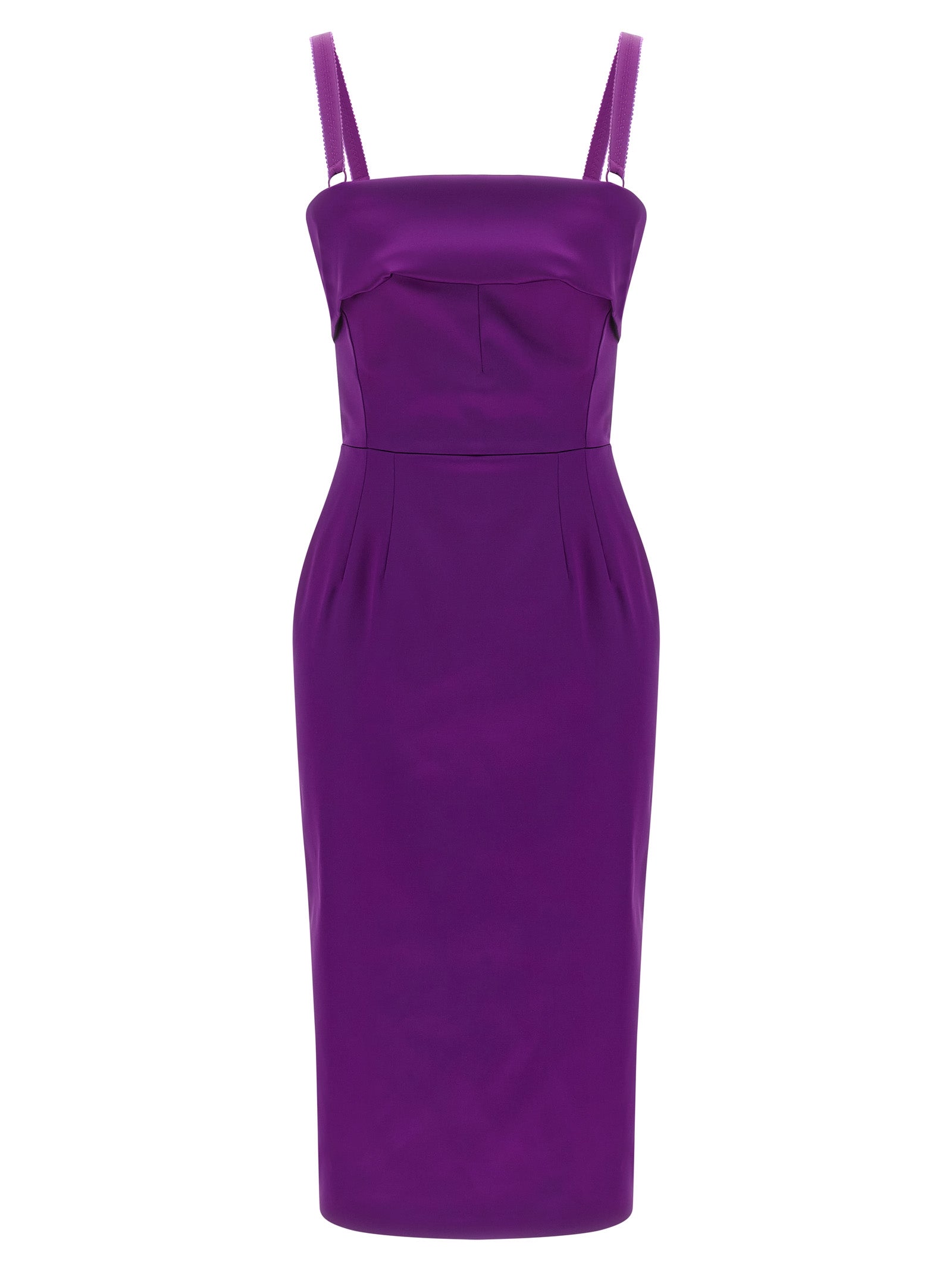 Satin midi dress, turned-up square neckline, adjustable straps, boned bodice, sheath skirt with slit surmounted, back zip closure, silk lining.