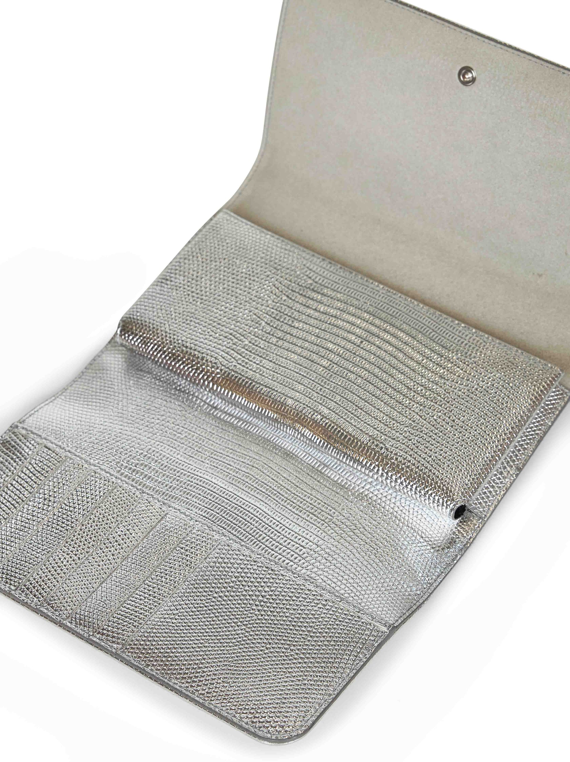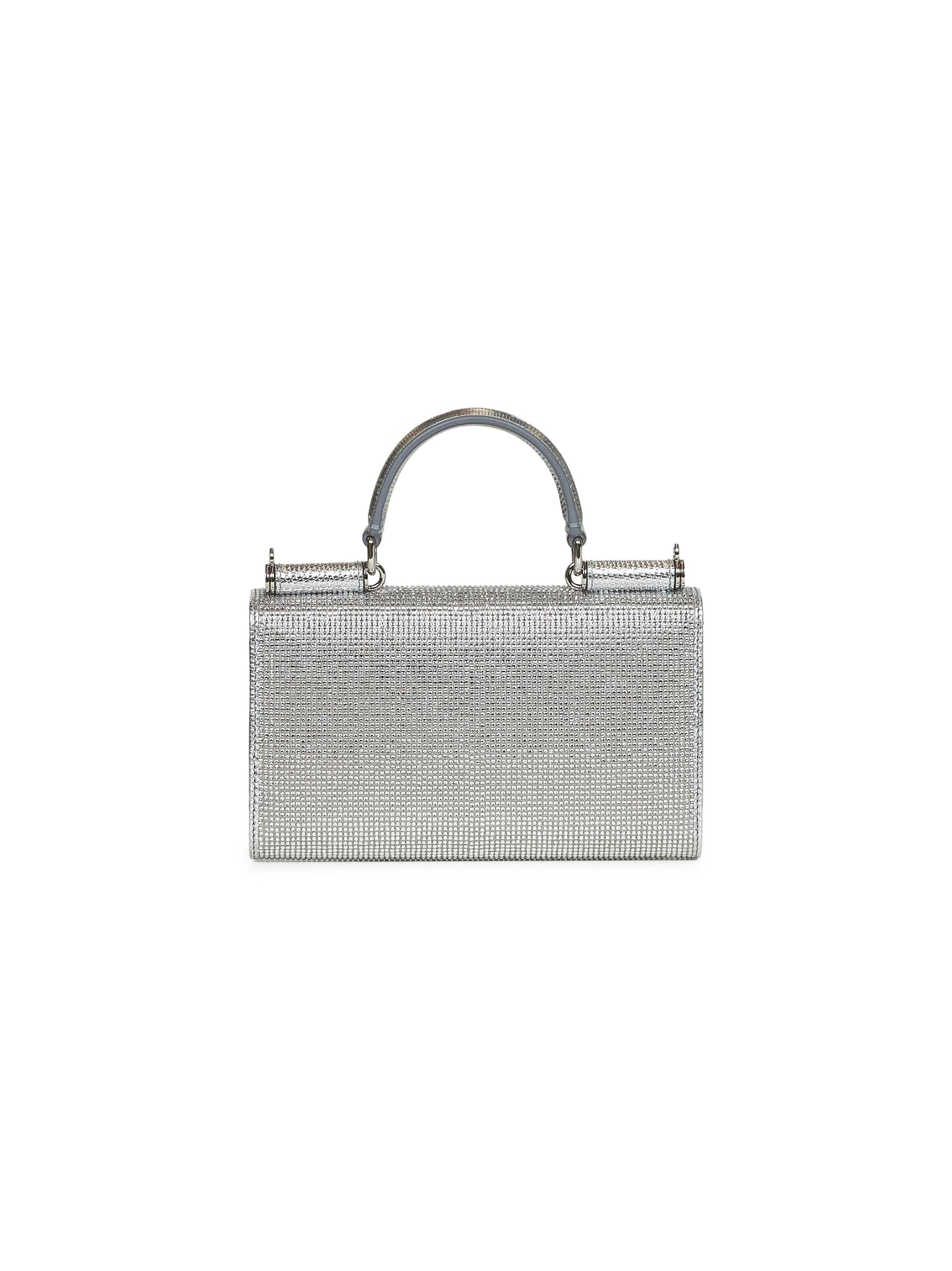 •Foldover-top with magnetic fastening •Top laminated iguana-print calf leather handle; detachable metal chain shoulder strap •Metal logo tag at front •Interior: phone pocket, eight credit card slots, one flat pocket; laminated iguana-print calf leather interior •Palladium-toned metal hardware •All-over rhinestone embellished satin design •20 X 14 X 4 cm; shoulder strap: 113 cm •Silver color •60% Viscose, 30% Silk 10% Calf Leather •Made in Italy