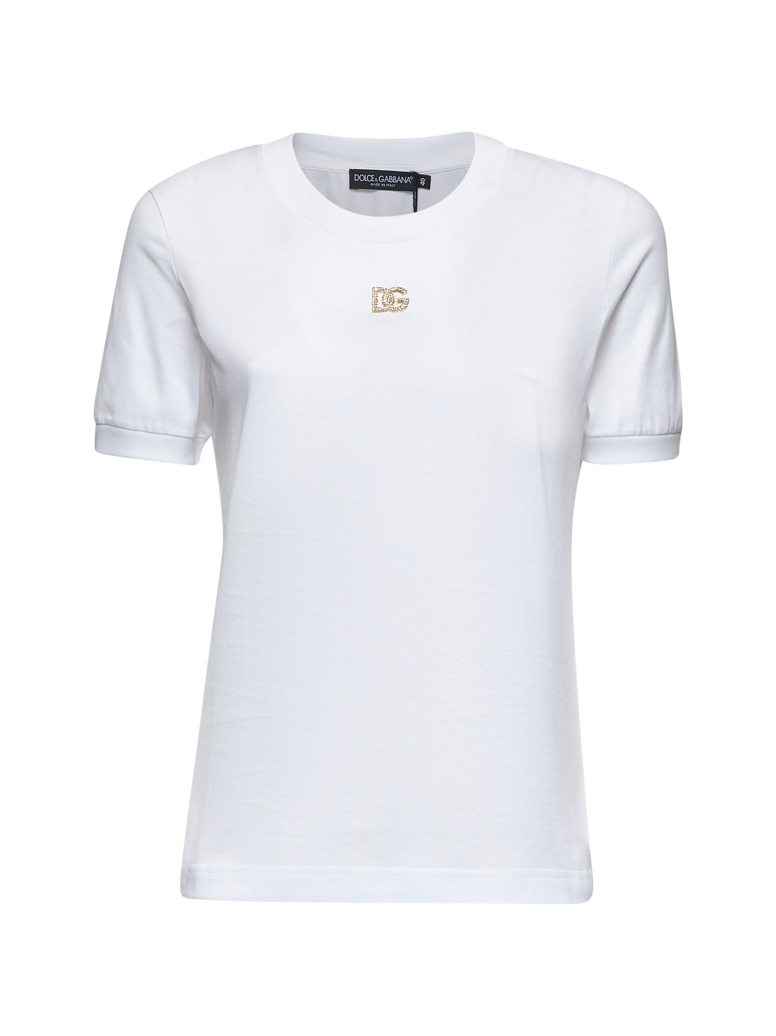 •Ribbed crewneck•Short sleeves, ribbed cuffs•Rhinestones embellished gold-toned metal DG logo plate at front•Fitted fit•White color•100% Cotton•Made in Italy