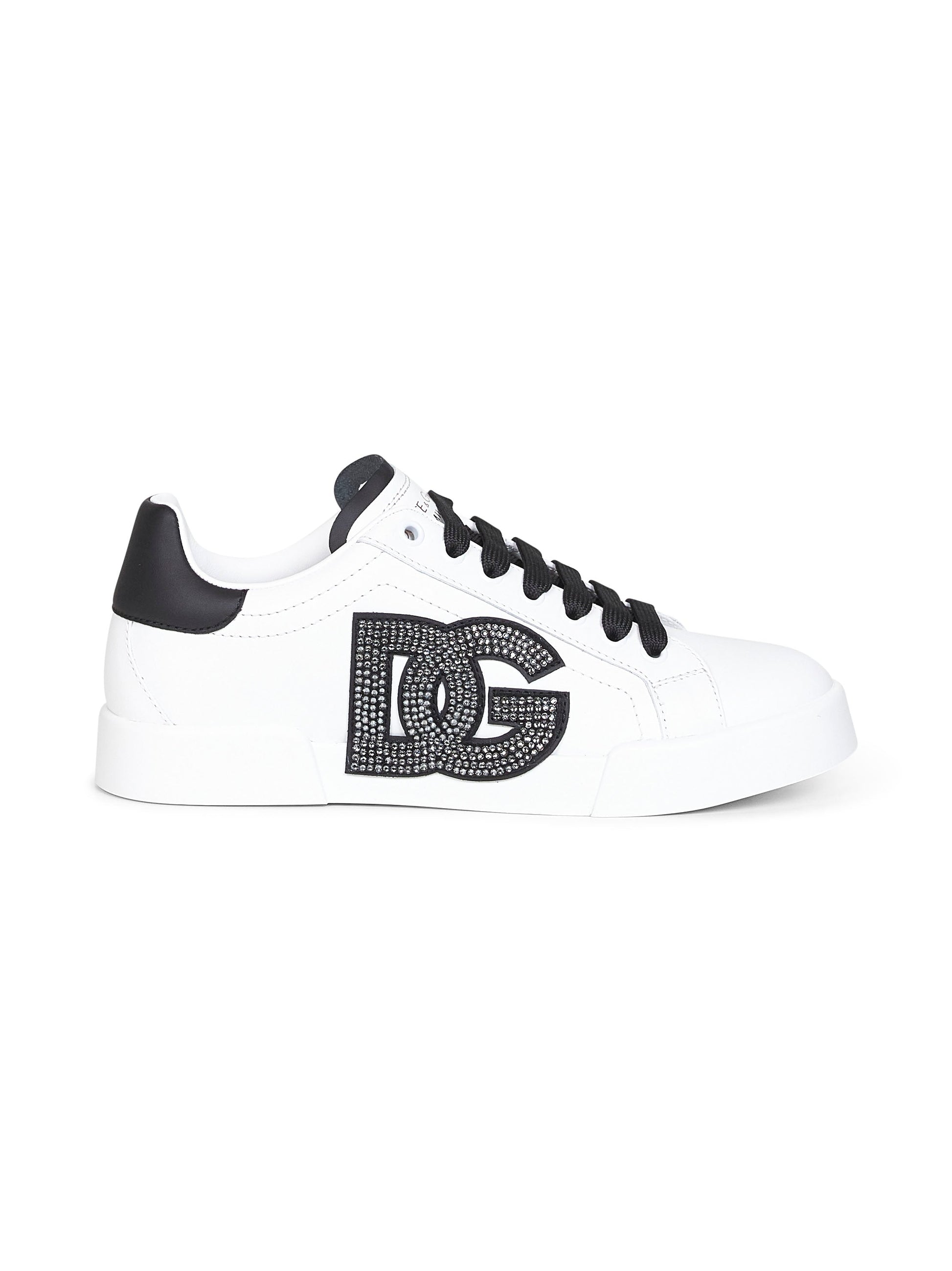 •Front lace-up fastening •Gold logo at tongue; contrasting trim at tongue •Black leather insert at back •Calf leather upper with black rhinestone-embellished DG patch at side •Leather-wrapped latex footbed with label •Felt insole •EVA sole •Sole height: 15mm •White color •100% Calf Leather •Made in Italy