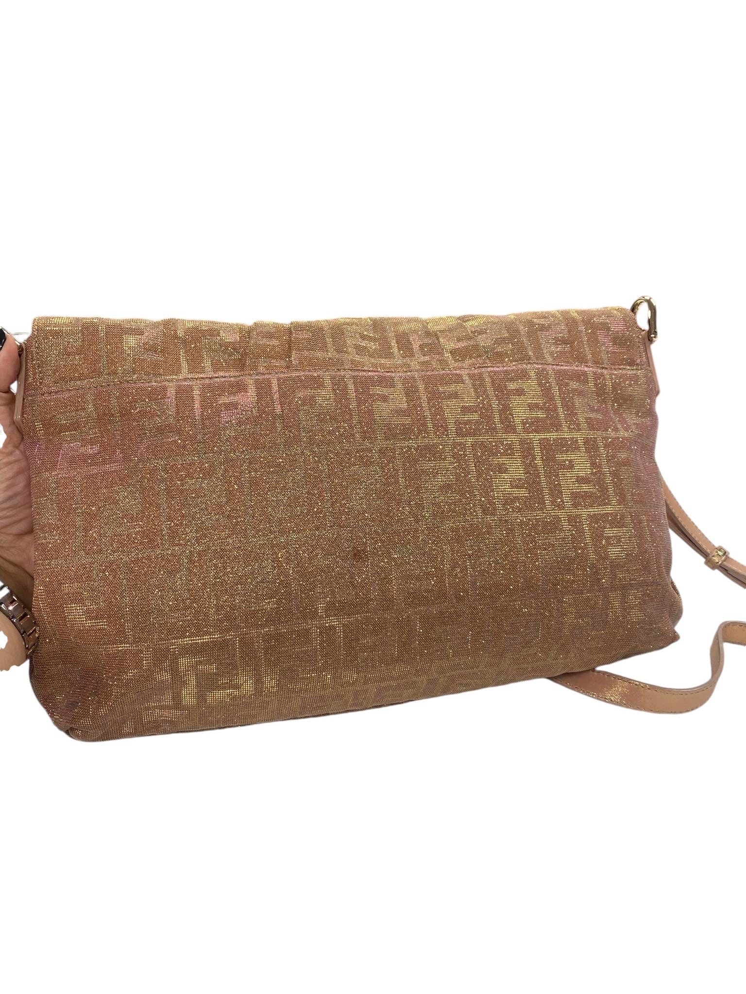 This FENDI Arancio Metallic Lurex Mia Zucca Large Flap Shoulder Bag is a standout piece in excellent condition, with small scratches on the hardware and minor stains on the back and inside.