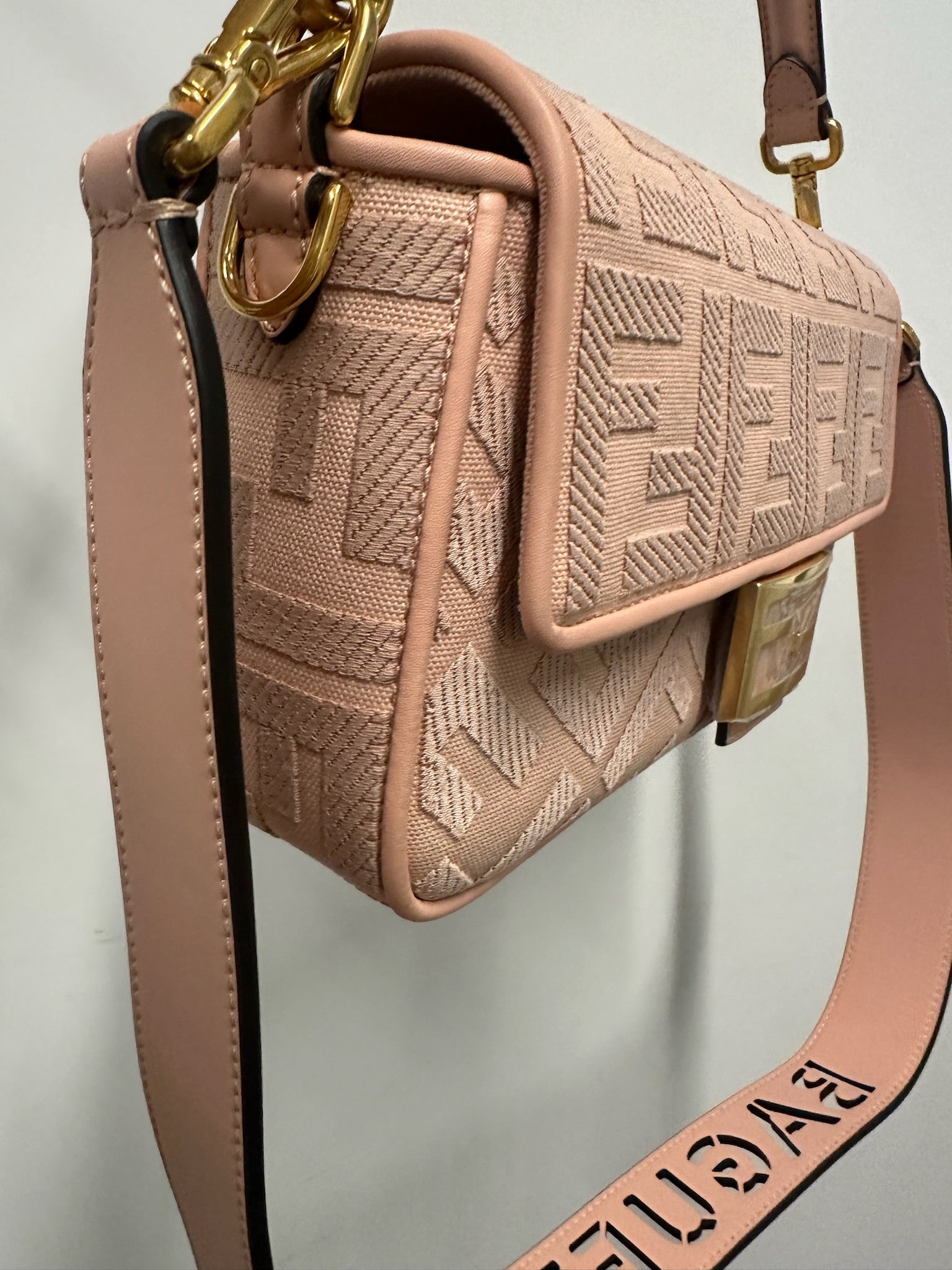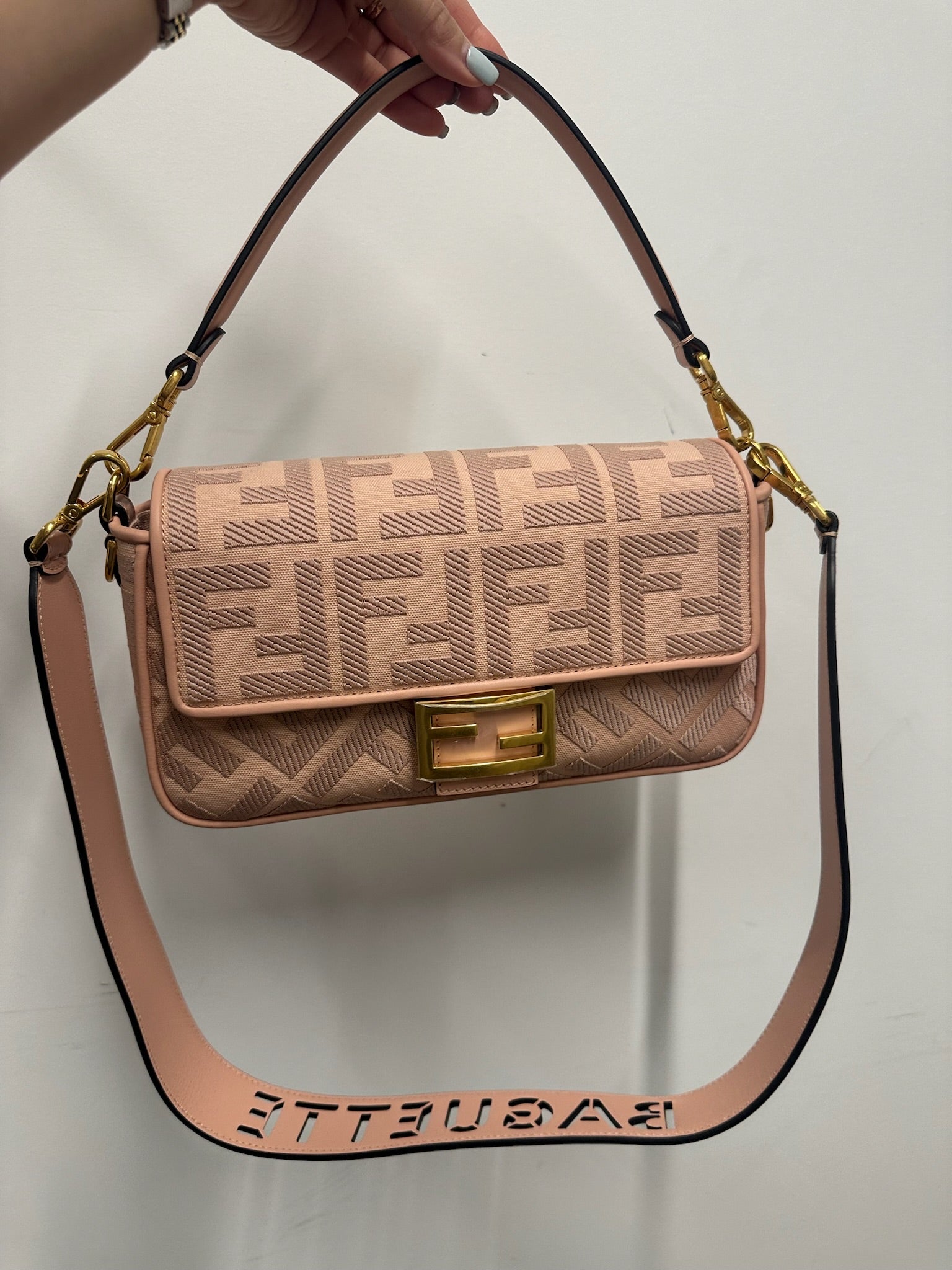 Add a touch of luxury to your style with the FENDI Baby Pink Vitello King FF Medium Baguette. The gold toned hardware adds a subtle shine to this gorgeous bag, making it a statement piece for any outfit. Elevate your fashion game and turn heads with this stunning Italian made handbag. Comes with dustbag, additional strap, .
