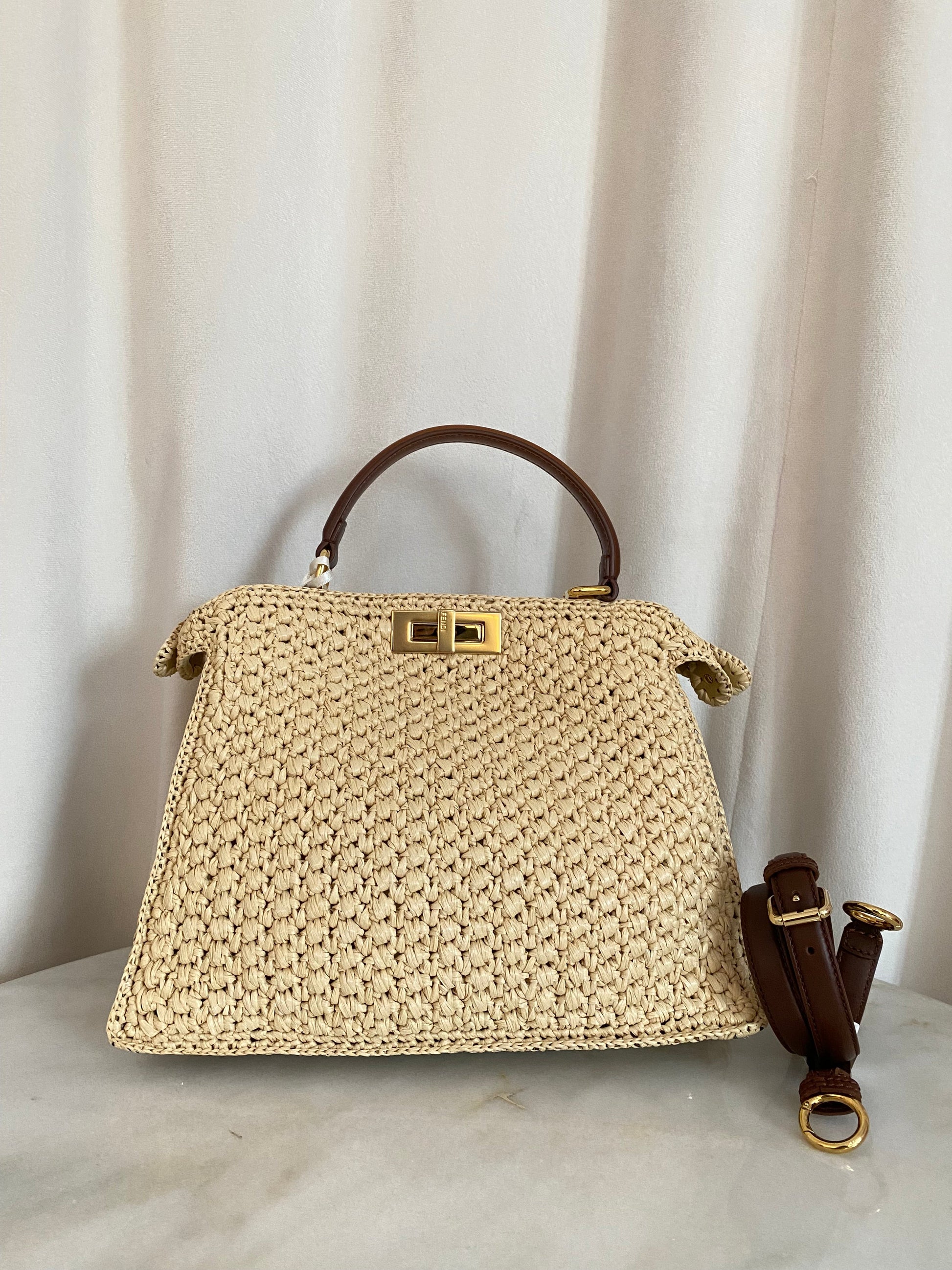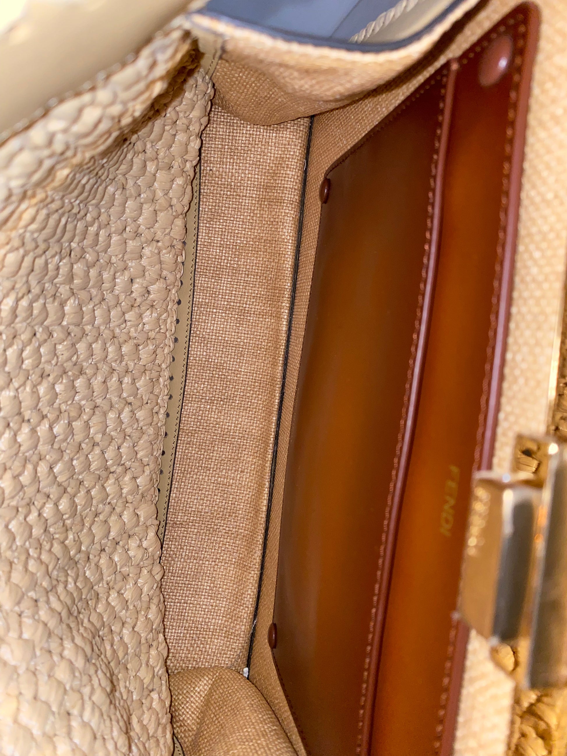 Fendi Beige Raffia Peekaboo I See U Top Handle Bag W/ Strap