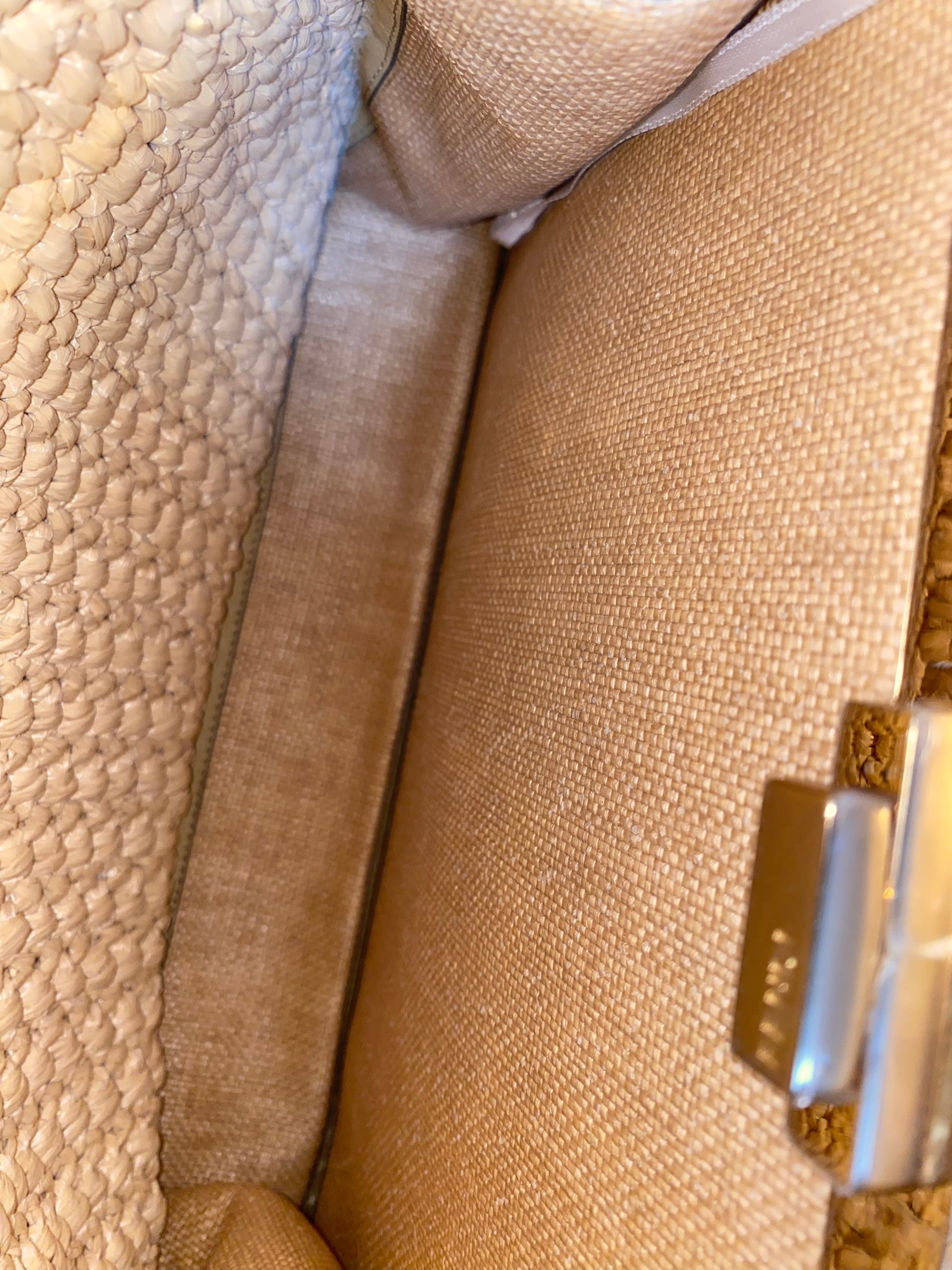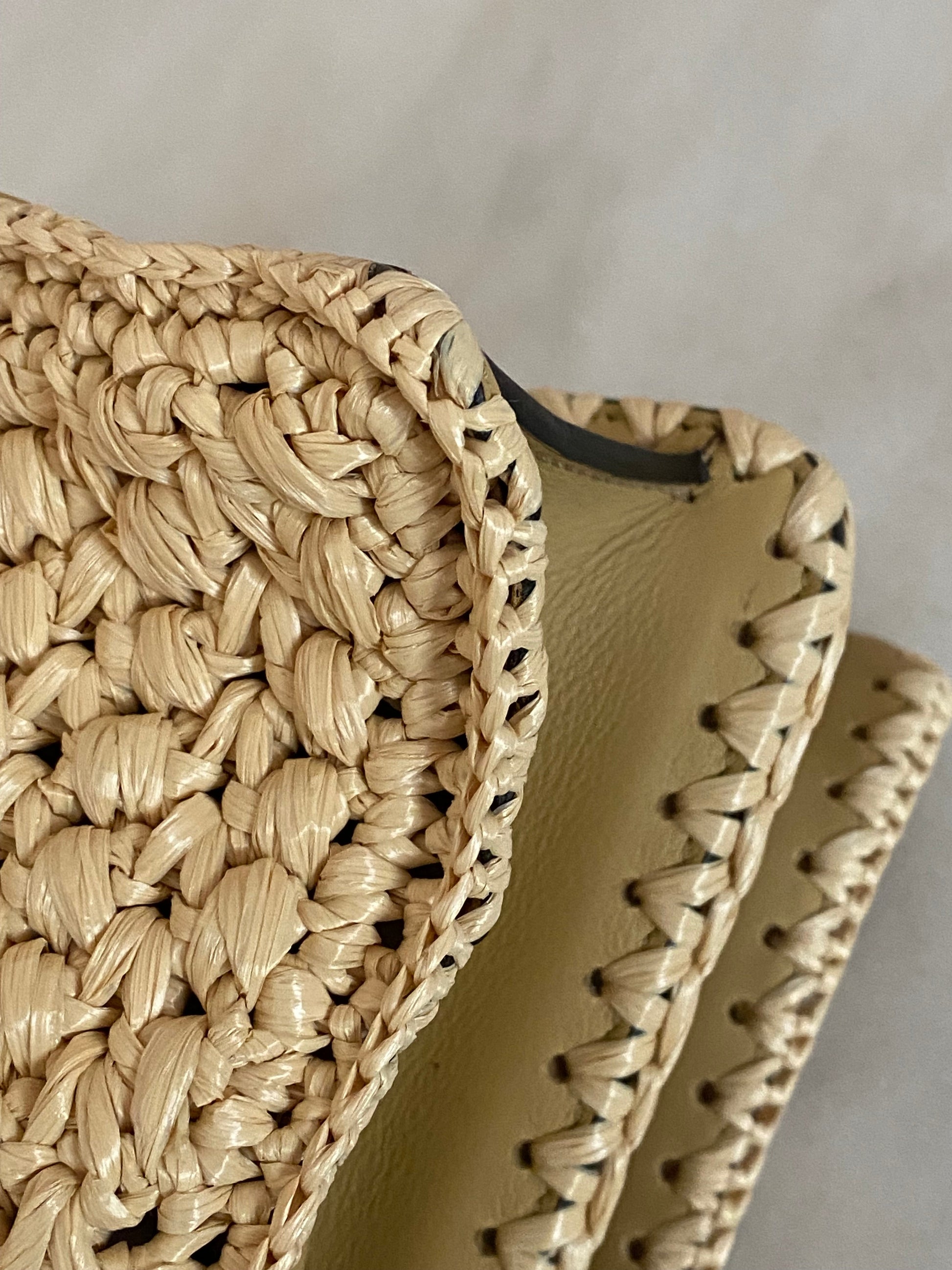 - Material: Beige Raffia with Leather Trim