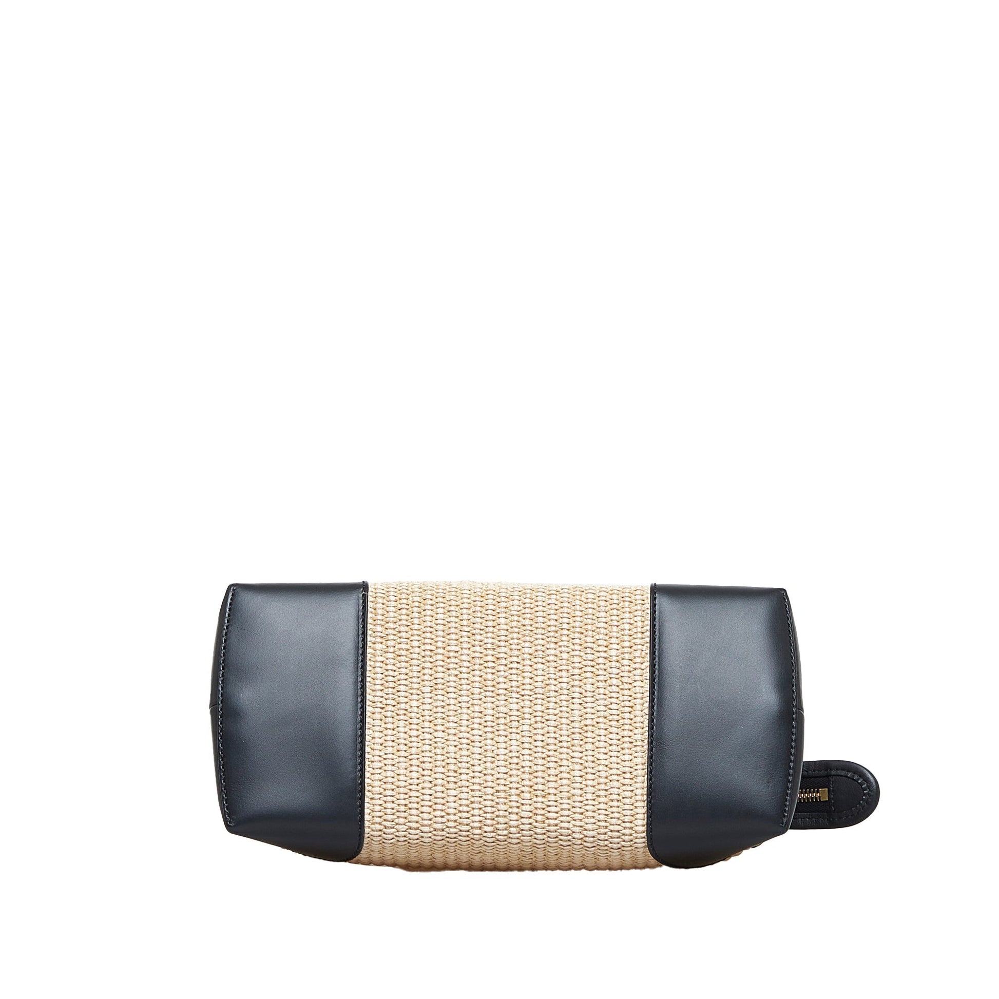 The By The Way satchel features a woven straw body with leather trim, flat top handles, a detachable flat leather strap, a top zip closure, and interior zip and slip pockets. Comes with dust bag