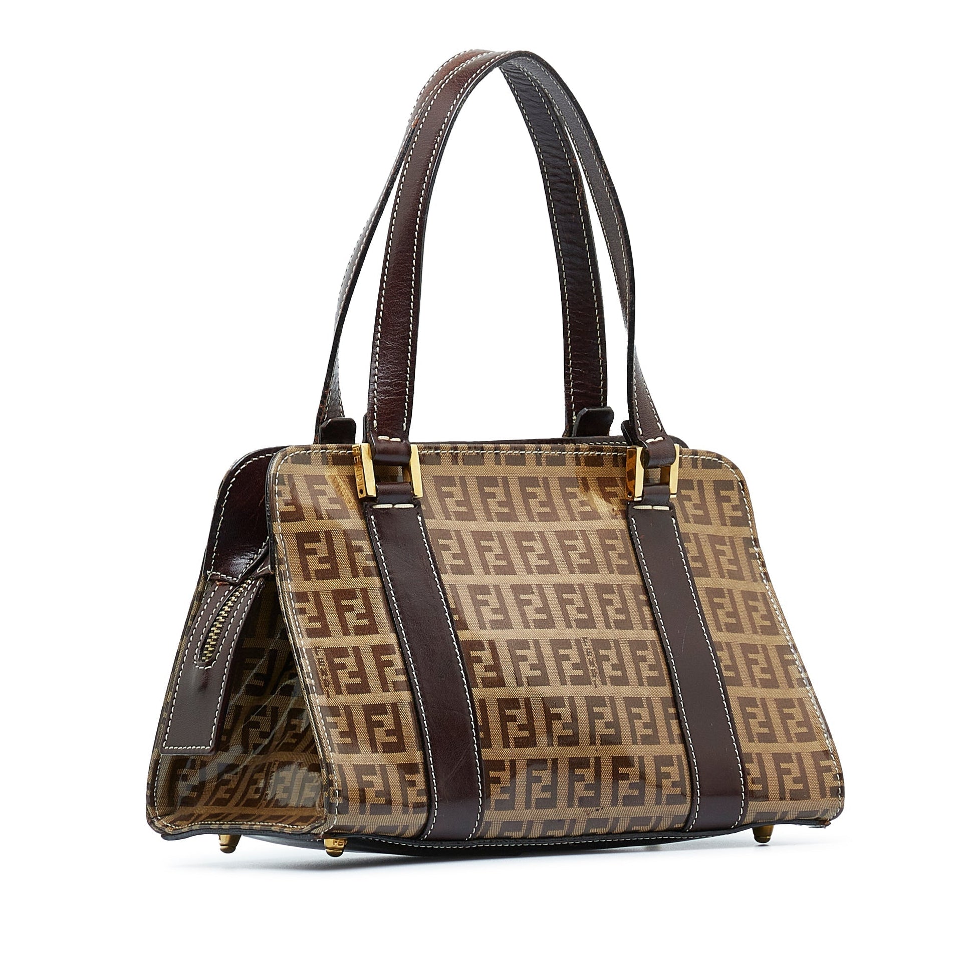 This handbag features a coated canvas body with leather trim, flat leather handles, top zip closure, and interior zip and slip pocket. Comes with dust bag