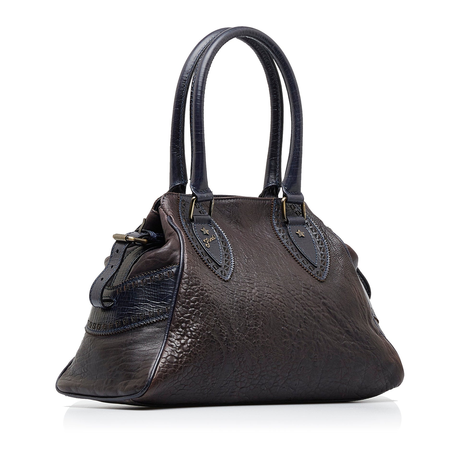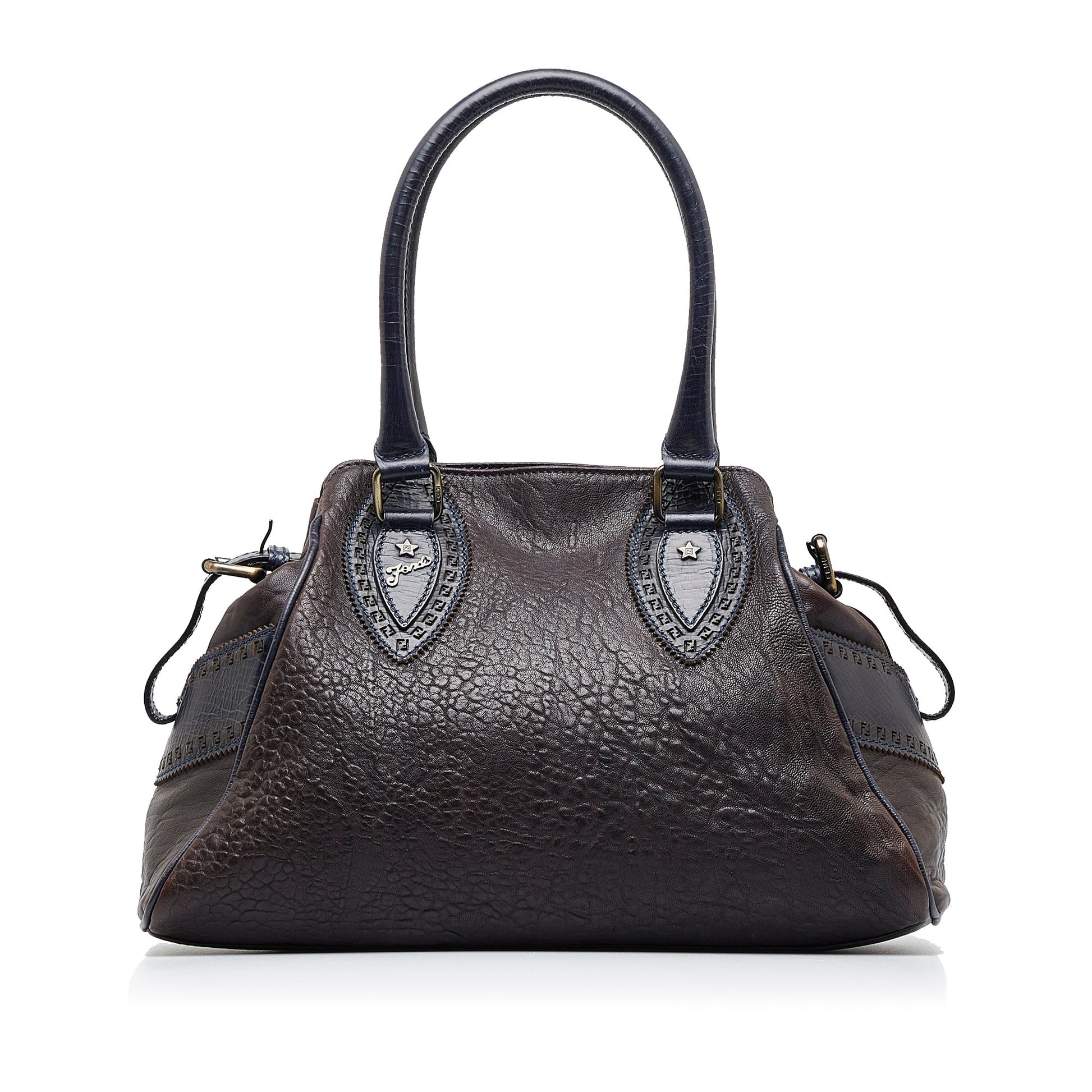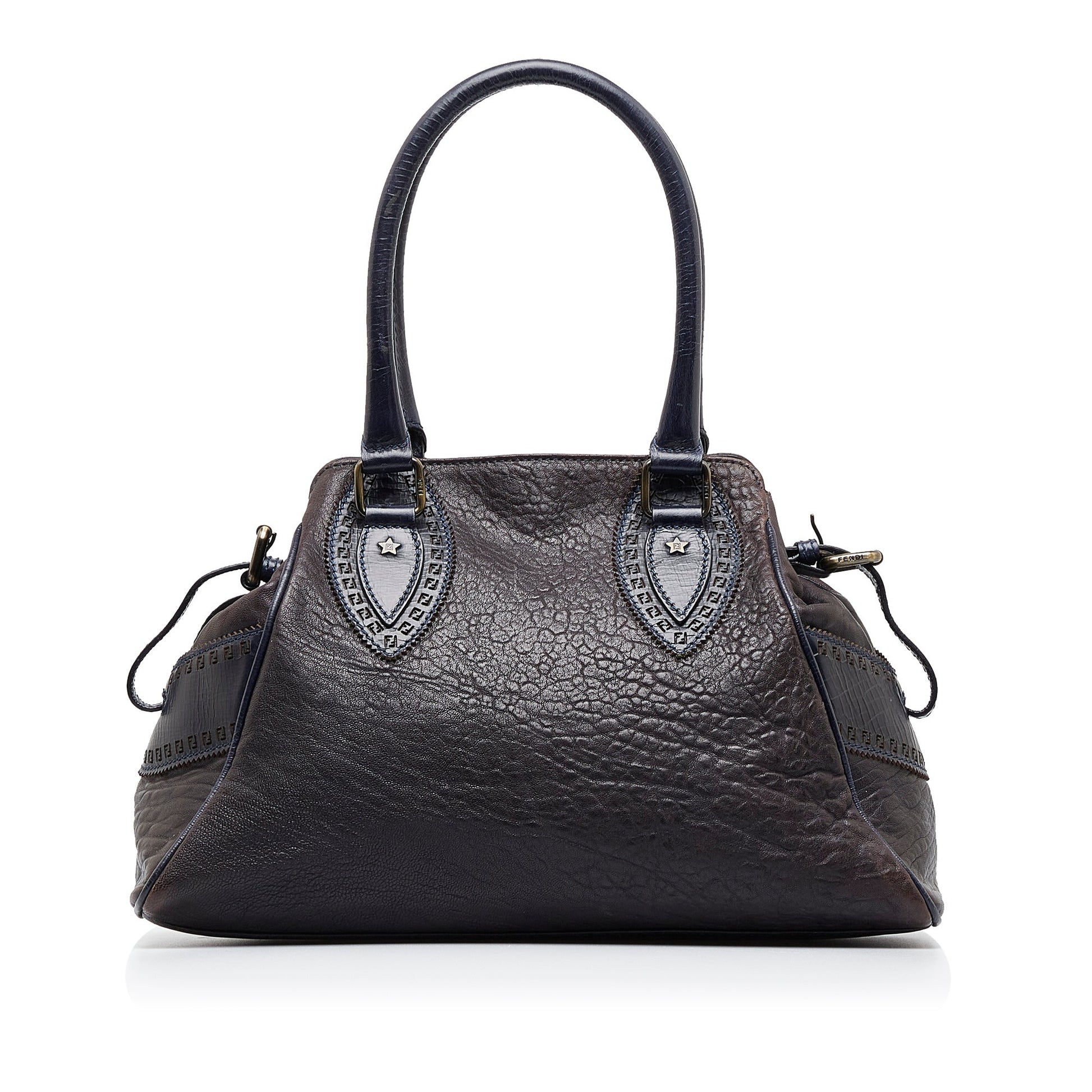 The Etniko handbag features a leather body, rolled leather handles, an open top with a metal toggle closure, and an interior zip pocket.