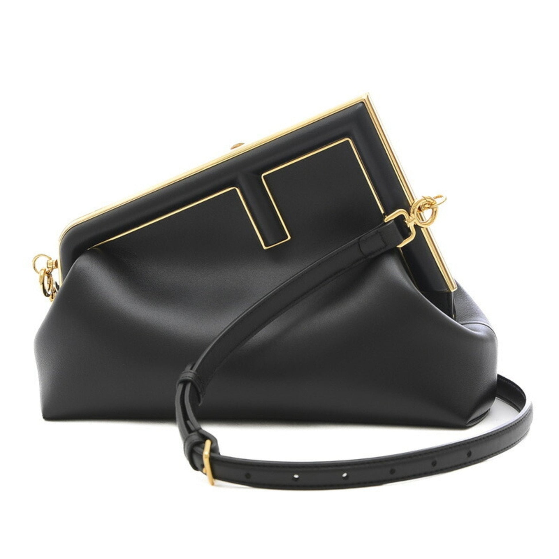 FENDI First Midi 2Way Shoulder Bag Clutch Leather Black 8137