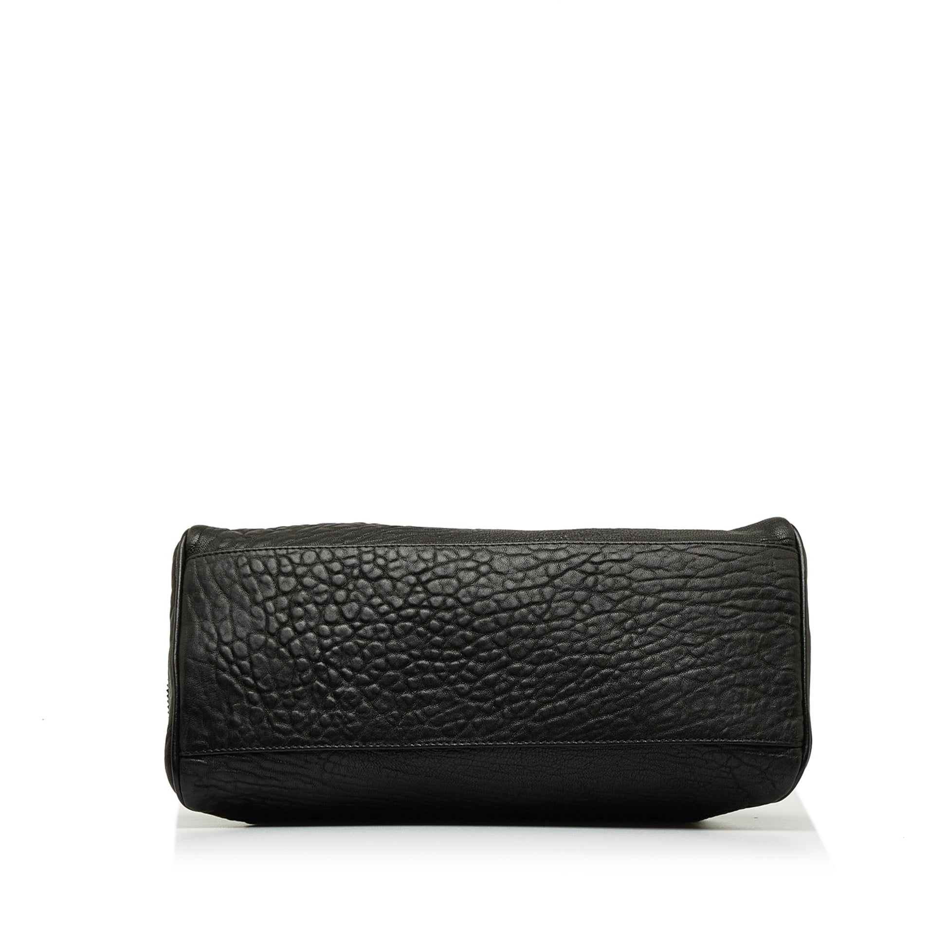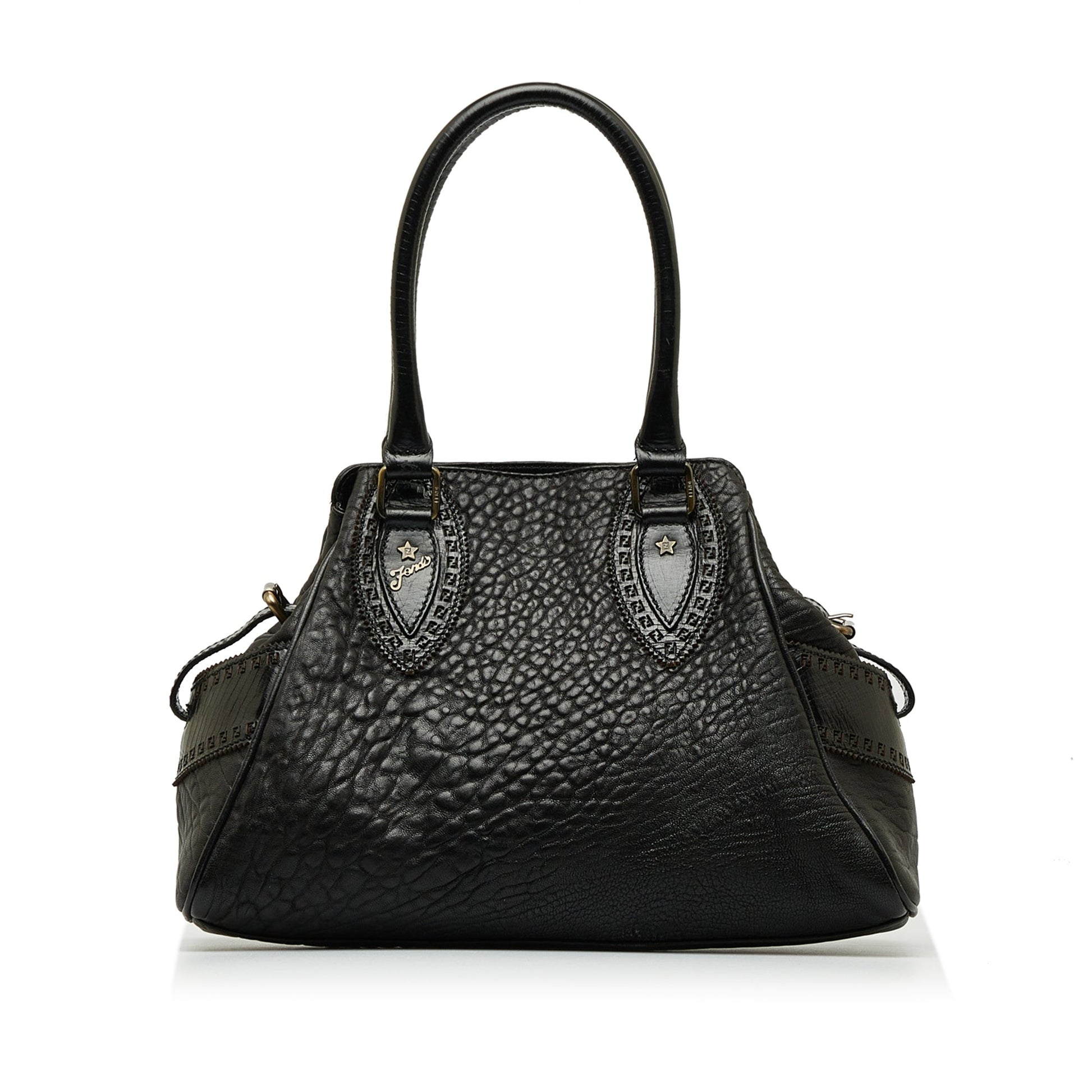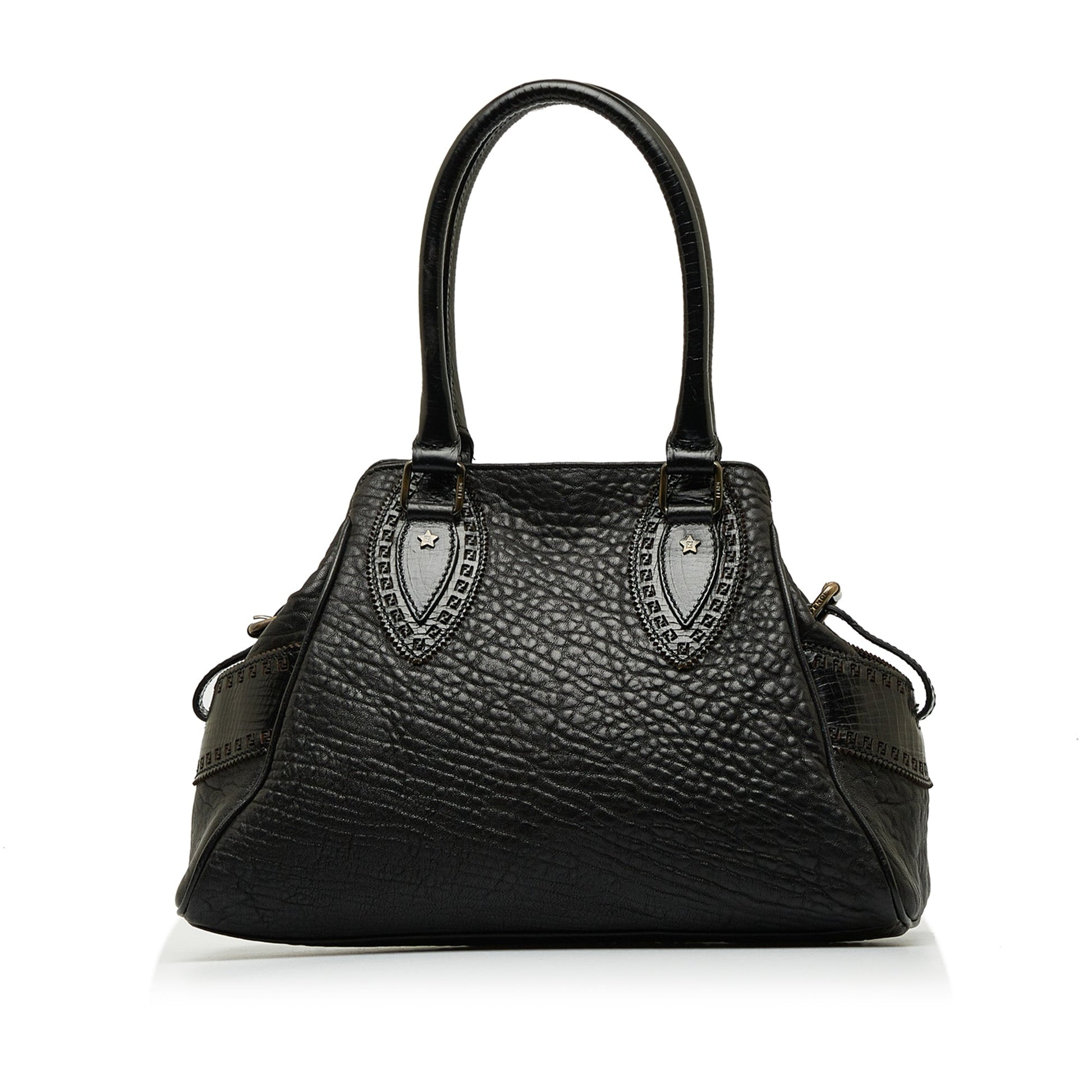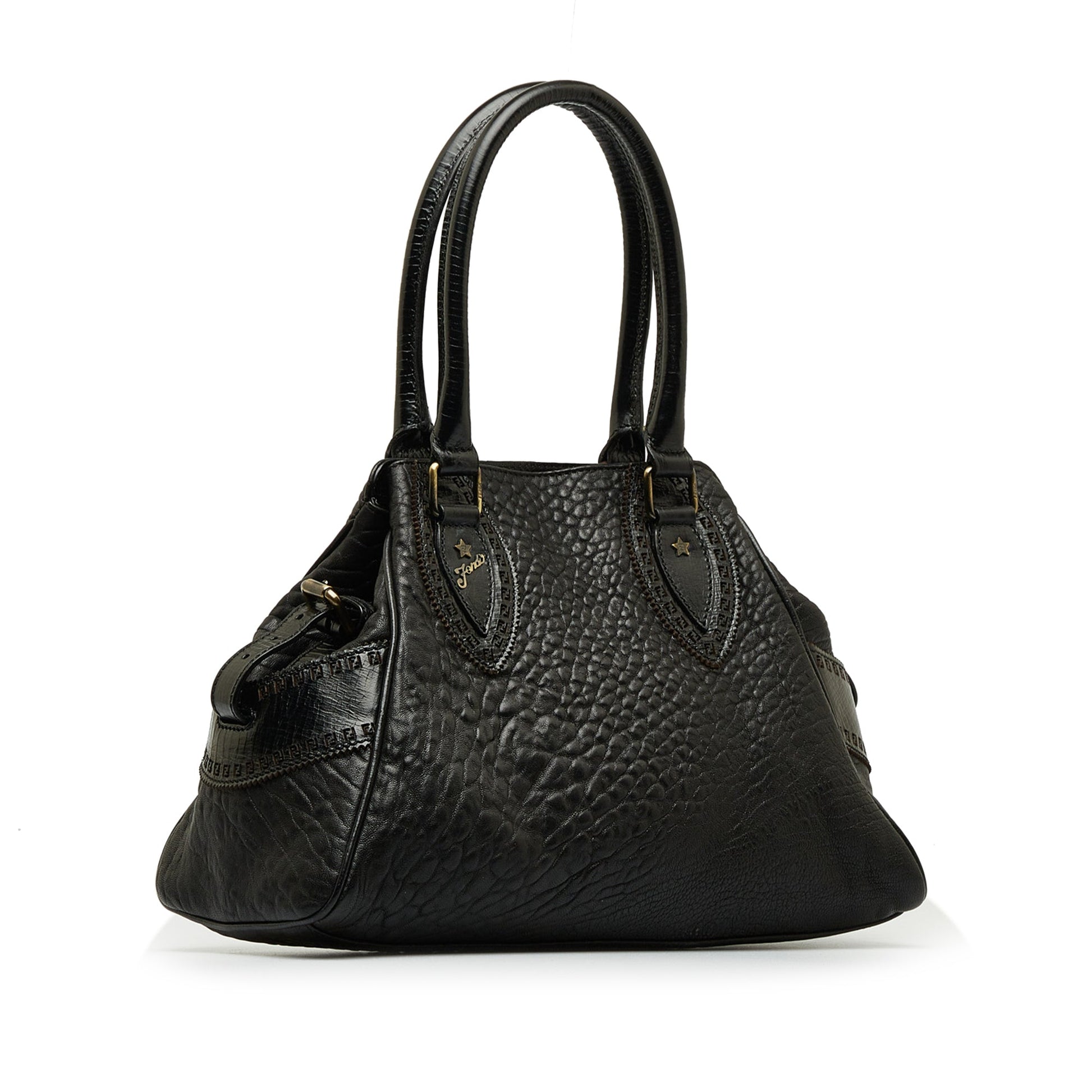 The Etniko Du Jour features a leather body, rolled leather handles, an open top with a metal toggle closure, and an interior zip pocket.