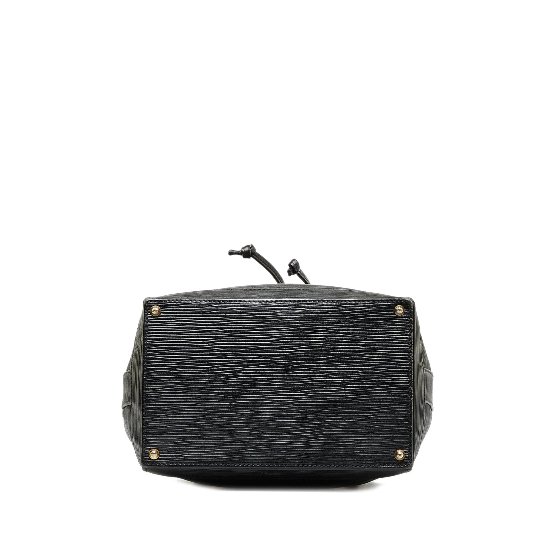 This satchel features a leather body, rolled leather handles, a detachable flat strap, an open top with drawstring closure, and an interior zip pocket.