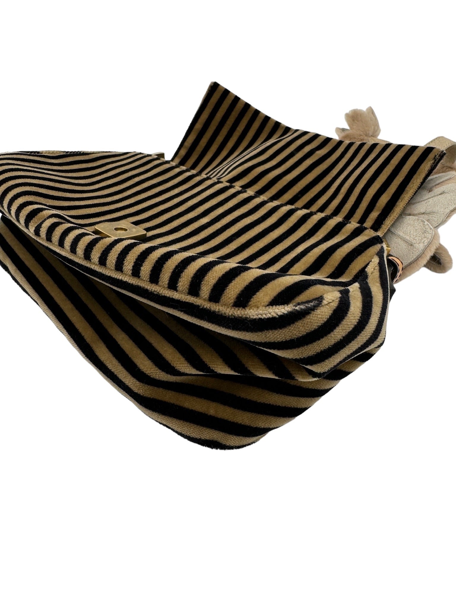 Elevate your style with this FENDI Mama Bucket Handbag. Crafted from velour fur in dark brown, black, and beige color tones, this top handle bag is perfect for any fashion-forward individual.