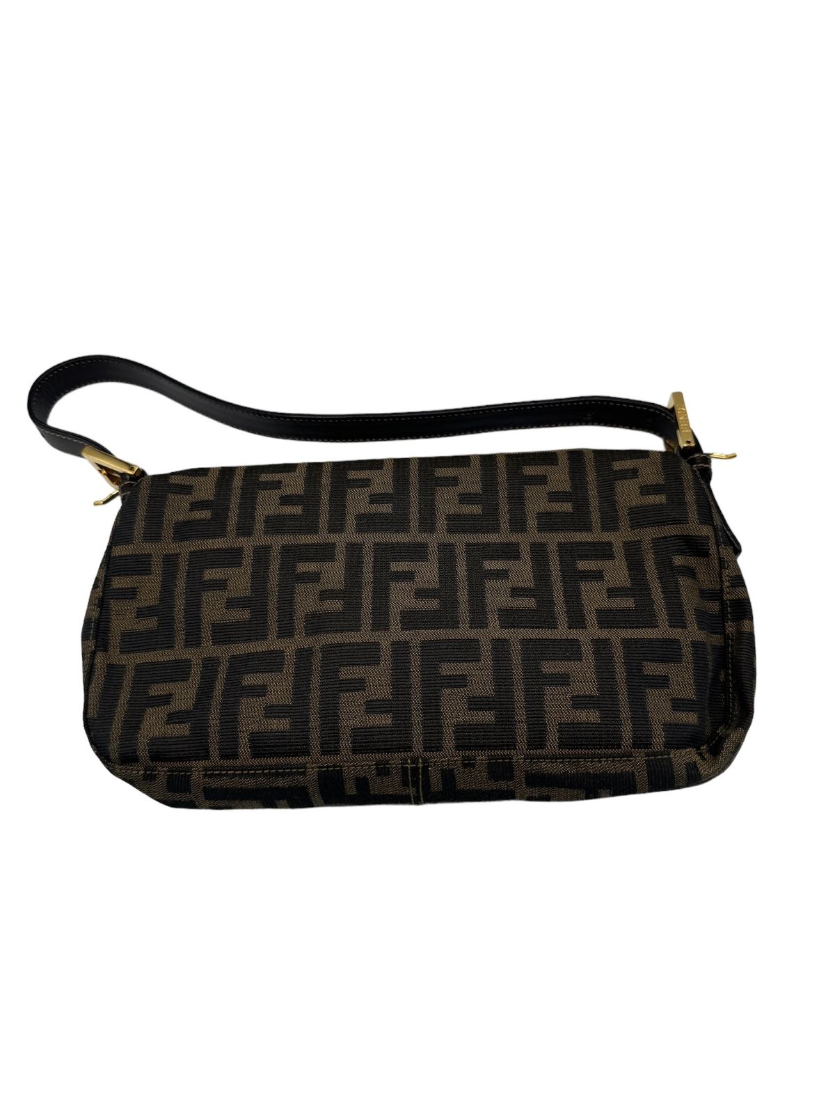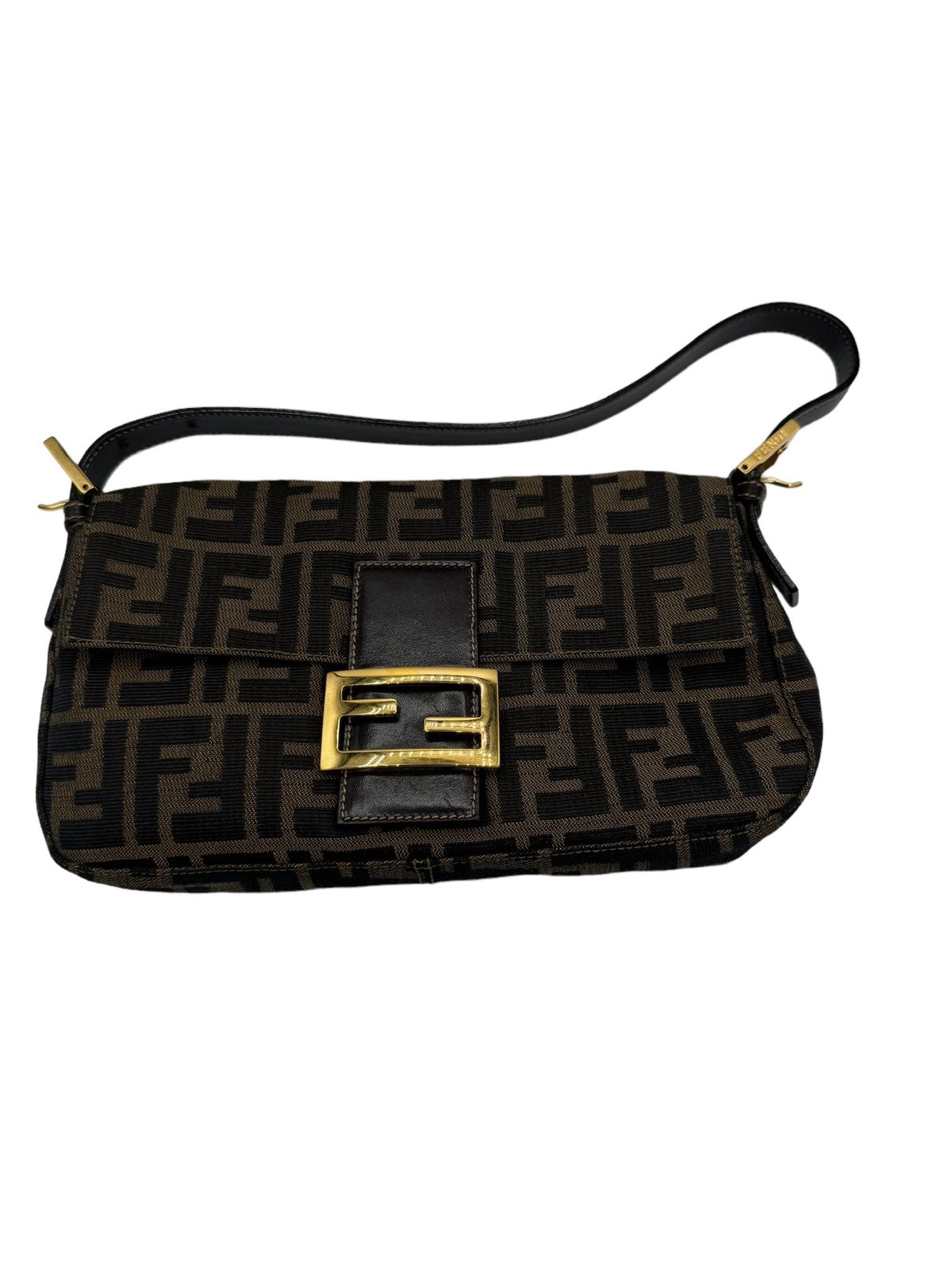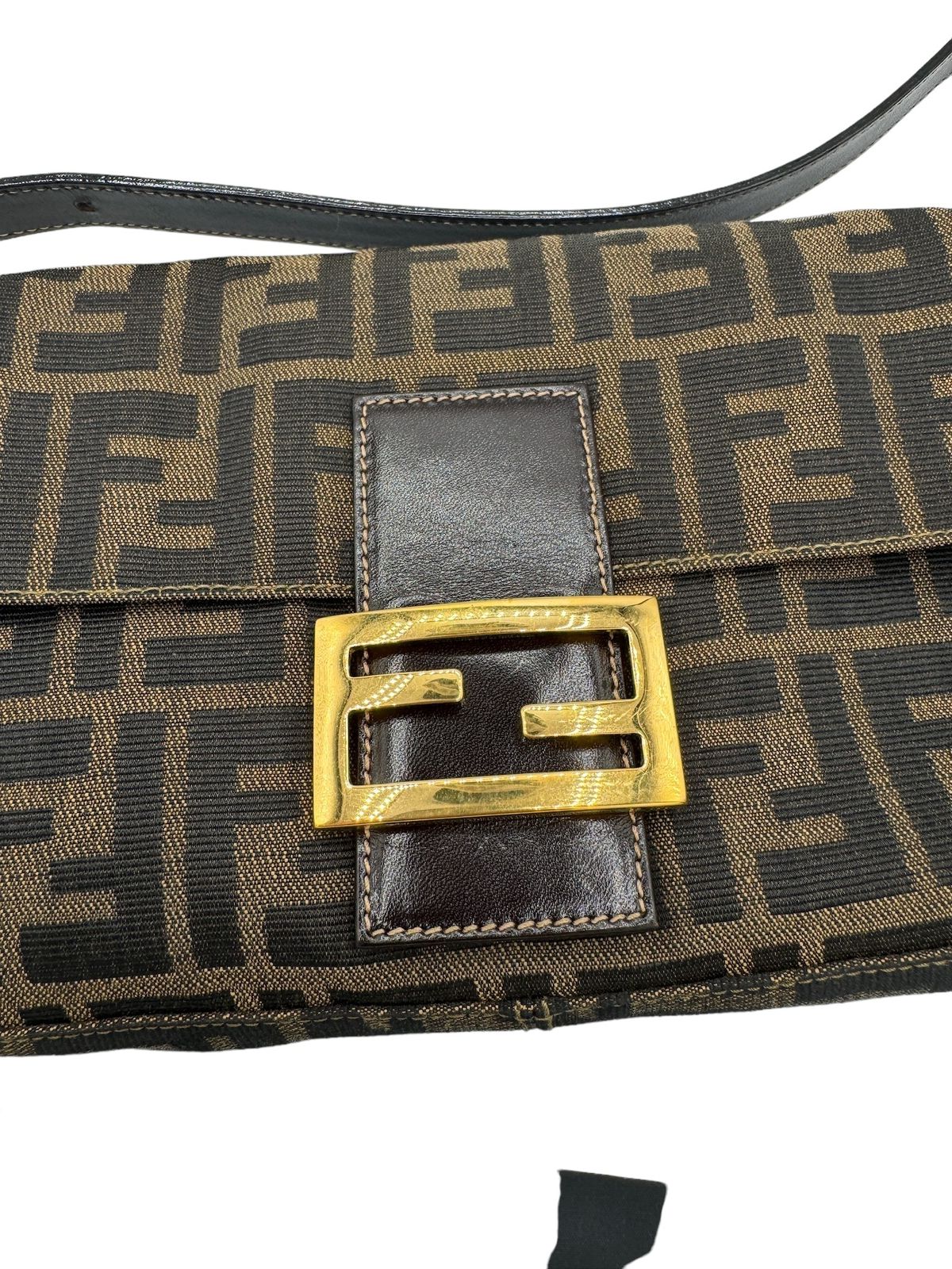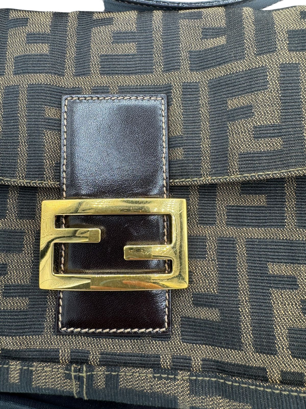 This FENDI Mama Bucket Handbag in a light brown/dark brown jacquard fabrication is perfect for those who love shoulder bags. It has a height of 5.91 inches, width of 10.24 inches, and depth of 1.57 inches.