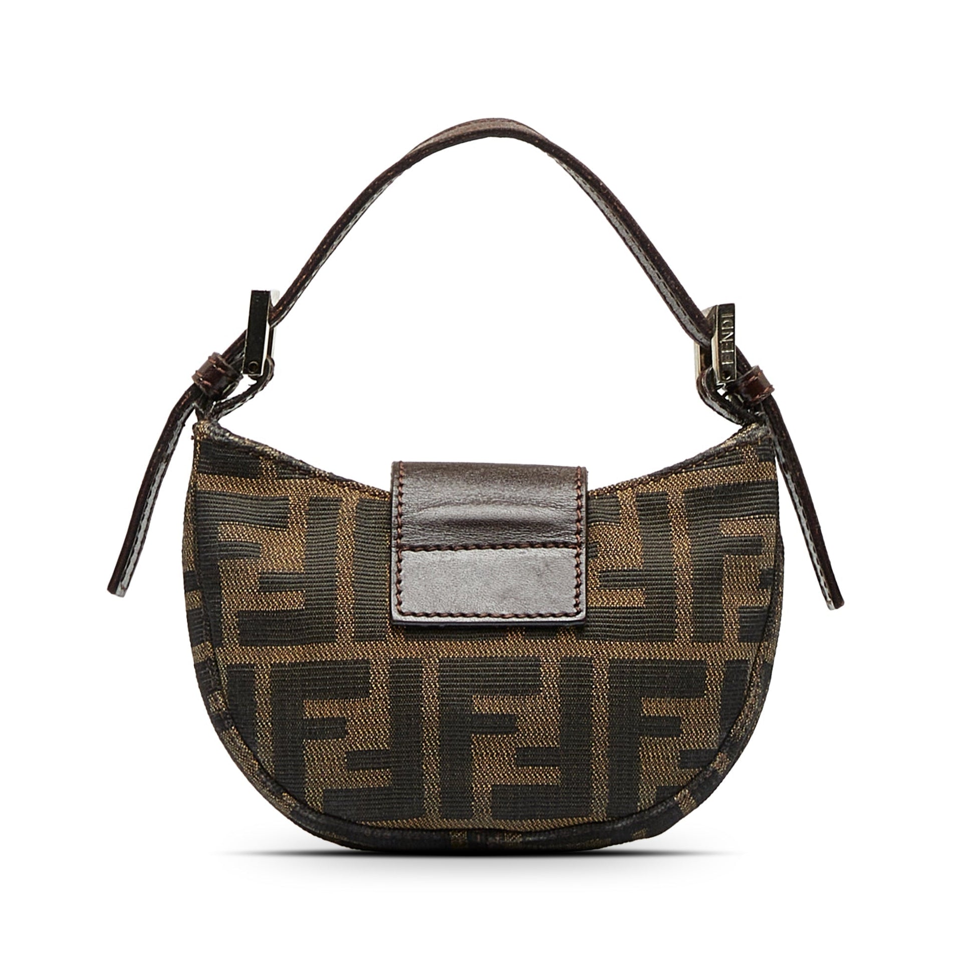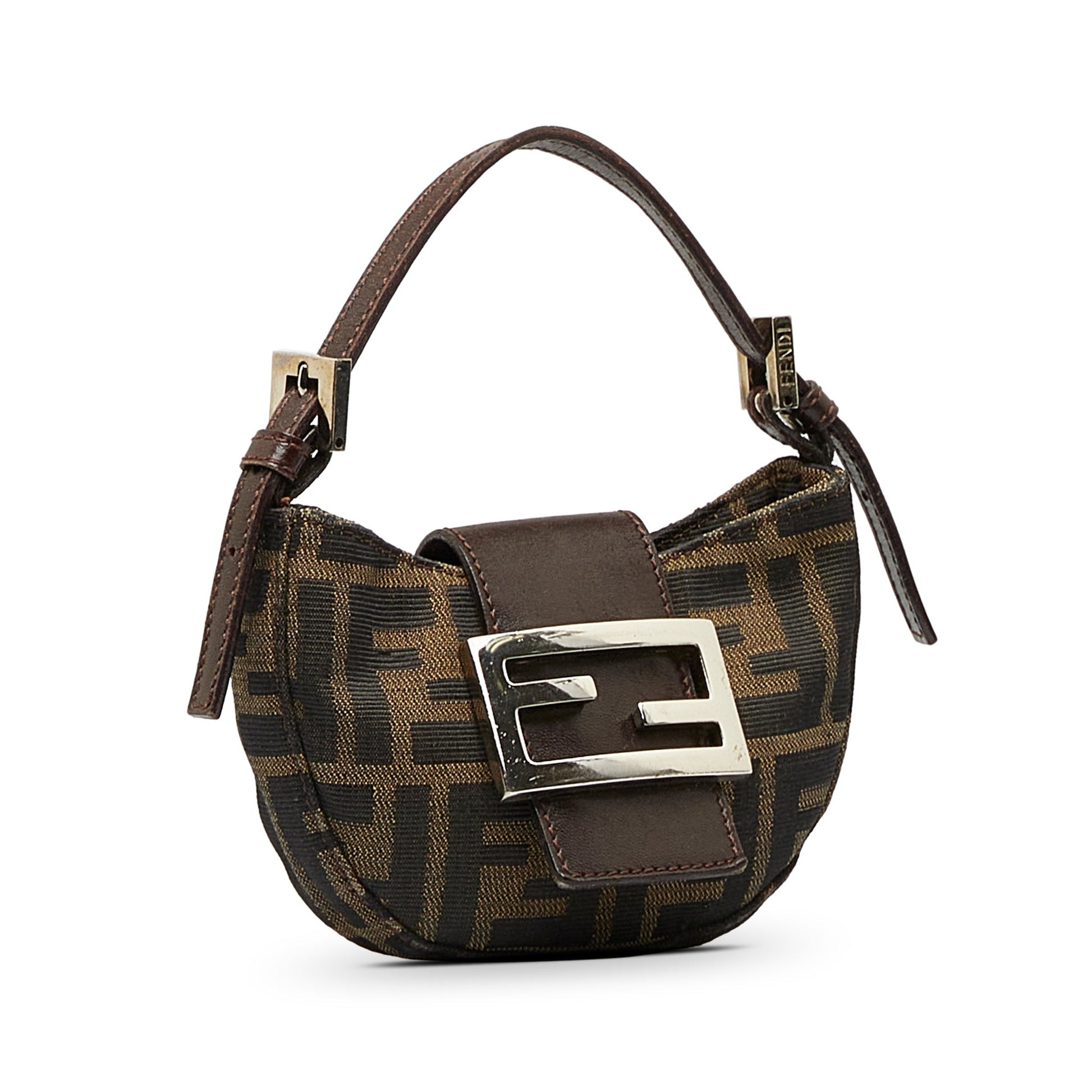 This baguette features a canvas body, a flat leather handle, a front flap with magnetic snap closure, and an interior zip pocket.