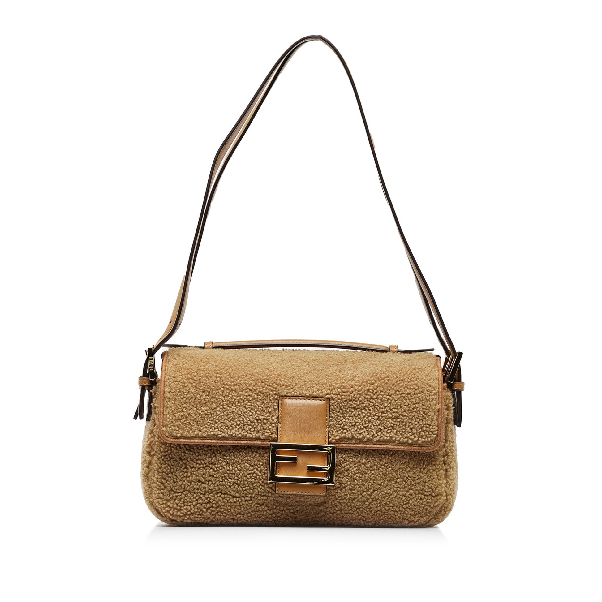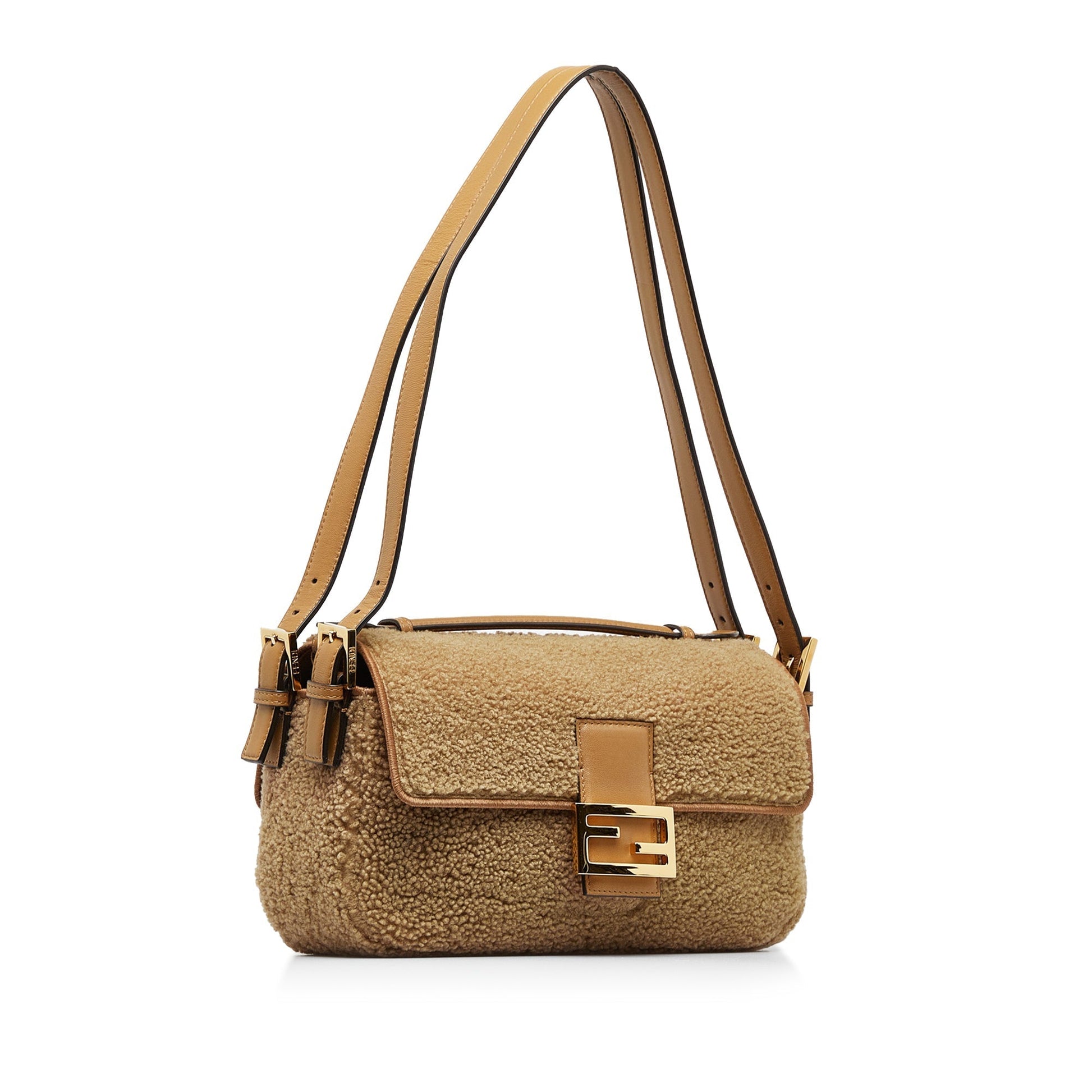 This satchel features a shearling body with leather trim, a flat leather handle, dual leather straps, dual top flap with magnetic snap button closures, and an interior zip pocket. Comes with dust bag