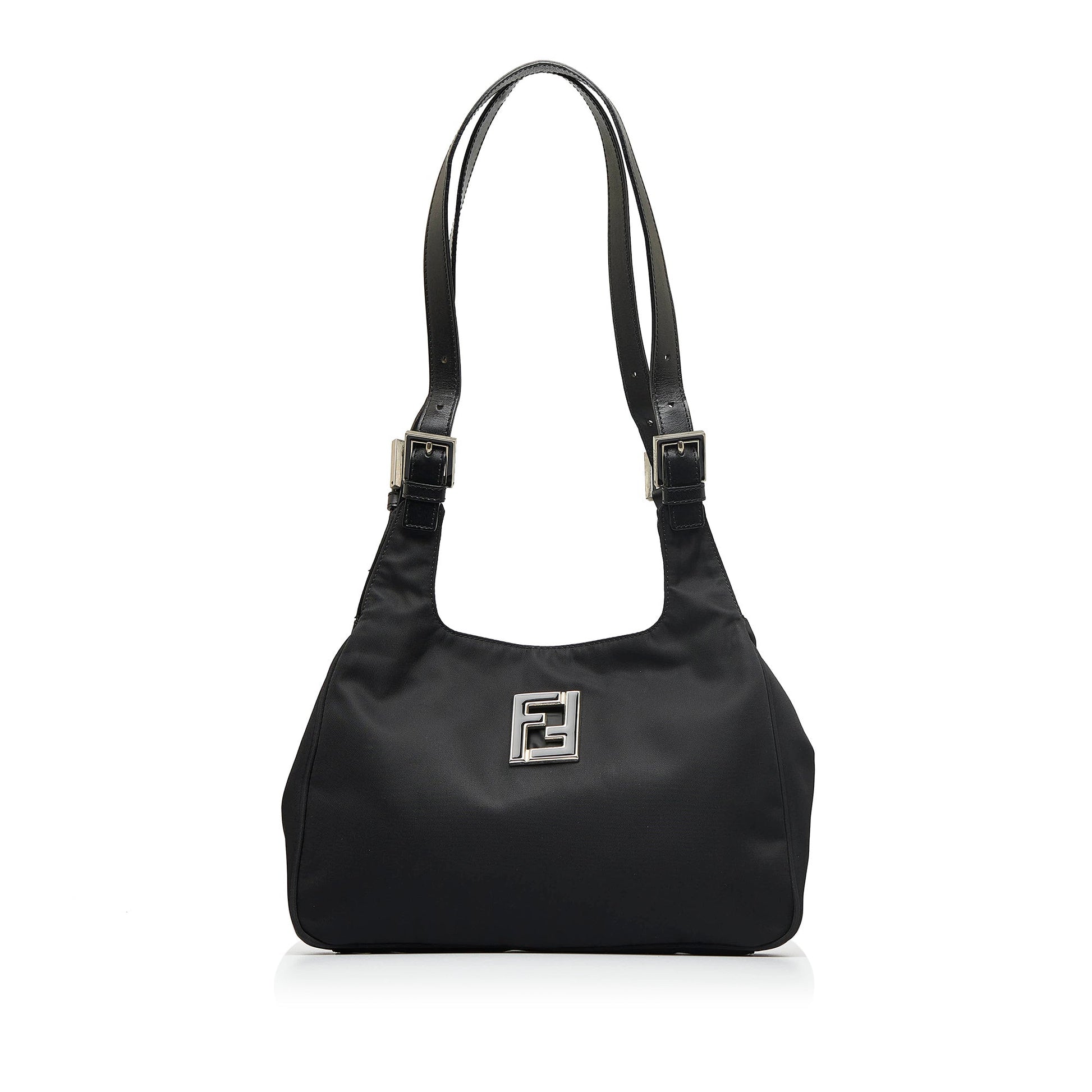This shoulder bag features a nylon body, flat leather straps, an open top with magnetic snap button closure, and an interior zip pocket.