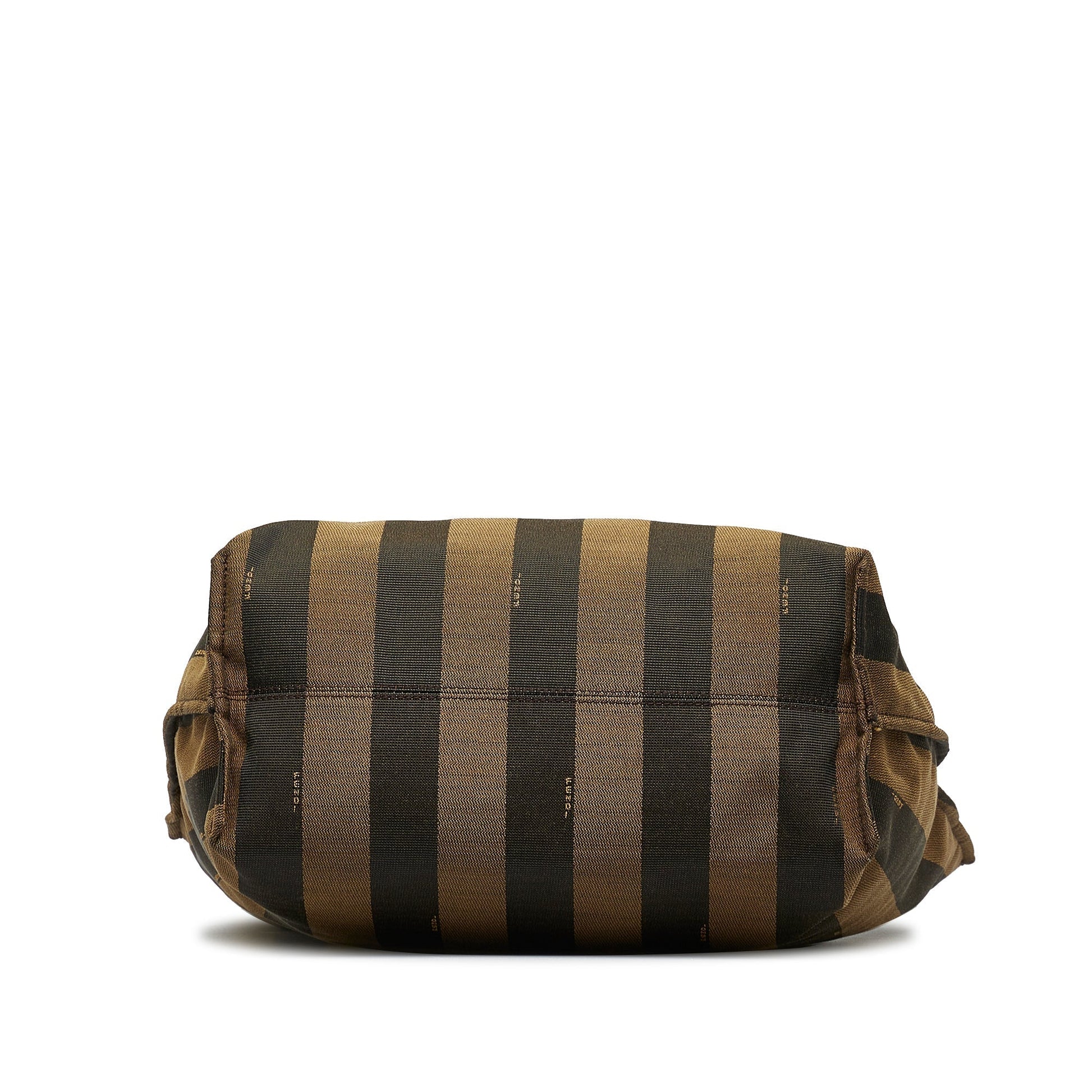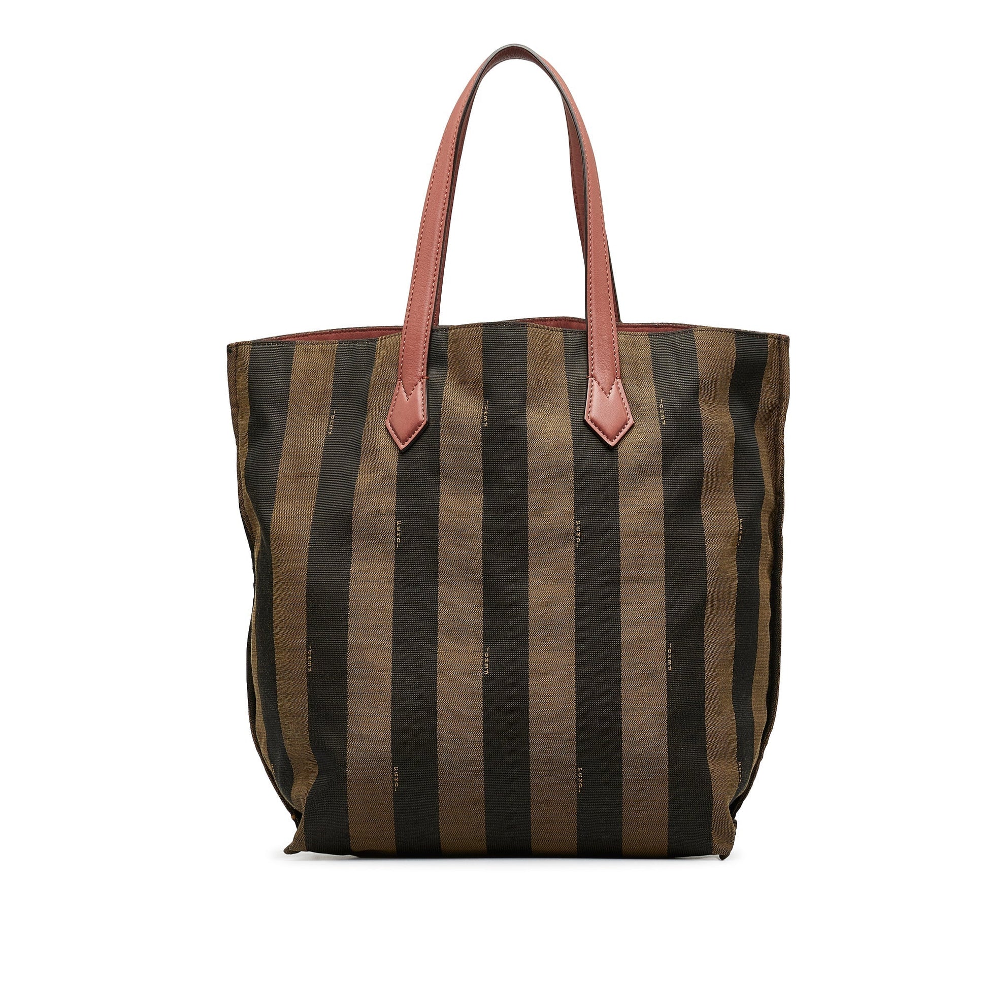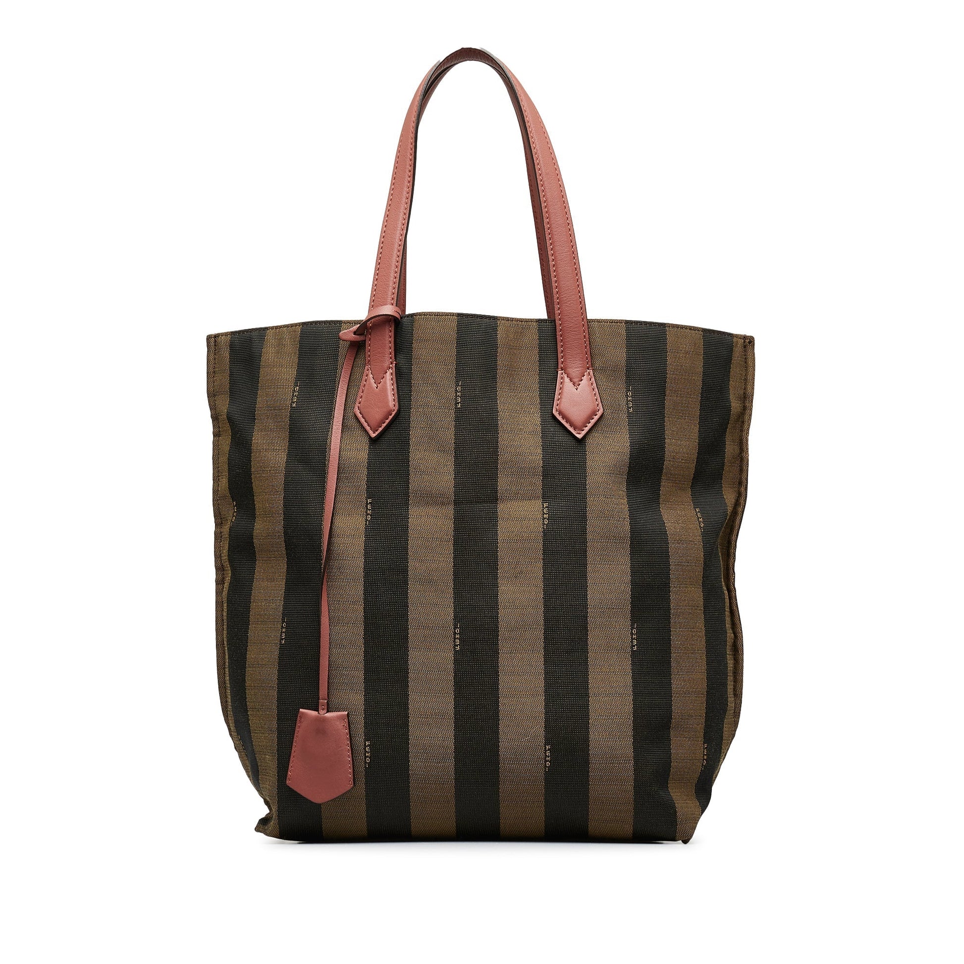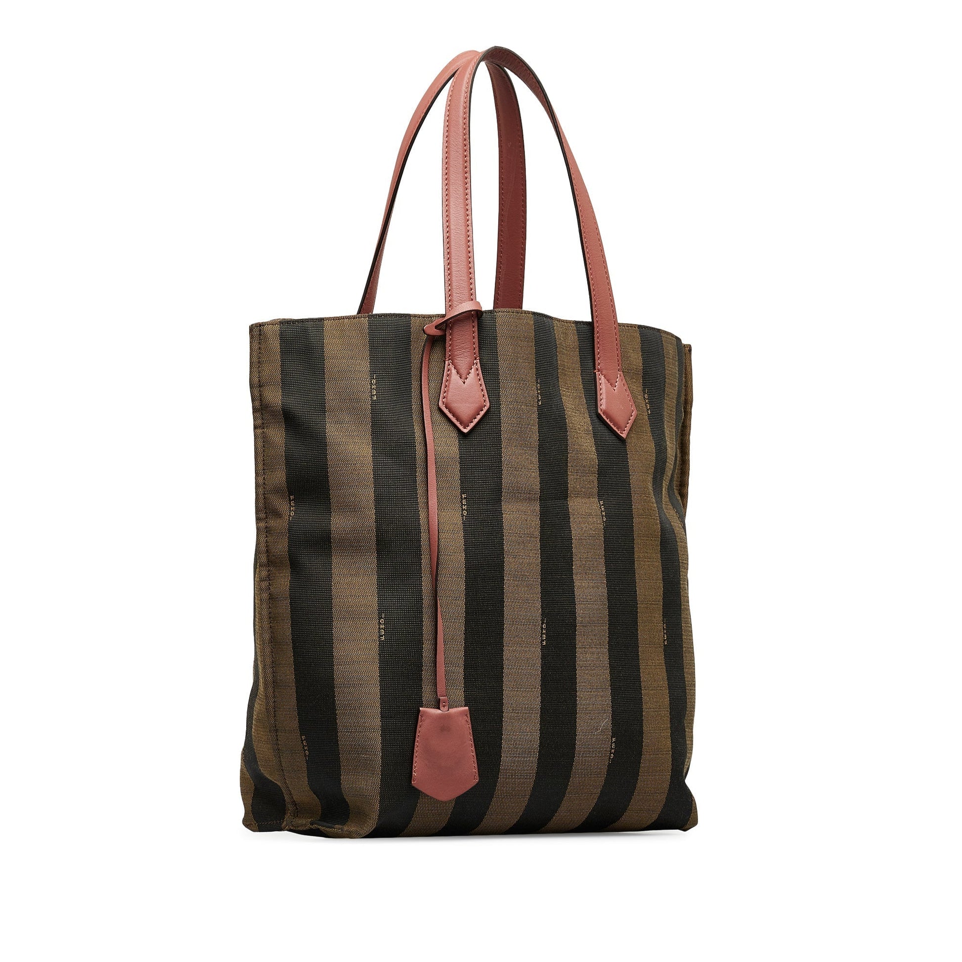 This tote bag features a canvas body, flat leather straps, an open top, and an interior zip pocket.