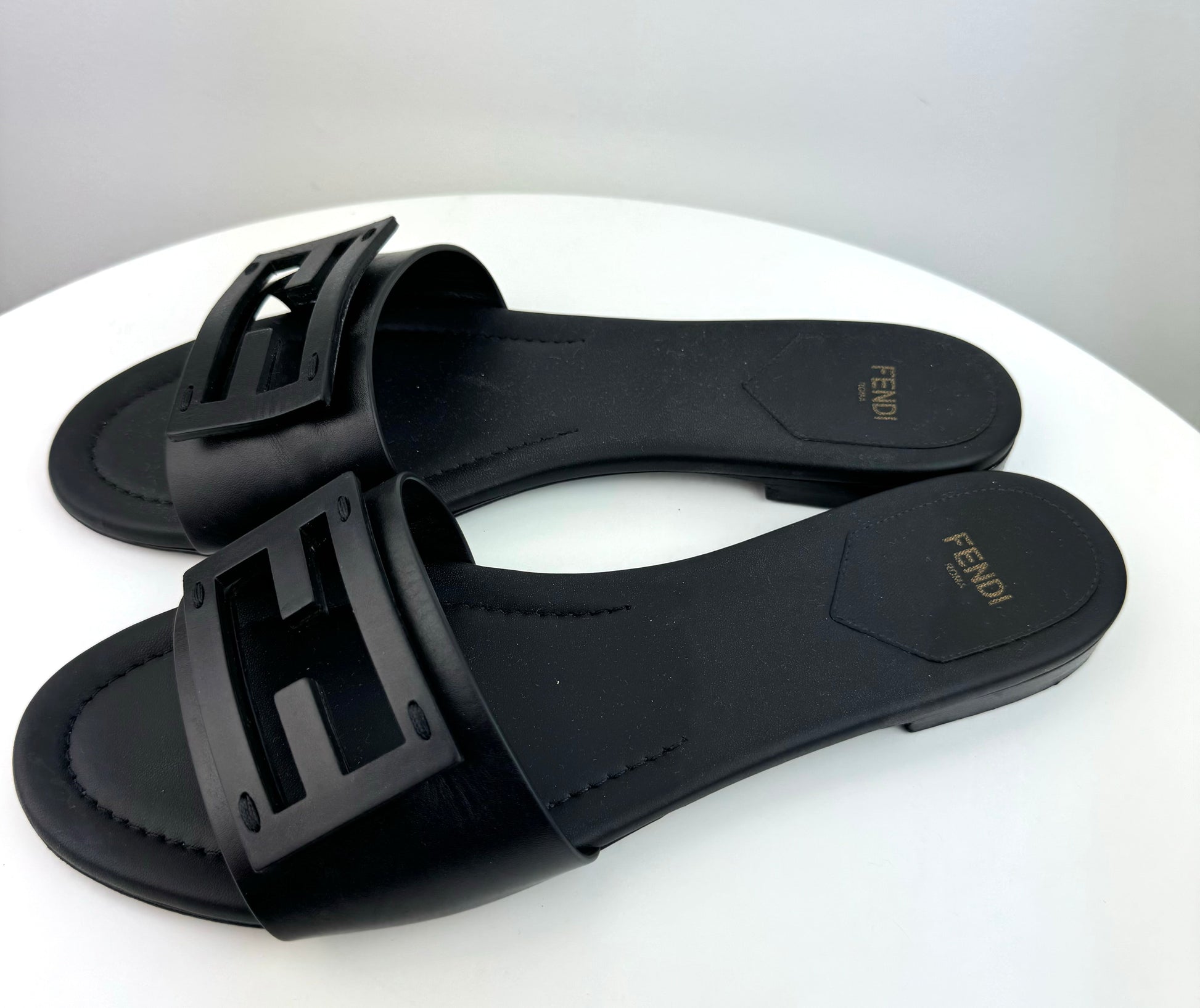 Fendi Ff Cutout Flat Leather Sandals In Nero size 40 or . This product is in great condition with dust bag and box.