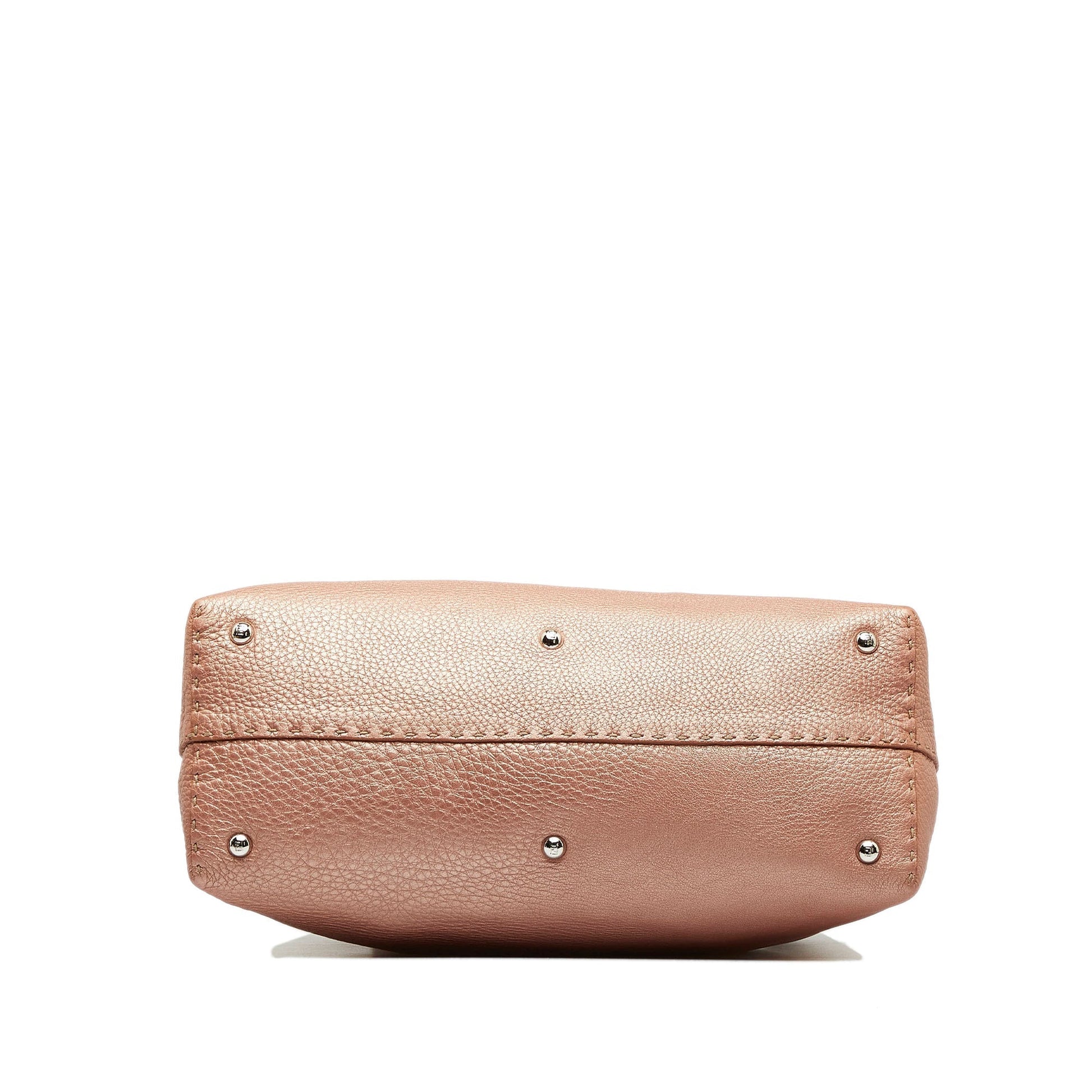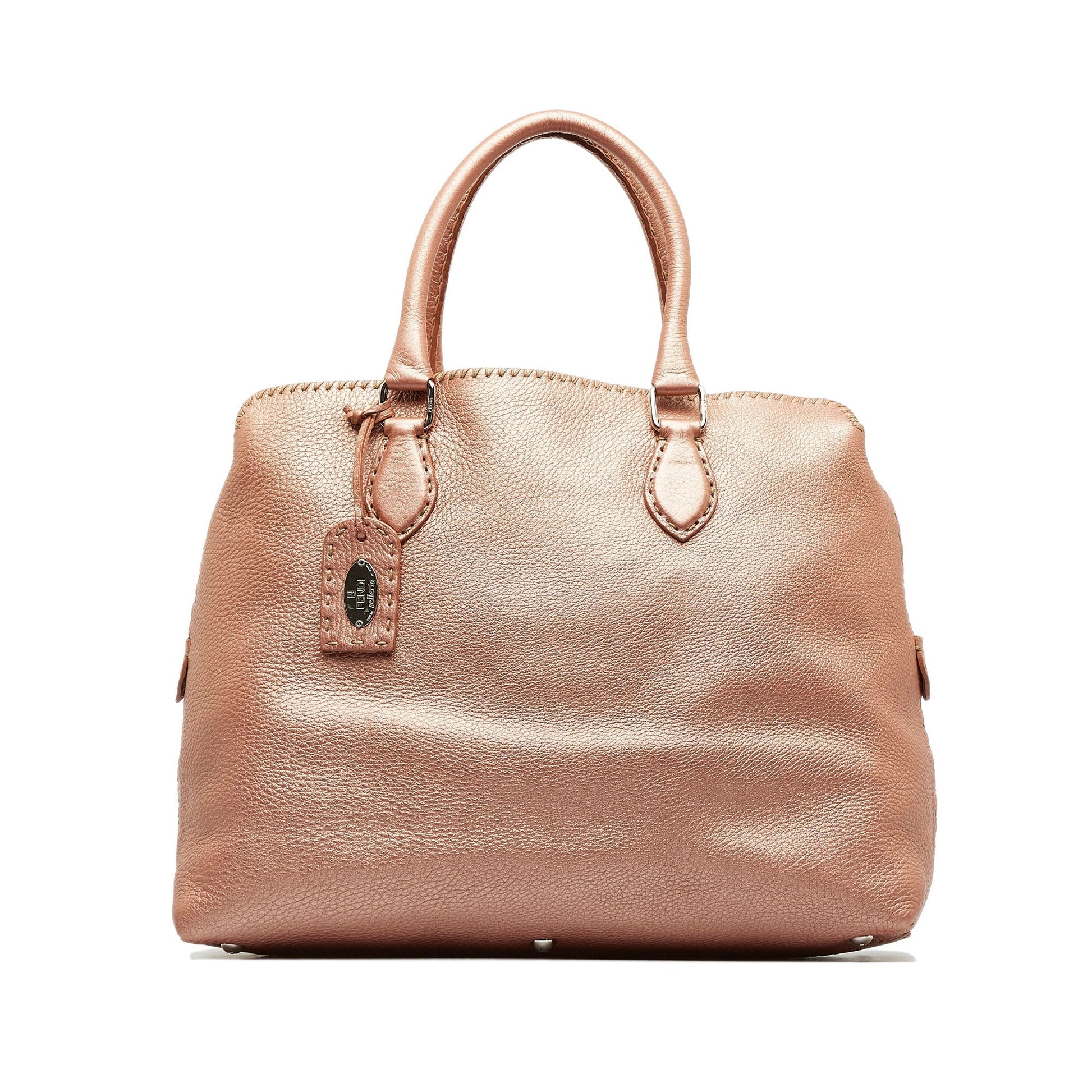 This tote bag features a leather body, rolled leather straps, an open top, and an interior zip pocket.