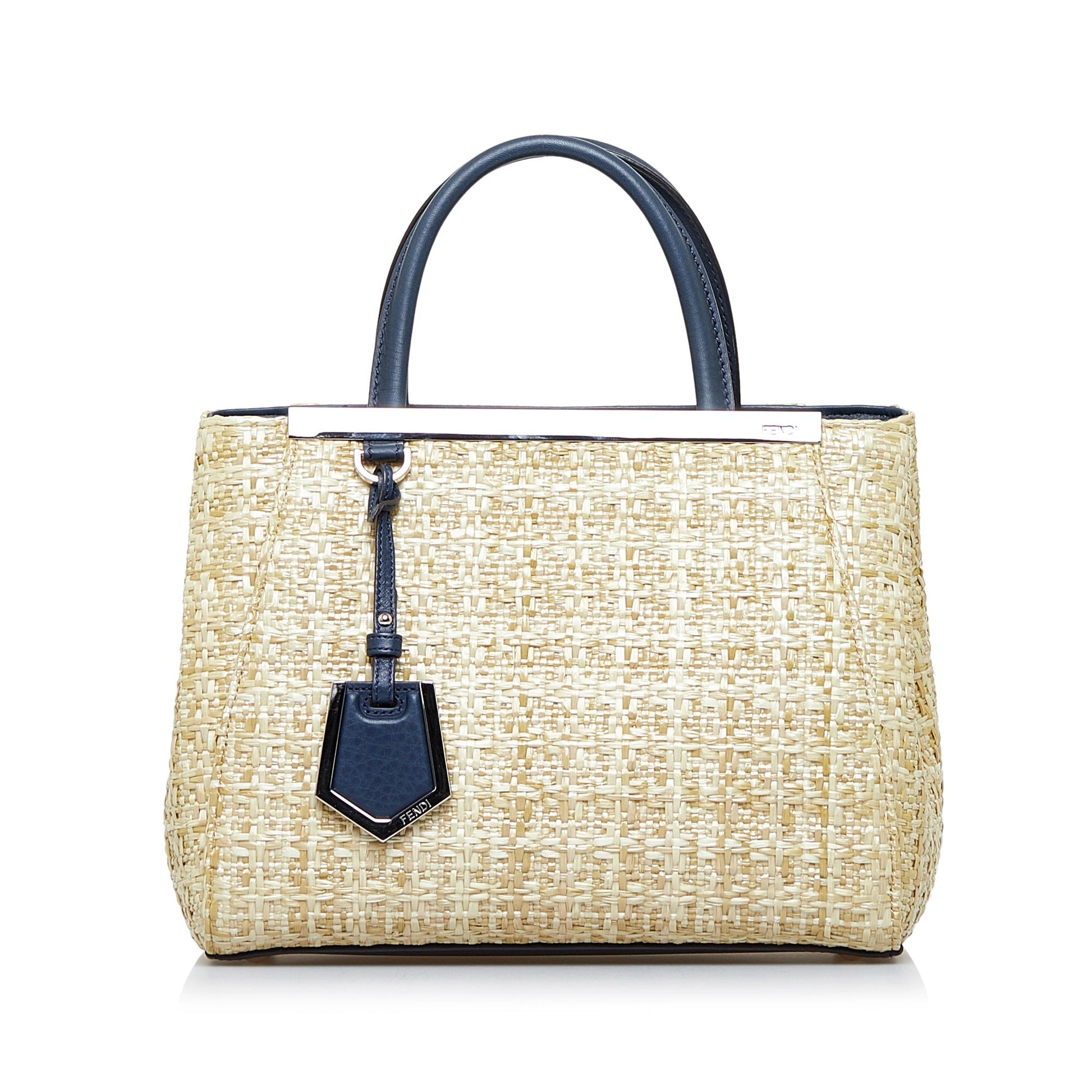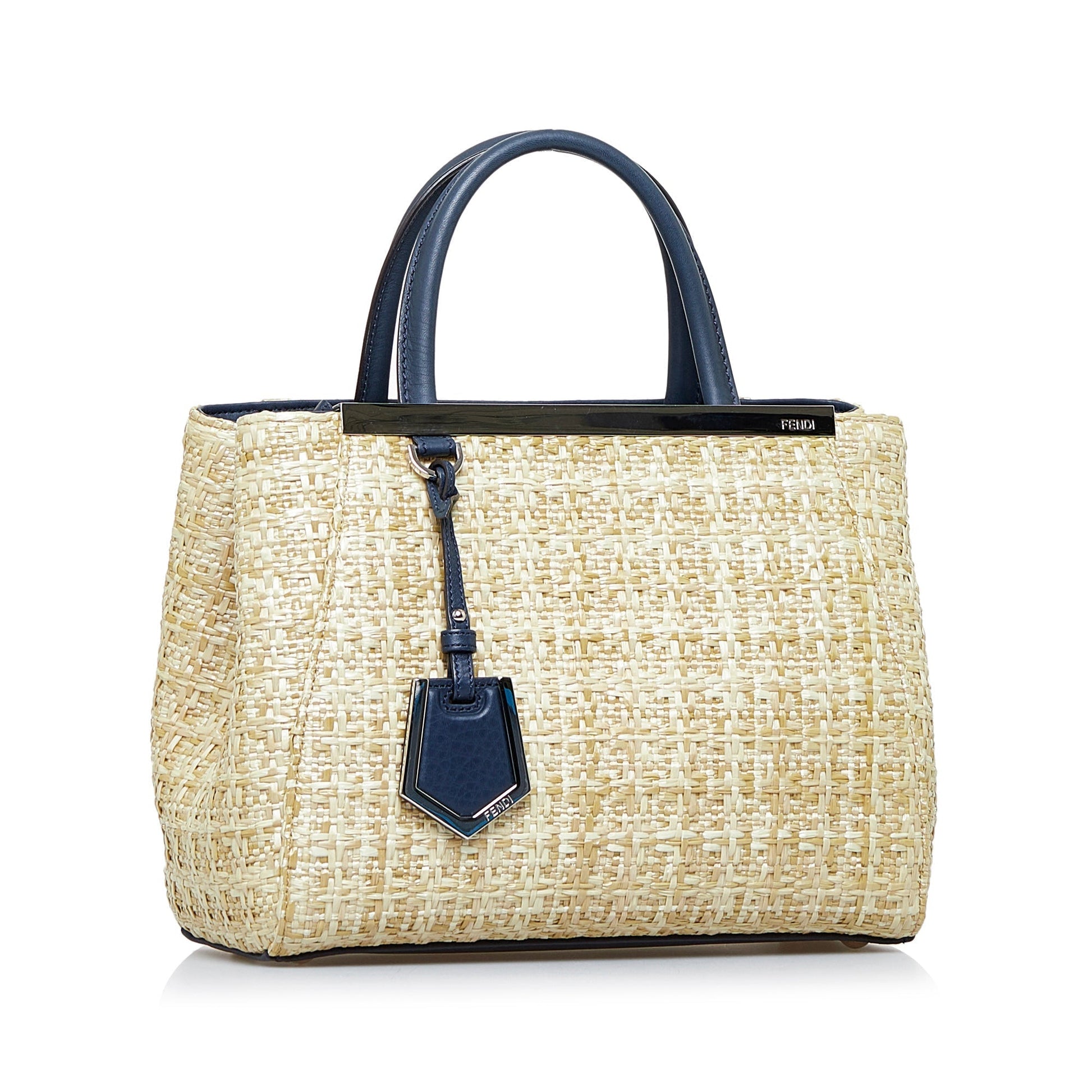 The Small 2Jours features a woven raffia body, rolled leather handles, a flat leather strap, a snap button closure, and an interior zip compartment.