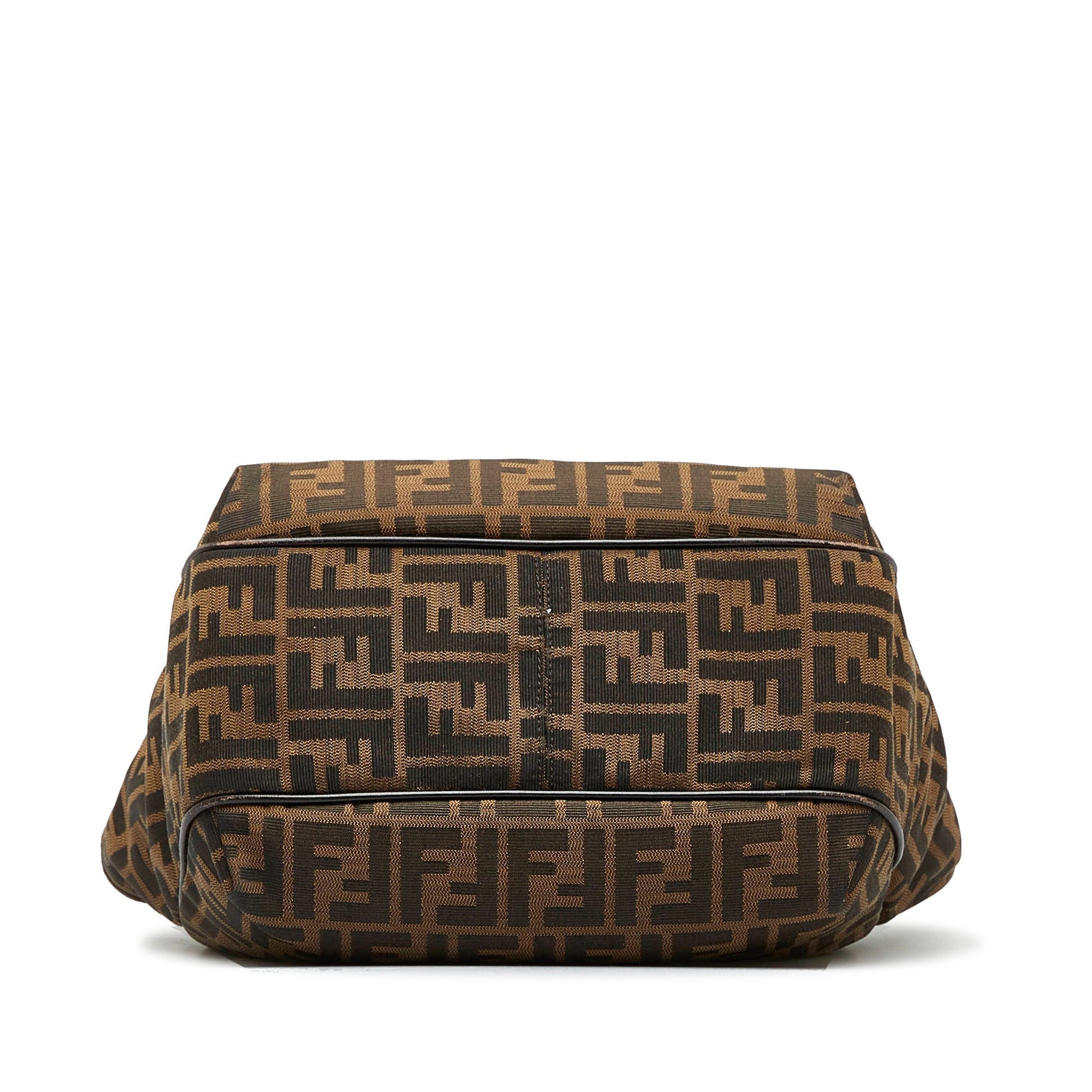 This tote bag features a canvas body with leather trim, flat leather straps with gold tone hardware, a top zip closure, and an interior slip pocket. Comes with dust bag
