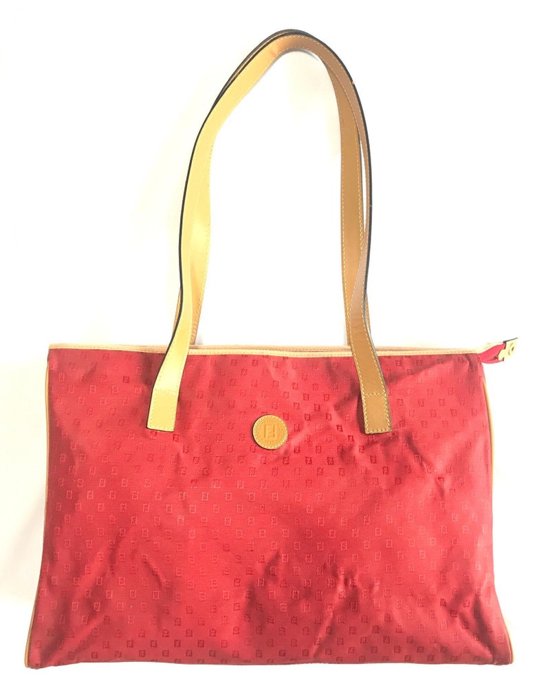 FENDI Vintage red logo jacquard fabric large shopper tote bag with brown leather handles
