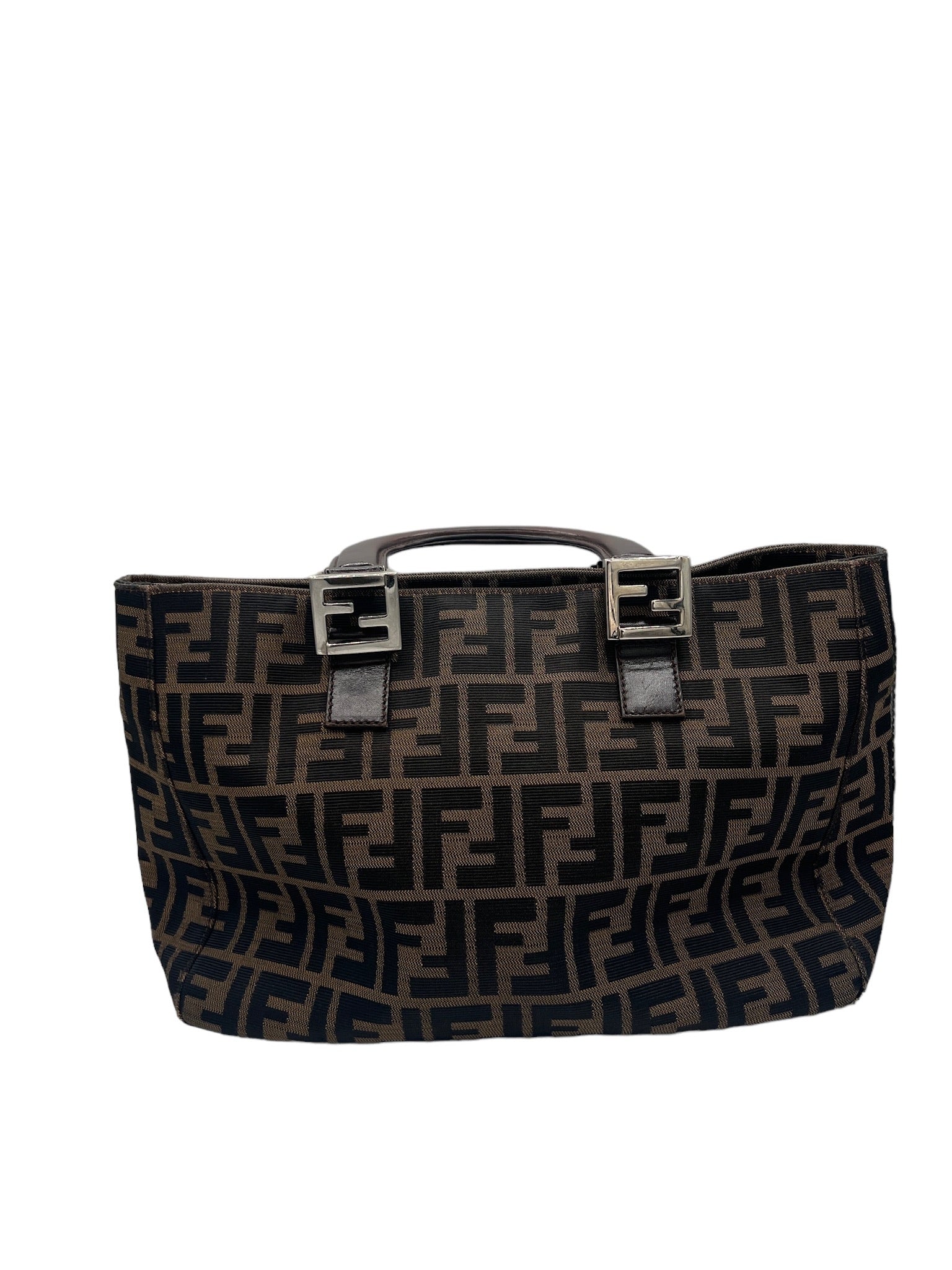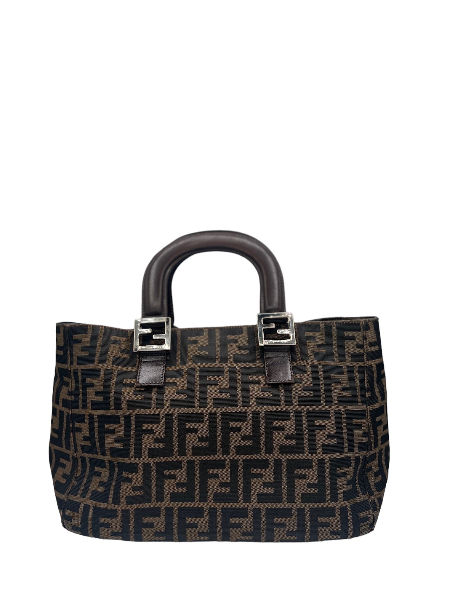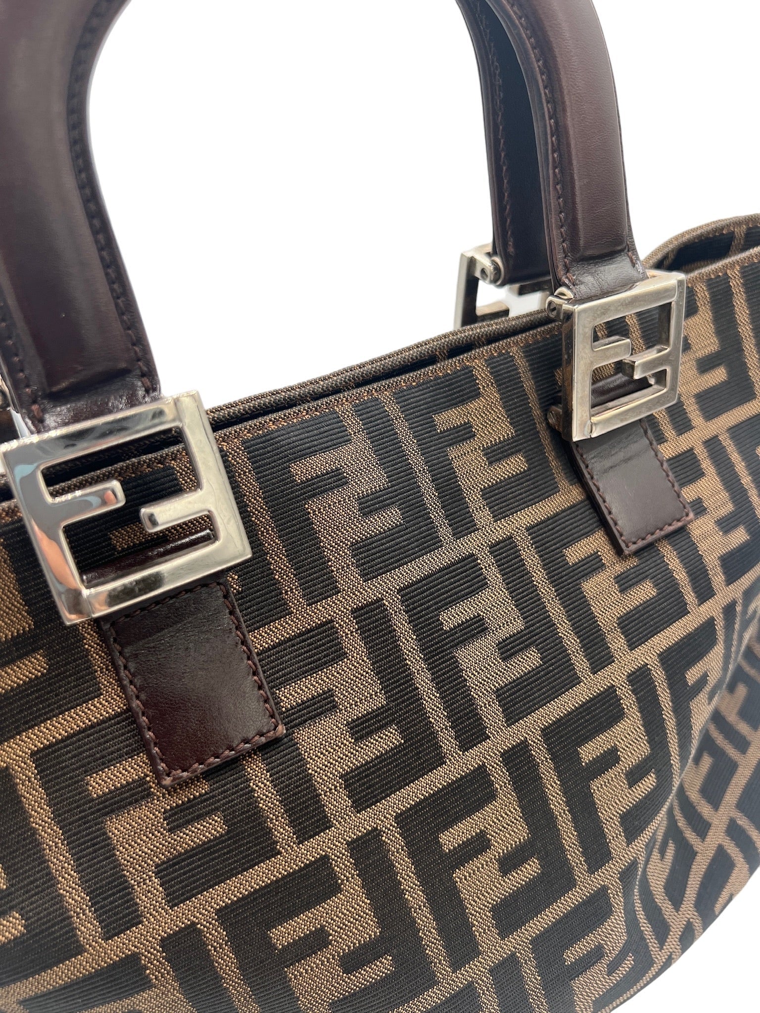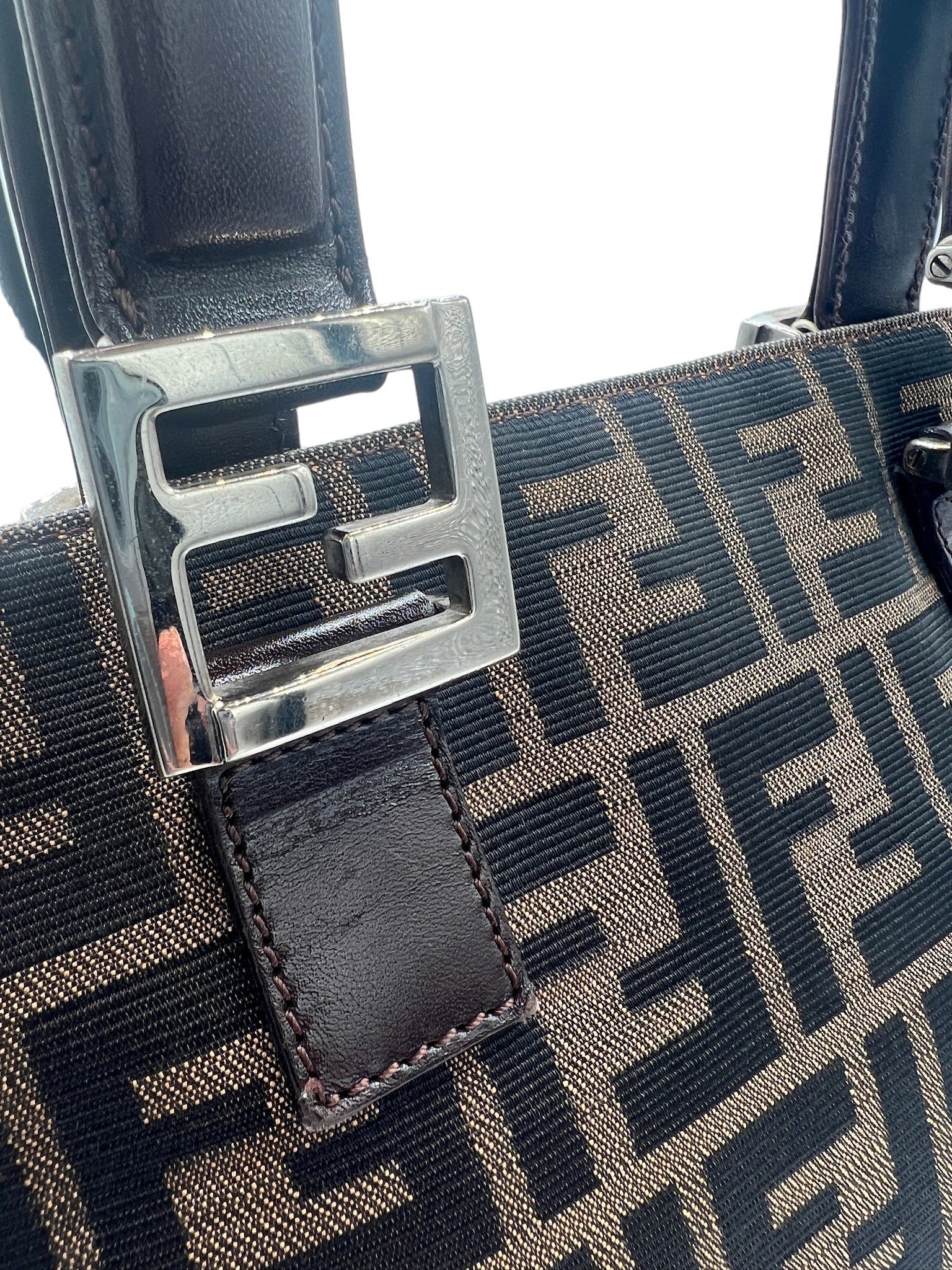 This FENDI Zucca Brown Jacquard Tote Bag is a top handle bag that is perfect for your daily essentials.