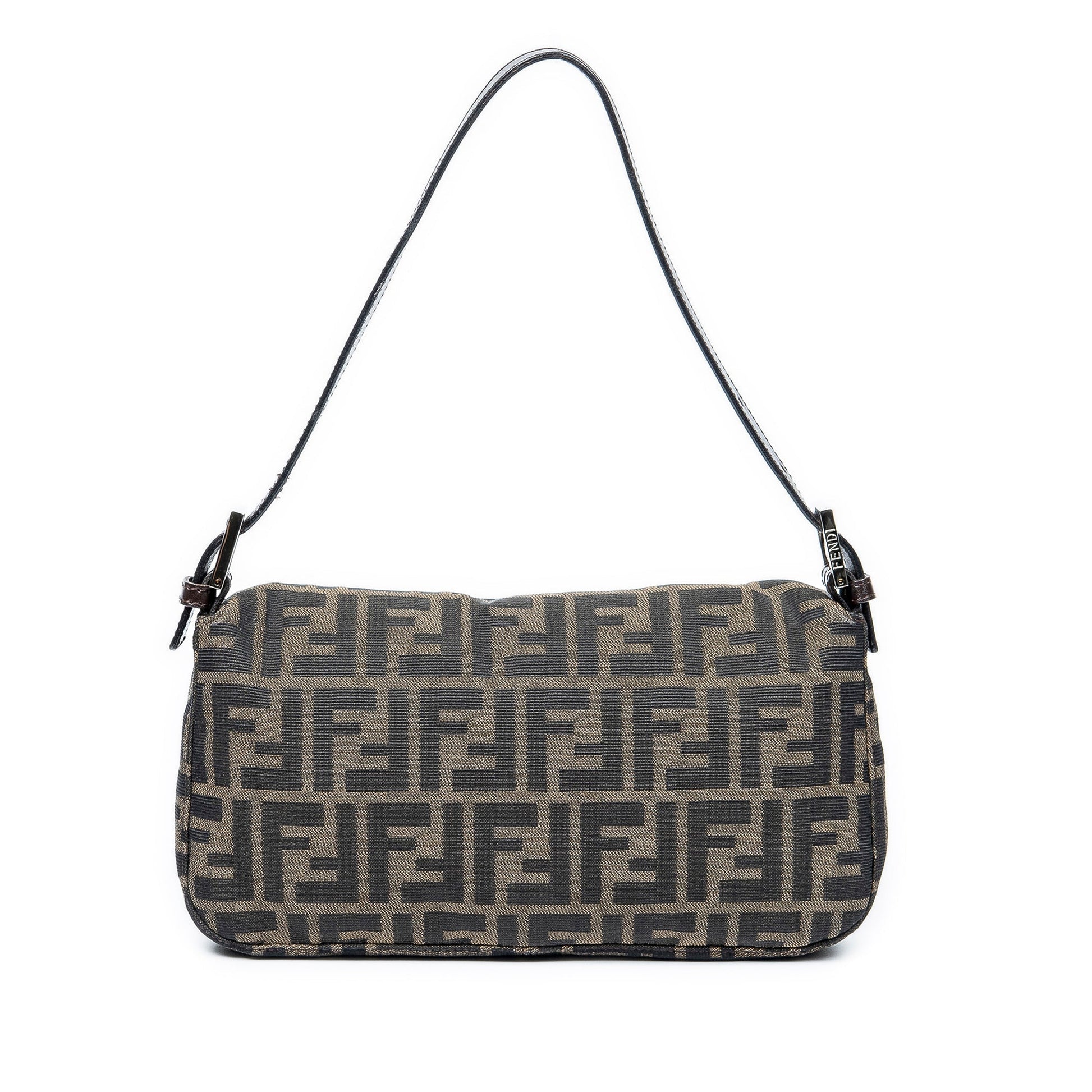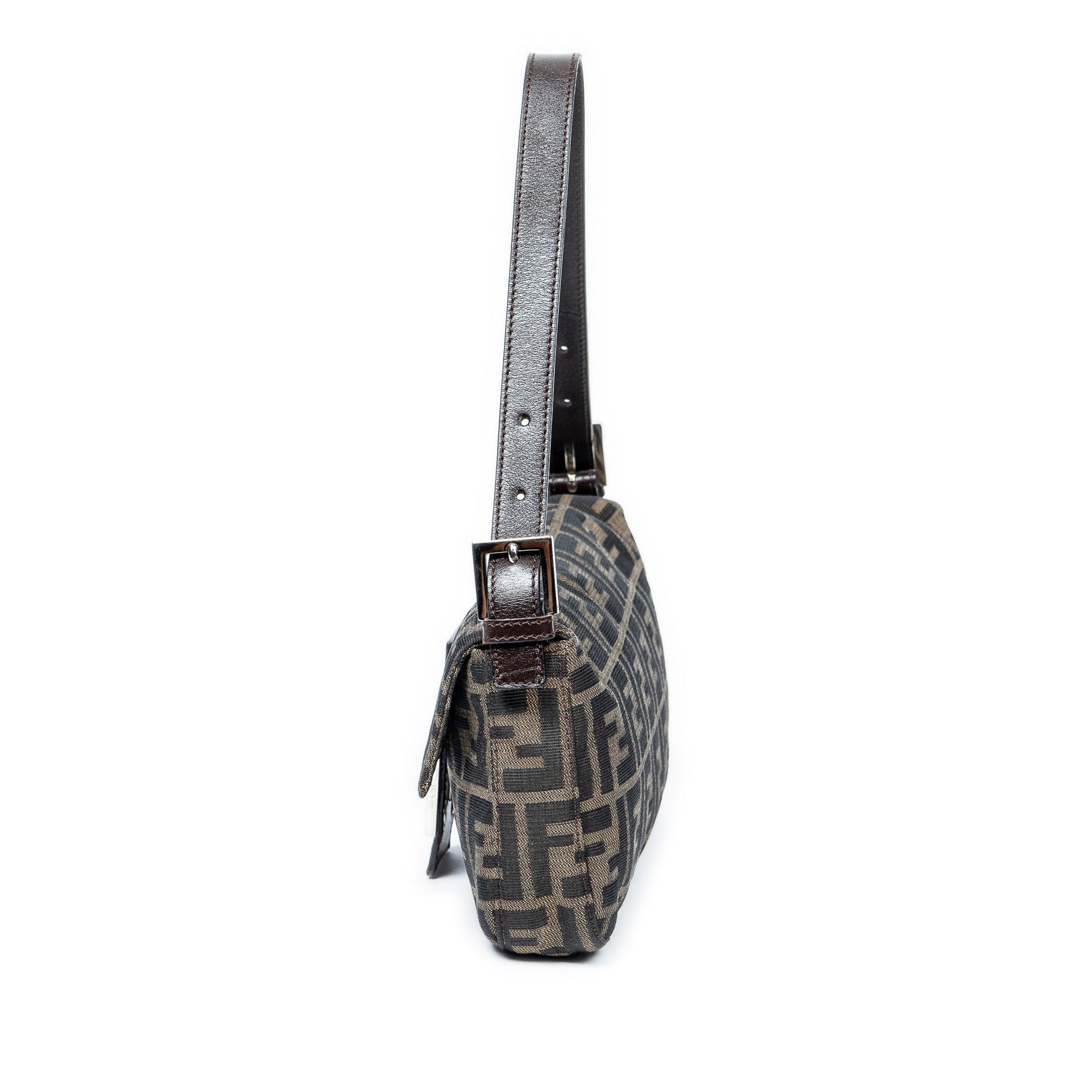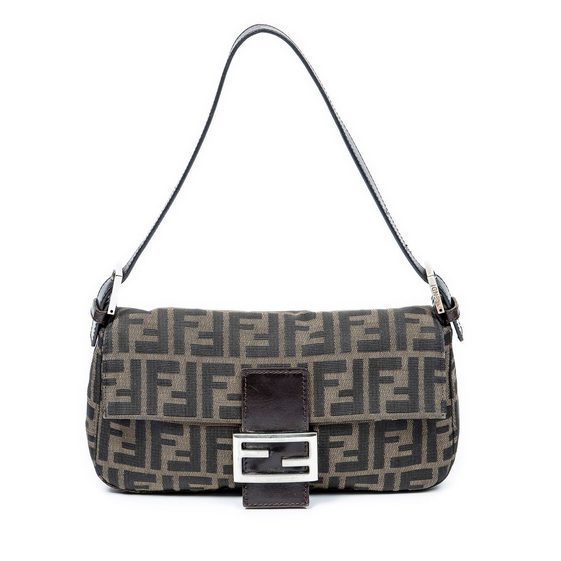 The Mamma baguette features a canvas body, a flat leather strap, a front flap with a flat leather strap and metal hardware, and an interior zip pocket.