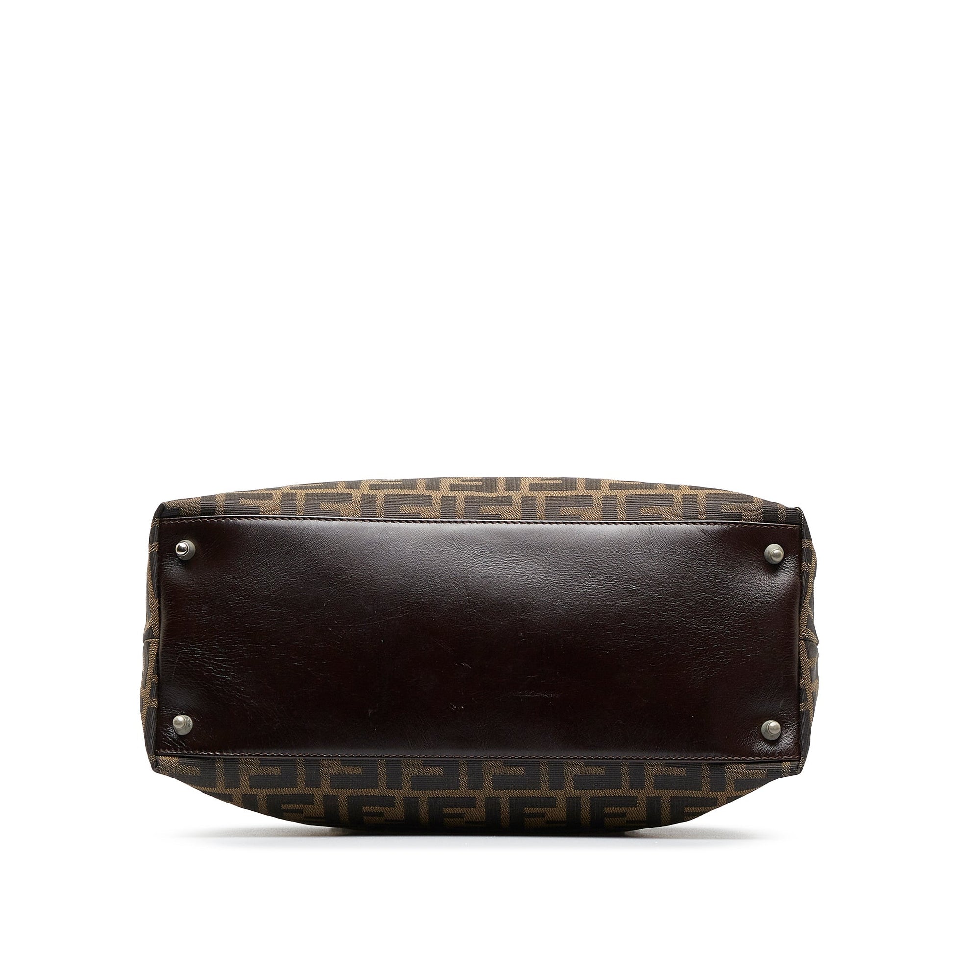 This handbag features a canvas body, rolled leather handles, a top zip closure, and an interior zip pocket.