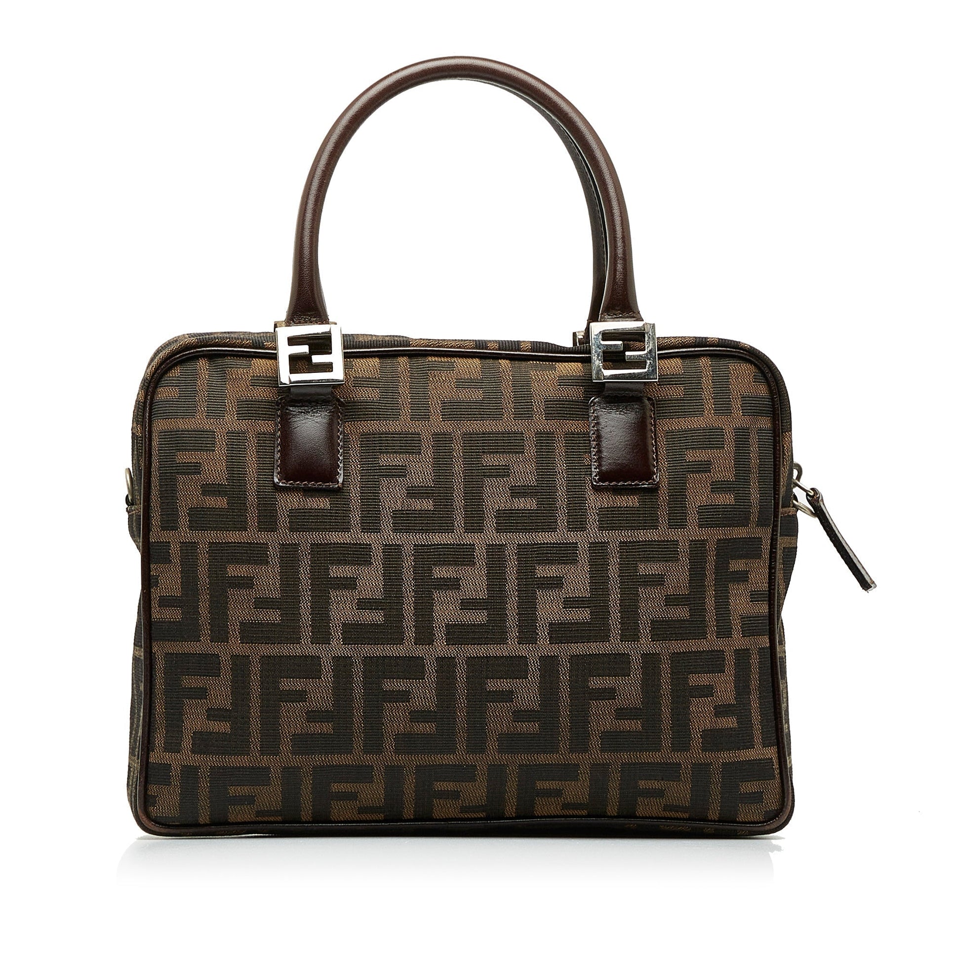 This handbag features a canvas body, rolled leather handles, a top zip closure, and an interior zip pocket.