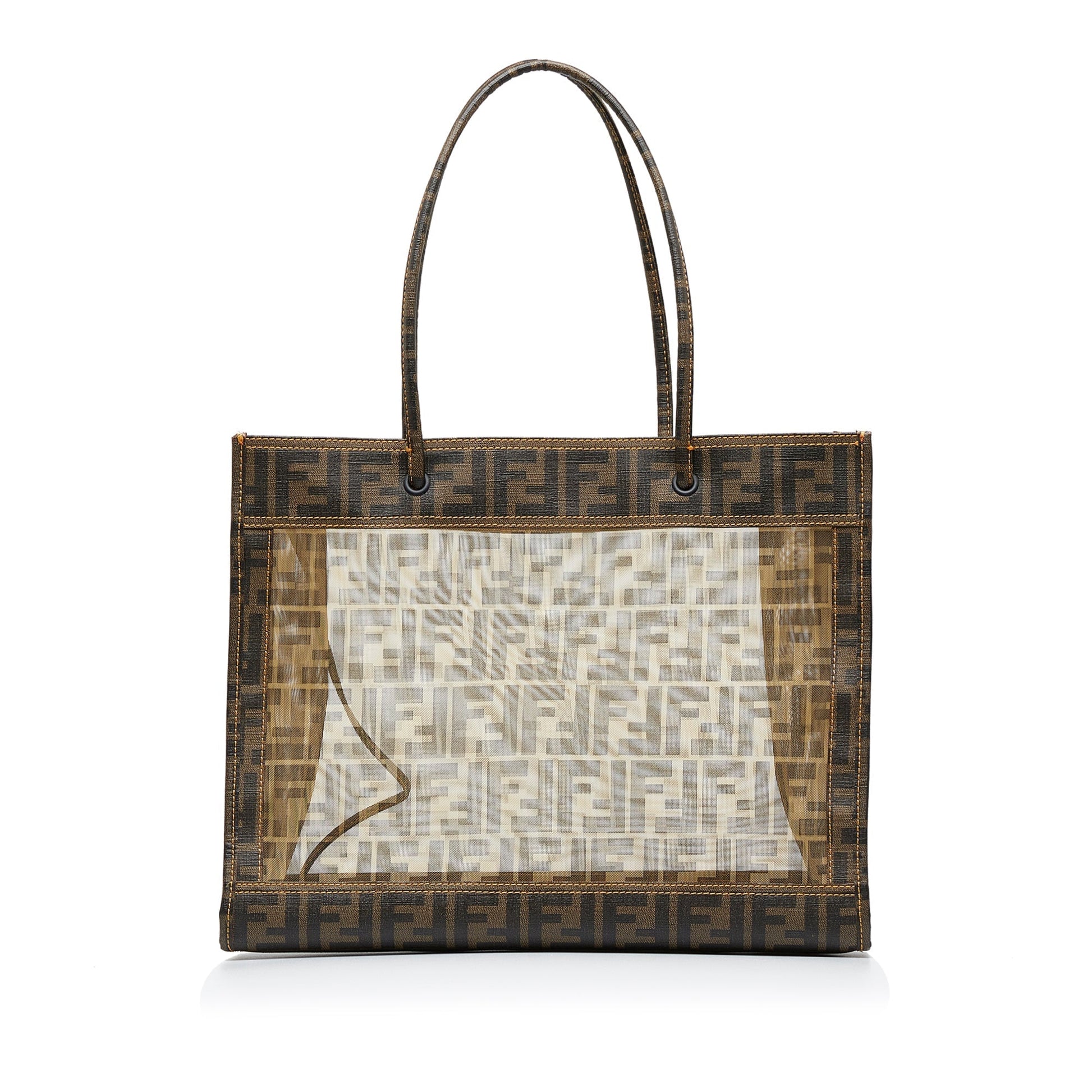 This tote bag features a mesh body with PVC trim, flat straps, and an open top.