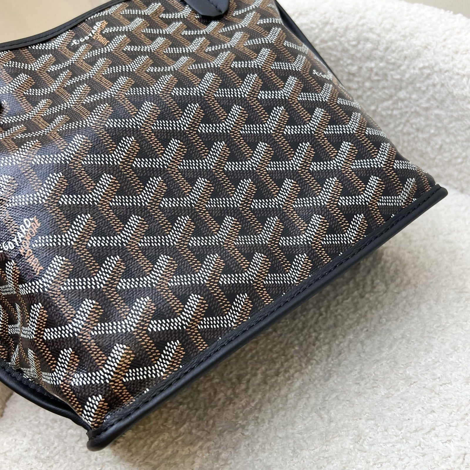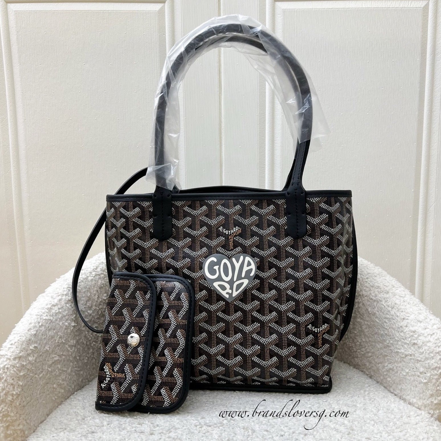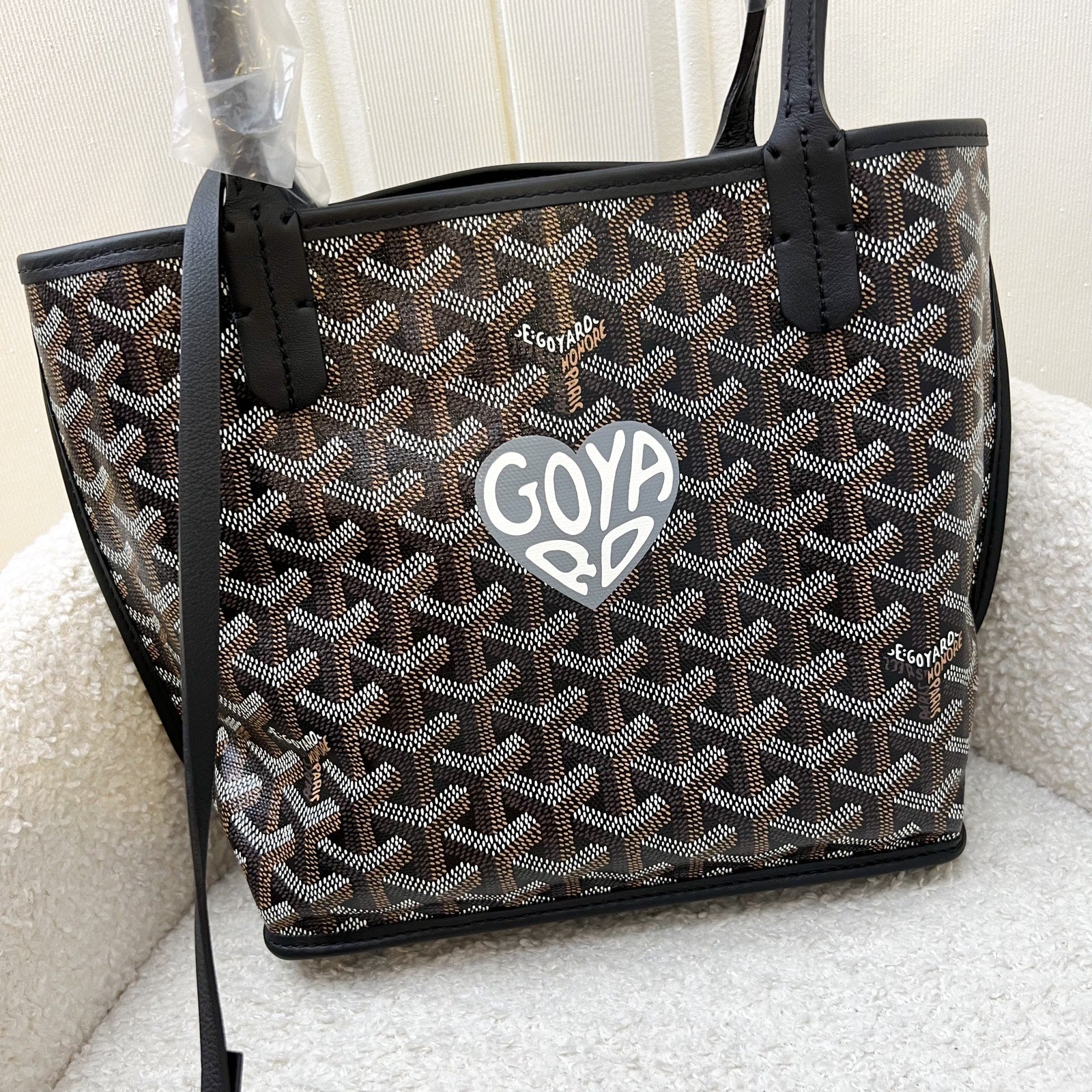 Goyard Mini Anjou Tote Bag in Black Goyardine Canvas and Leather with a Grey Heart Stamp (Premarquage Coeur)