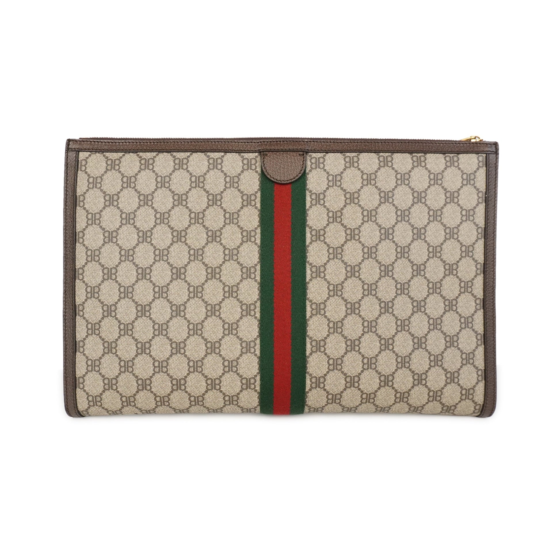 Gucci x Balenciaga 'The Hacker Project Graffiti Laptop Pouch' in beige monogram printed coated canvas with a brown leather trim, a red and green canvas racing stripe, and a black graffiti text graphic across the front. The bag has gold 'BB' logo emblem hardware, a top zip opening, and a black nylon inner lining.
