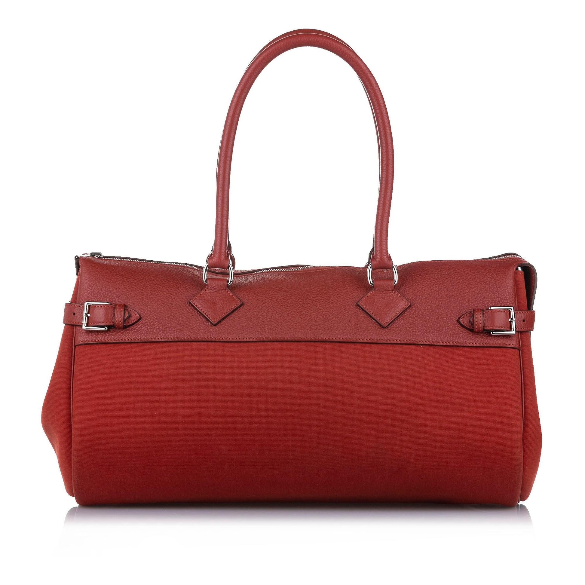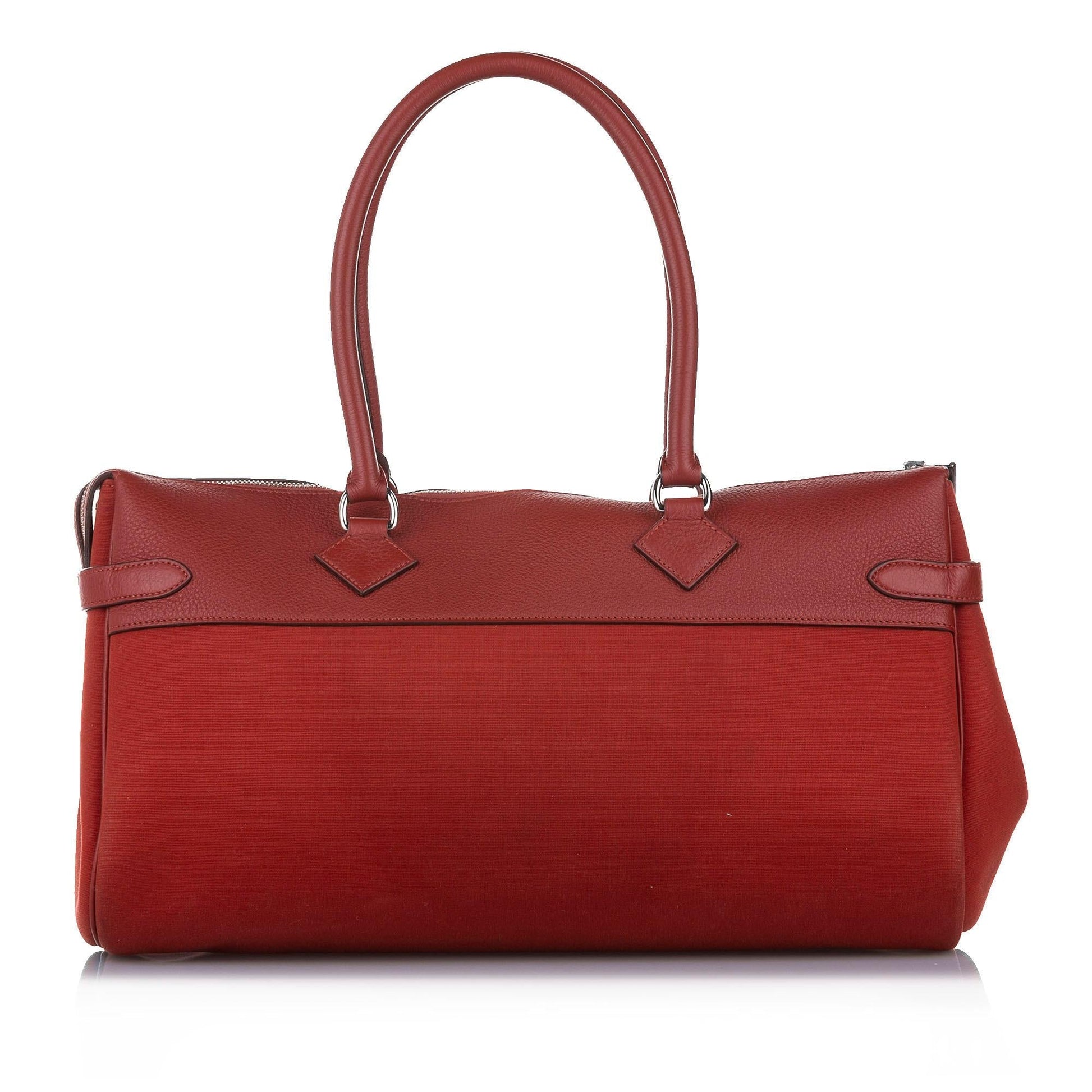 Details: Nothing conveys luxury quite like the high French Fashion HoNew of Hermes. Founded in 1837 as a harness maker, the equestrian-style brand's rich heritage carries on through its traditional 'horse & carriage' logo. The brand’s chief executive designer is Vanhee-Cybulski (2014). Holding the highest of craftsmanship with an assortment of luxurious leathers, each piece from this coveted designer is an exquisite addition to any collection. Condition Notes: Exterior Front Discolored. Exterior Back Discolored, Scratched. Exterior Back stained with Other. Zipper Rusty/Tarnished. Width (at base): 15.5' Height: 8.75' Depth: 6.75' Handle Drop: 11.25' Shoulder Strap Drop: 11.25' Type of Material: Canvas, Calf Color: Orange, Red Origin: Italy