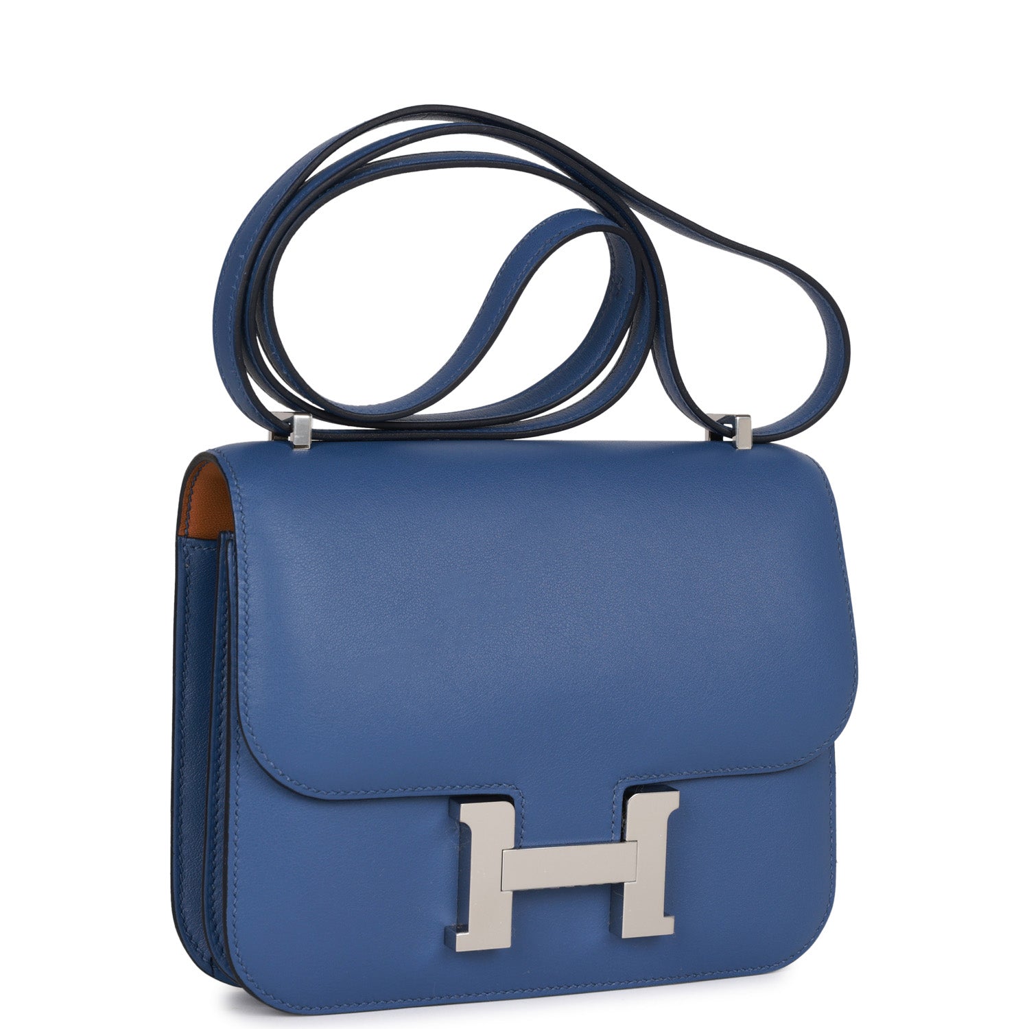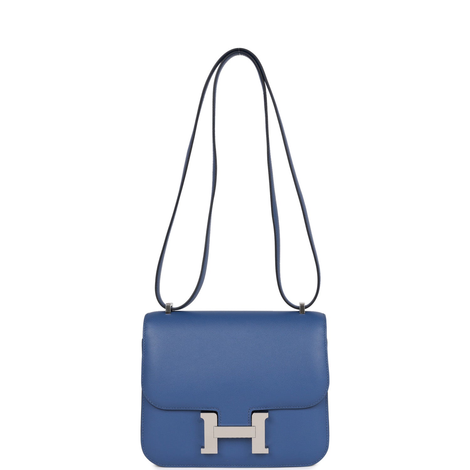 Details: This Constance is in Bleu Brighton evercolor leather with palladium hardware and has tonal stitching, a metal 'H' snap lock closure and adjustable shoulder strap. The interior is lined with Gold lambskin and has an open pocket on the front wall, a center divide, and a slit pocket on the back wall. Collection: U Origin: France Condition: Pristine; new or never New (plastic on hardware) Accompanied by: Hermes box, Hermes dustbag, carebook, felt and ribbon Measurements: 7.25' width x 6.25' height x 2.25' depth; 20' adjustable shoulder strap