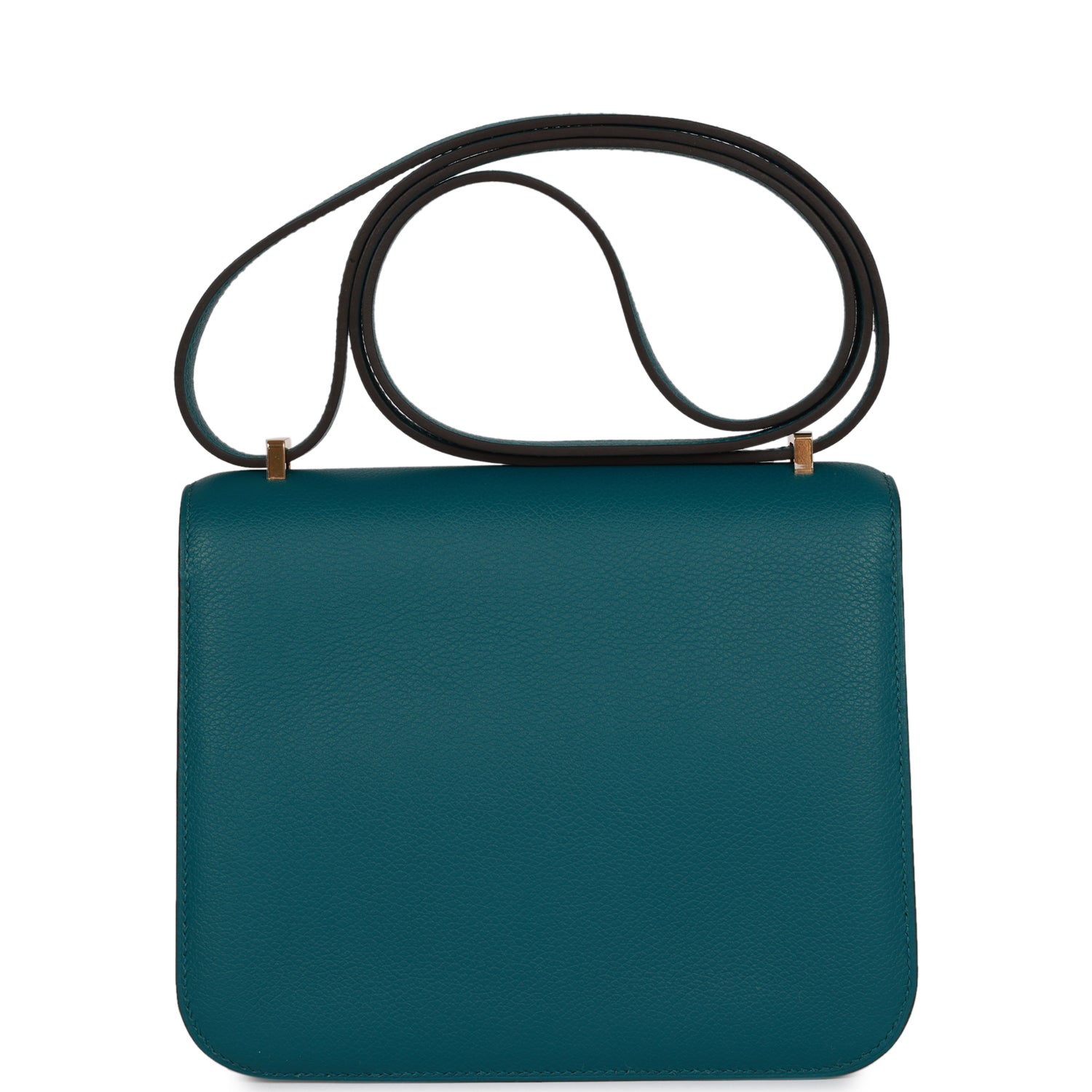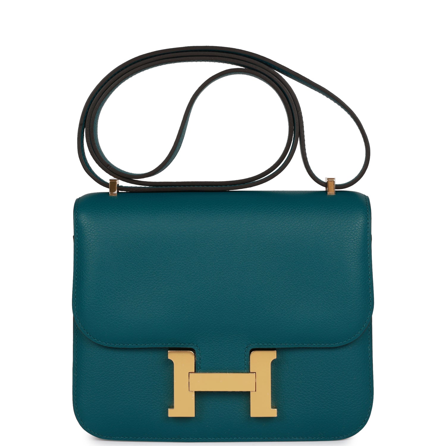 Details: This Constance is in Vert Bosphore evercolor leather with gold hardware and has tonal stitching, a metal 'H' snap lock closure and adjustable shoulder strap. The interior is lined with Vert Bosphore lambskin and has an open pocket on the front wall, a center divide, and a slit pocket on the back wall. Accompanied by: Hermes box, Hermes dustbag, Measurements: 7.25' width x 6.25' height x 2.25' depth; 20' adjustable shoulder strap