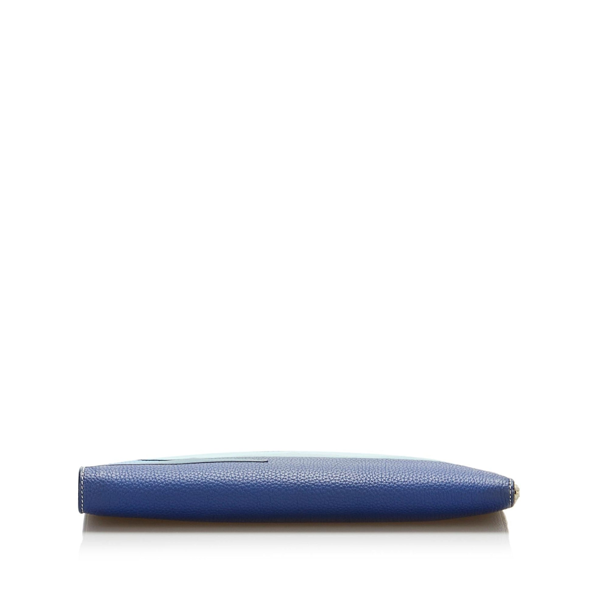 Details: Nothing conveys luxury quite like the high French Fashion HoNew of Hermes. Founded in 1837 as a harness maker, the equestrian-style brand's rich heritage carries on through its traditional 'horse & carriage' logo. The brand’s chief executive designer is Vanhee-Cybulski (2014). Holding the highest of craftsmanship with an assortment of luxurious leathers, each piece from this coveted designer is an exquisite addition to any collection. Condition Notes: Exterior Corners New. Exterior Side stained with Other. Exterior Top New. Interior Lining Discolored. Interior Lining stained with Other. Zipper Rusty/Tarnished, Scratched. Width (at base): 11.25' Height: 8' Depth: 1' Type of Material: Calf Color: Blue Origin: France
