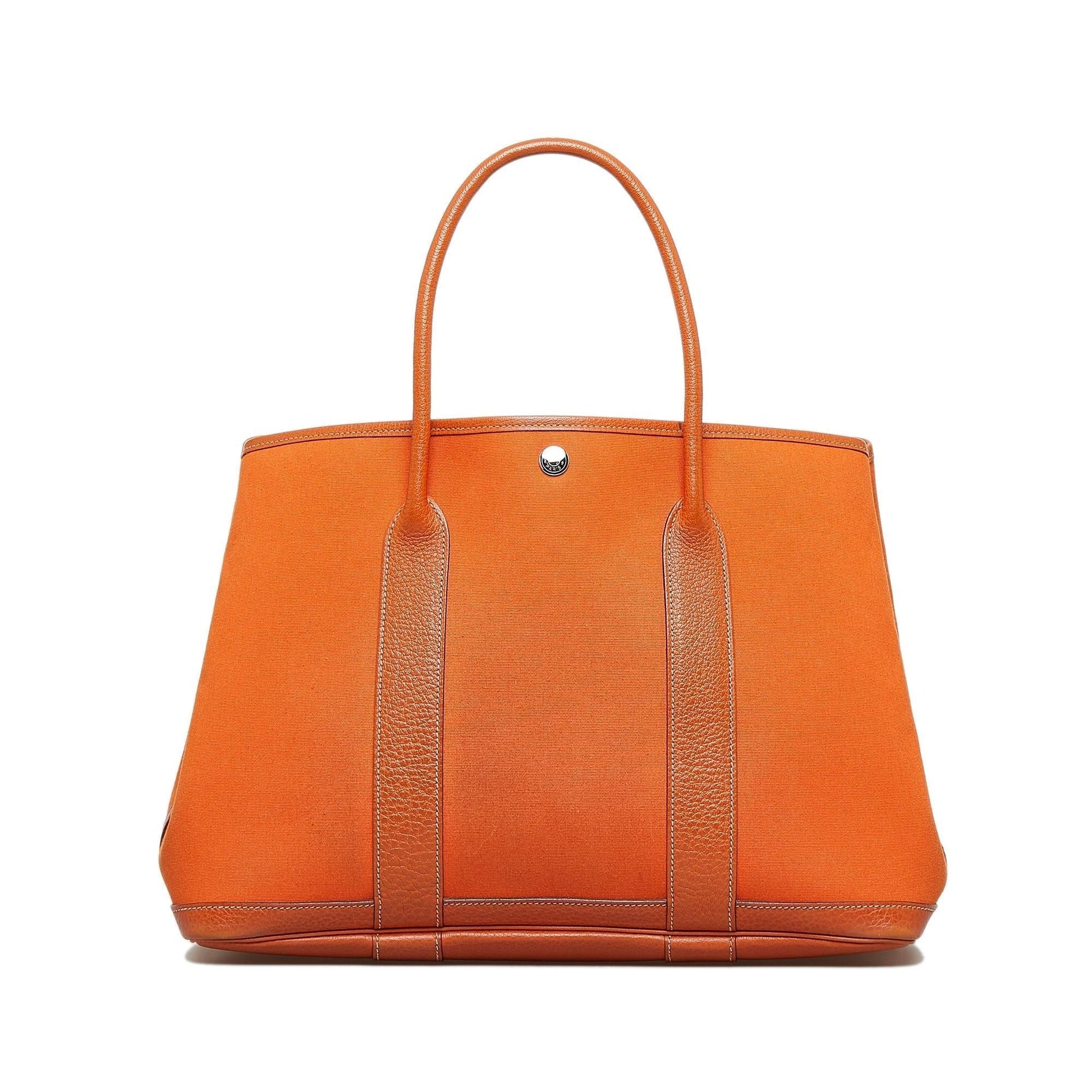 Details: Nothing conveys luxury quite like the high French Fashion HoNew of Hermes. Founded in 1837 as a harness maker, the equestrian-style brand's rich heritage carries on through its traditional 'horse & carriage' logo. The brand’s chief executive designer is Vanhee-Cybulski (2014). Holding the highest of craftsmanship with an assortment of luxurious leathers, each piece from this coveted designer is an exquisite addition to any collection. Condition Notes: Exterior Front Discolored, Out Of Shape. Exterior Front stained with Other. Exterior Back Discolored, Out Of Shape. Exterior Handle Discolored, Out Of Shape, New. Exterior Corners New. Exterior Side Discolored, Out Of Shape, New. Interior Lining Discolored. Width (at base): 14' Height: 10.25' Depth: 6.5' Handle Drop: 7' Shoulder Strap Drop: 7' Type of Material: Calf, Canvas Color: Orange Origin: France
