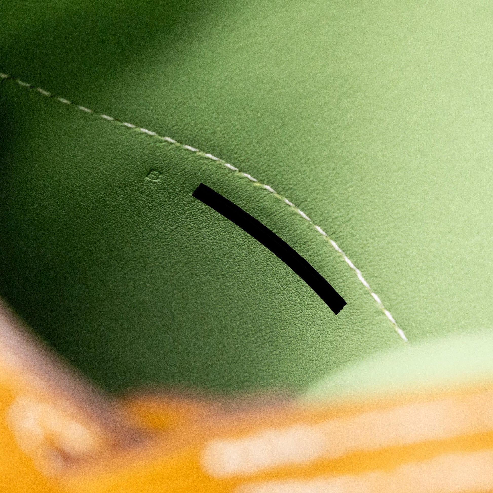 Details: Condition: 10/10 Unused ( This item is in unused and New condition. ) Material: Chevre Mysore Leather Colour : Caramel / Vert Criquet Measurement: Width: 12 cm Height: 20.5 cm Stamp: B (2023) Inclusion: Box, Copy of Receipt
