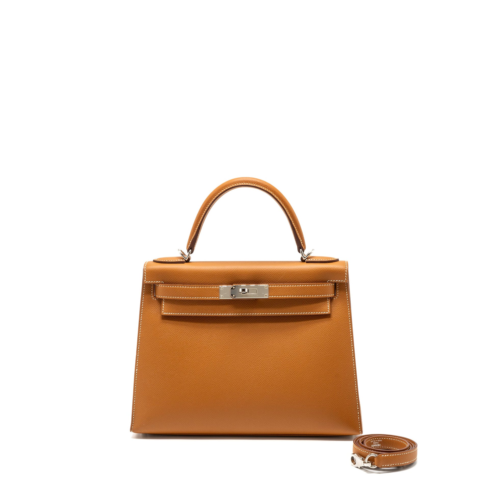 Details: Condition : 9.9/10 New ( This item is in New with m inor scratches on turnkey hardware.) Colour: Gold Hardware: Sliver Tone Measurement: Length: 28 cm Height: 22 cm Depth: 10 cm Handle: 8 cm Strap: ~45.5 cm Material : Epsom Leather Stamp: Y (2020) Origin : France Inclusion: Dust Bag, Box, Lock and Key Set, Copy of Receipt