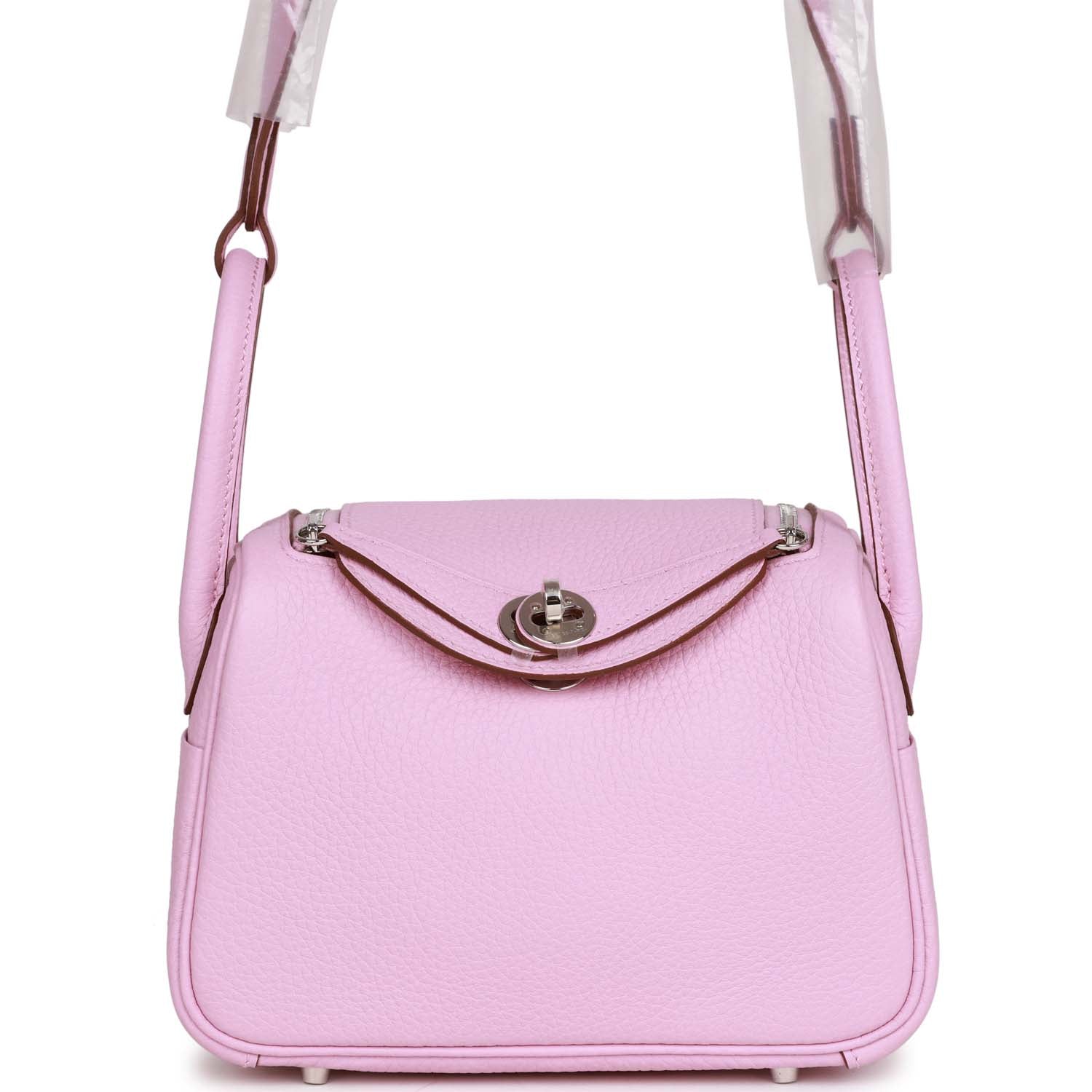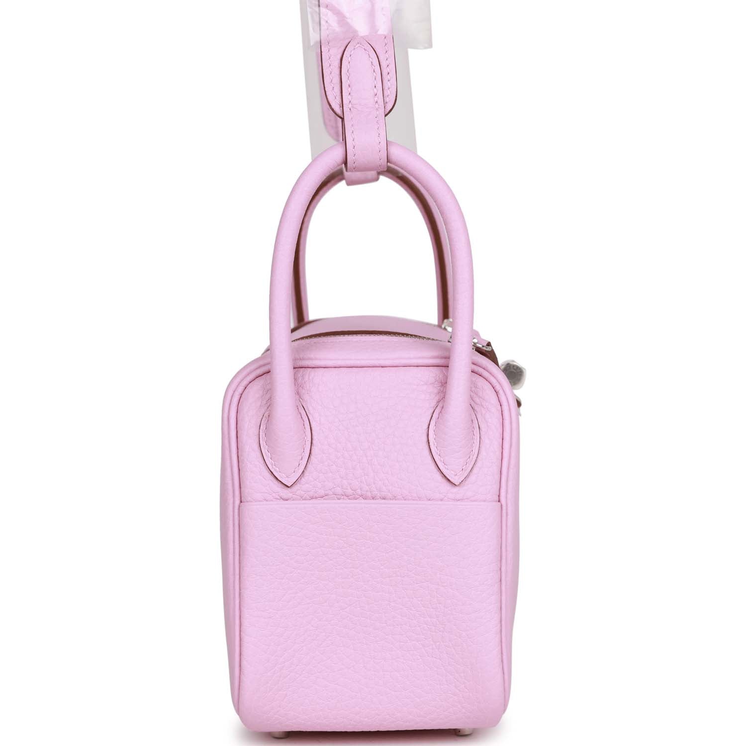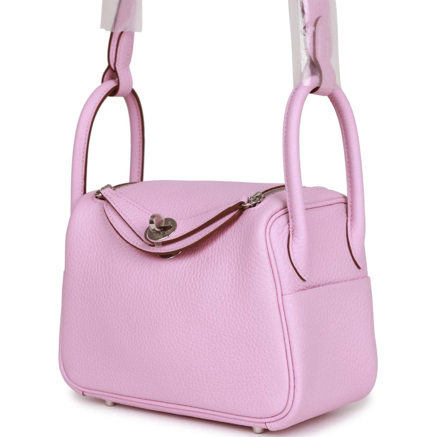 Details: This Mini Lindy is in Mauve Sylvestre clemence leather with palladium hardware and has tonal stitching, double zipper pulls, front Hermès twist lock, single pocket on each side, two rolled top handles linked by a flat shoulder strap. The interior is lined with Mauve Sylvestre leather and has one pocket on each side. Collection: U Origin: France Condition: New and never New (plastic on hardware) Accompanied by: Hermes box, Hermes dustbag, felt, carebook, rainhat, and ribbon Measurements: 7.5' width x 5' height x 3.75' depth; strap 22' drop