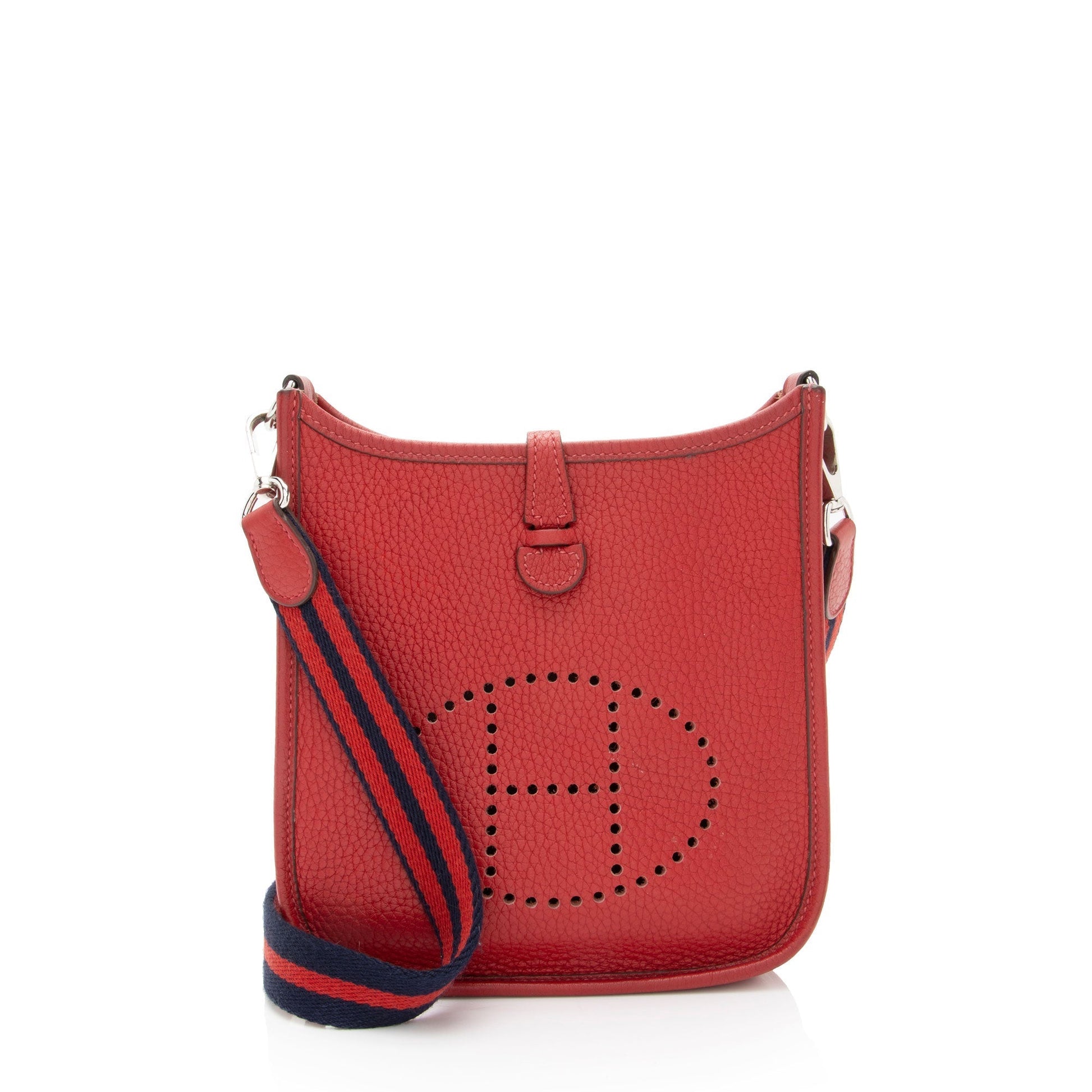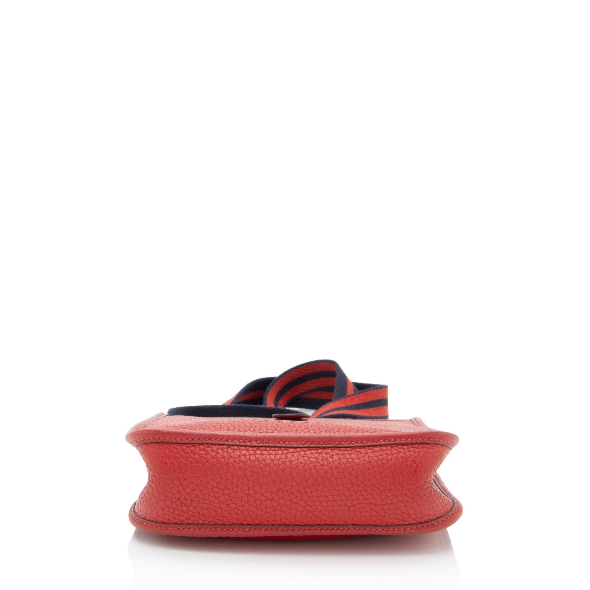 Details: Nothing conveys luxury quite like the high French Fashion HoNew of Hermes. Founded in 1837 as a harness maker, the equestrian-style brand's rich heritage carries on through its traditional 'horse & carriage' logo. The brand’s chief executive designer is Vanhee-Cybulski (2014). Holding the highest of craftsmanship with an assortment of luxurious leathers, each piece from this coveted designer is an exquisite addition to any collection. Condition Notes: Darkening, marks, and minor scuffs throughout exterior edges and corners. Visible wear to exterior top corners. Light pilling throughout shoulder strap. Surface scratches to hardware. Marks, darkening, and wear throughout interior. Width (at base): 6.75' Height: 7.5' Depth: 2' Shoulder Strap Drop: 23' Type of Material: Baby Bull Leather, Nylon Color: Red Lining: No Lining Pockets: None Hardware: Palladium Closure: Slide Tab, Snap Origin: France Includes: Detachable Shoulder Strap