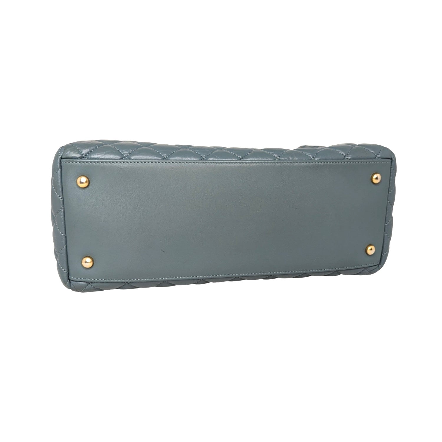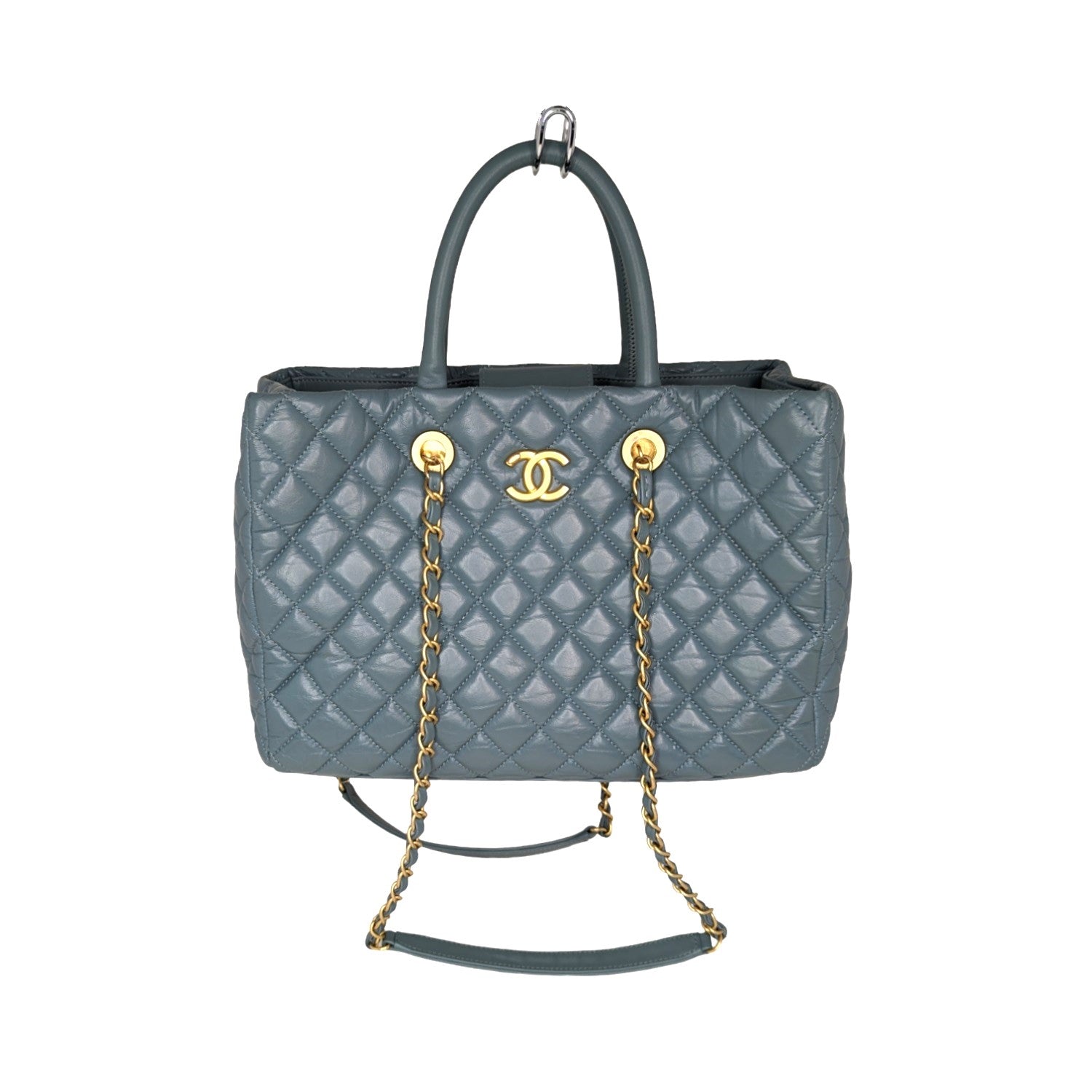 Chanel Coco Allure Shopping Bag is crafted of diamond quilted blue aged Calfskin leather with aged gold-tone hardware. It features chain and leather threaded shoulder straps, dual rolled top handles, gold Chanel CC logo on the front, an exterior patch pocket. Snap closure at top that opens to a blue interior lining with zipper, patch pockets, and a removable central zipper pouch.
