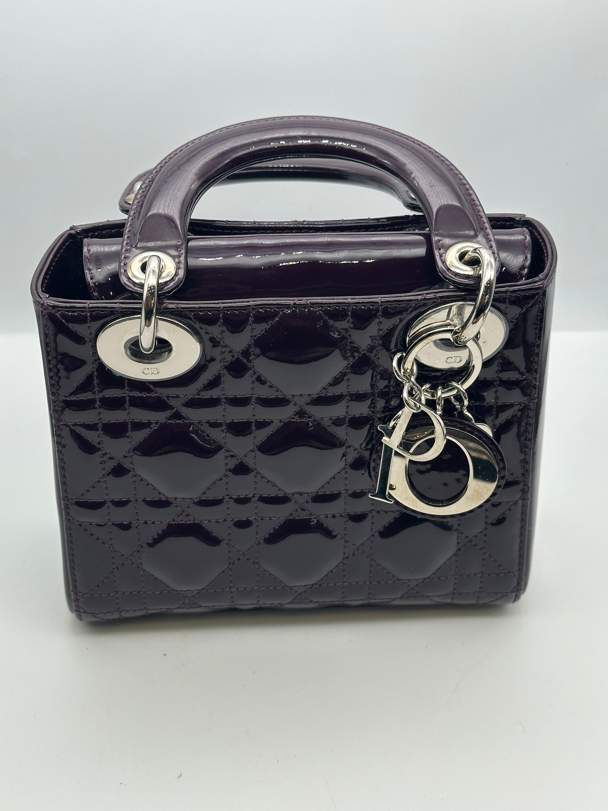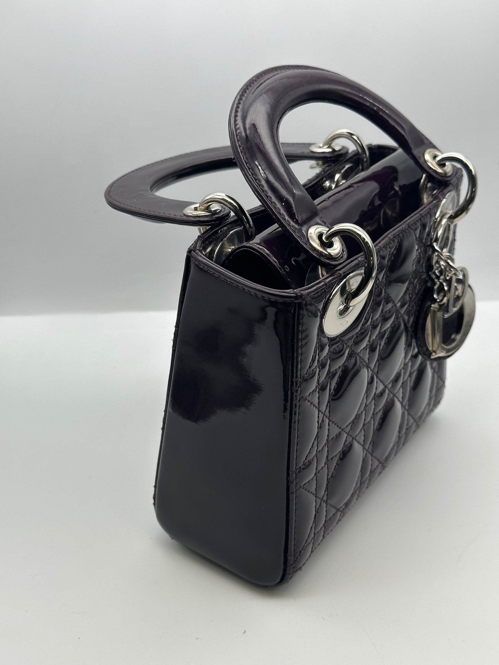 This beautiful mini Lady Dior handbag has silver hardware and a patent aubergine in colour, the perfect bag to take you through all seasons