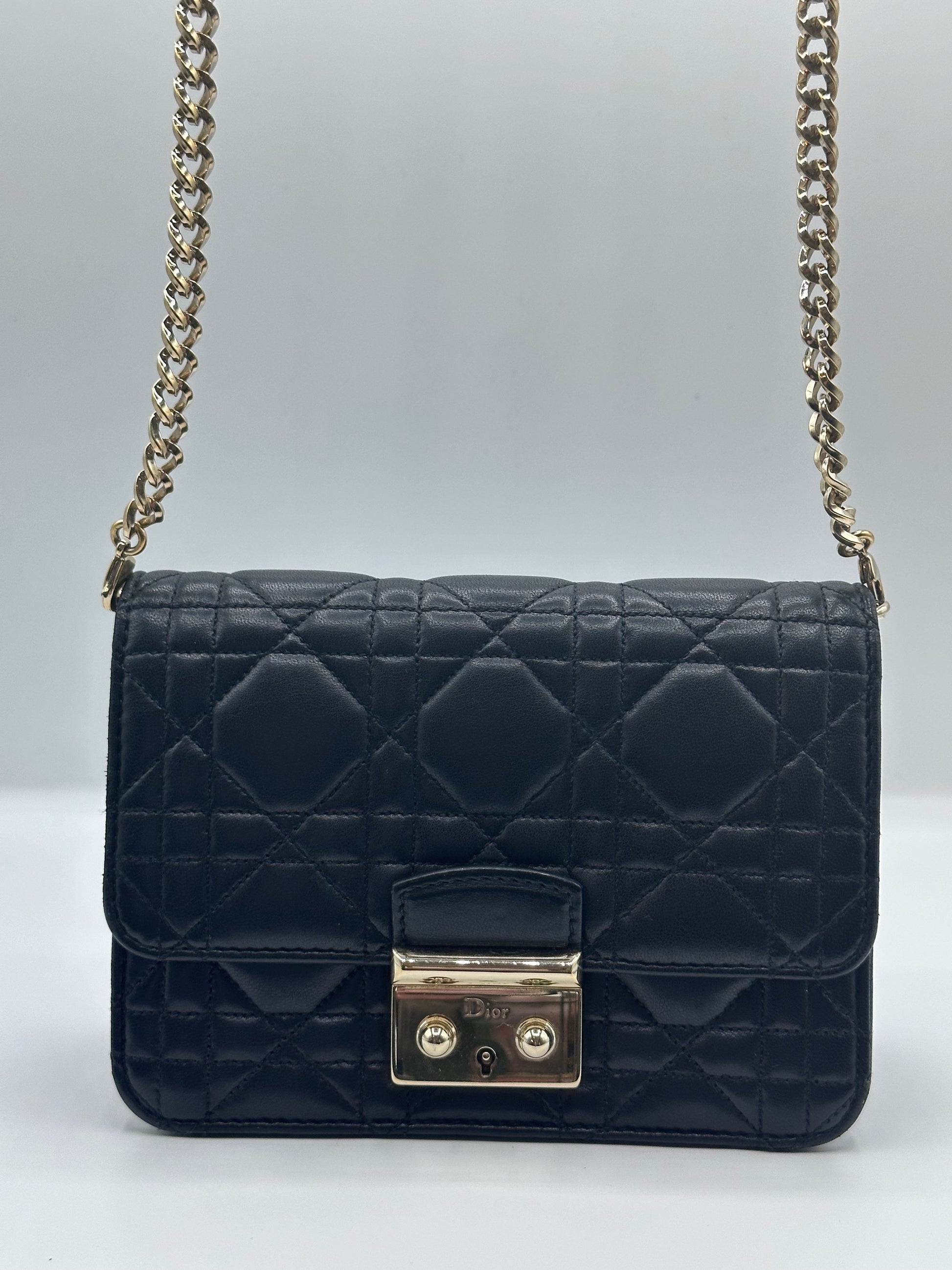 Miss dior black lambskin cannage side bag with gold hardware. This Miss Dior Flap Baghas just dropped! The perfect accessory for street styling, worn with leather leggings or a dress, your look will be a strong one!