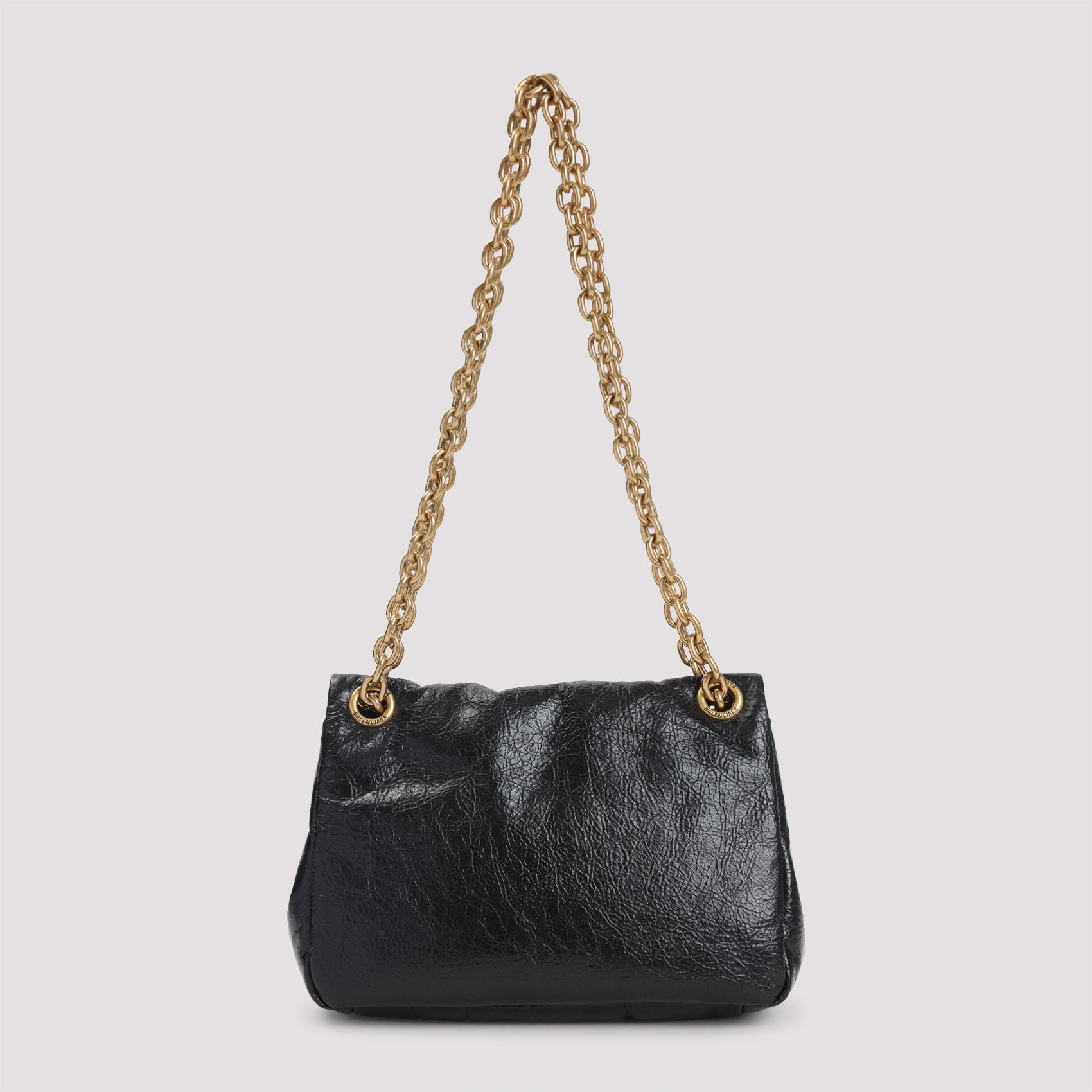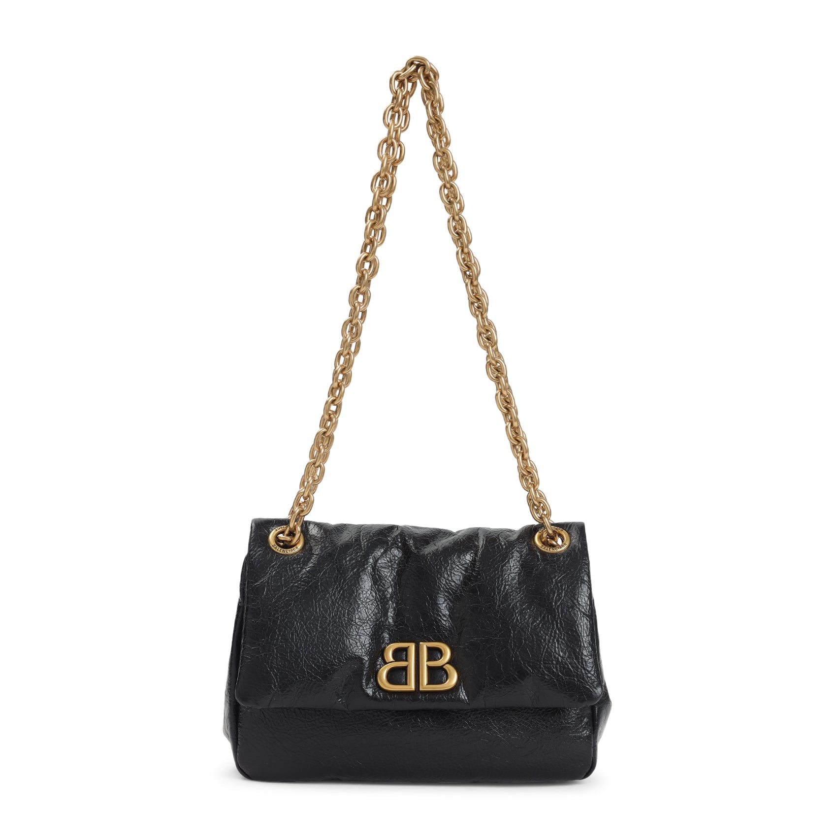 Balenciaga Black Calf Leather Monaco Mini Bag. Pure black calf leather mini bag, top gold-tone metallic chain shoulder strap, front flap fastening, front gold-tone metallic signature BB logo, one main compartment. Gold-tone hardware. Leather | 100%CALF LEATHER W:22cm H:15cm D:8cm