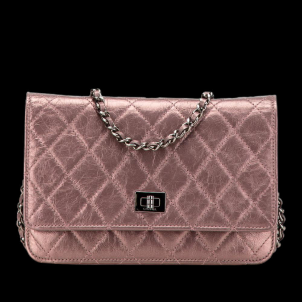 The Metallic 2.55 Reissue Wallet on Chain features quilted aged calfskin leather body, a leather woven chain strap, front single flap with a metal twist lock closure, an exterior back slip pocket, an interior zip compartment, and interior card slots. It carries a B+ condition rating.Exterior Back Out Of Shape. Exterior Bottom Worn. Lock Scratched. Exterior Corners Worn. Exterior Front Out Of Shape, Worn. Exterior Handle Worn. Interior Lining stained with Other. Practical Attachment Scratched. Exterior Top Worn. Zipper Scratched. Dimensions:Length 19cmWidth 3cmHeight 13cmShoulder Drop 63cmOriginal Accessories: This item has no other original accessories.Serial Number: 12497024Color: Pink x Rose GoldMaterial: Leather x Calf
