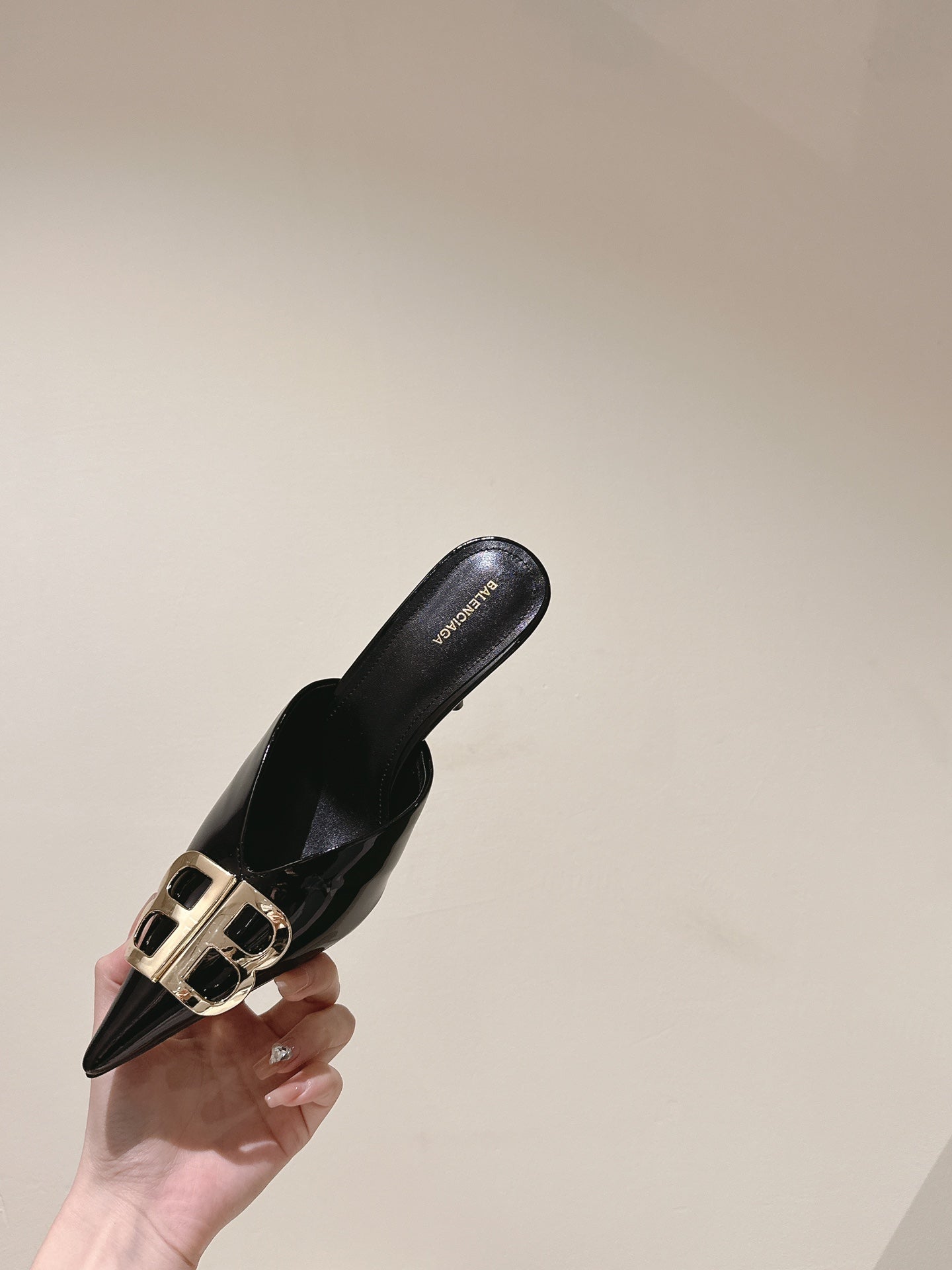 Balanciaga POINTED BB GOLD BUCKLE HIGH MULES IN BLACK PATENT CALFSKIN