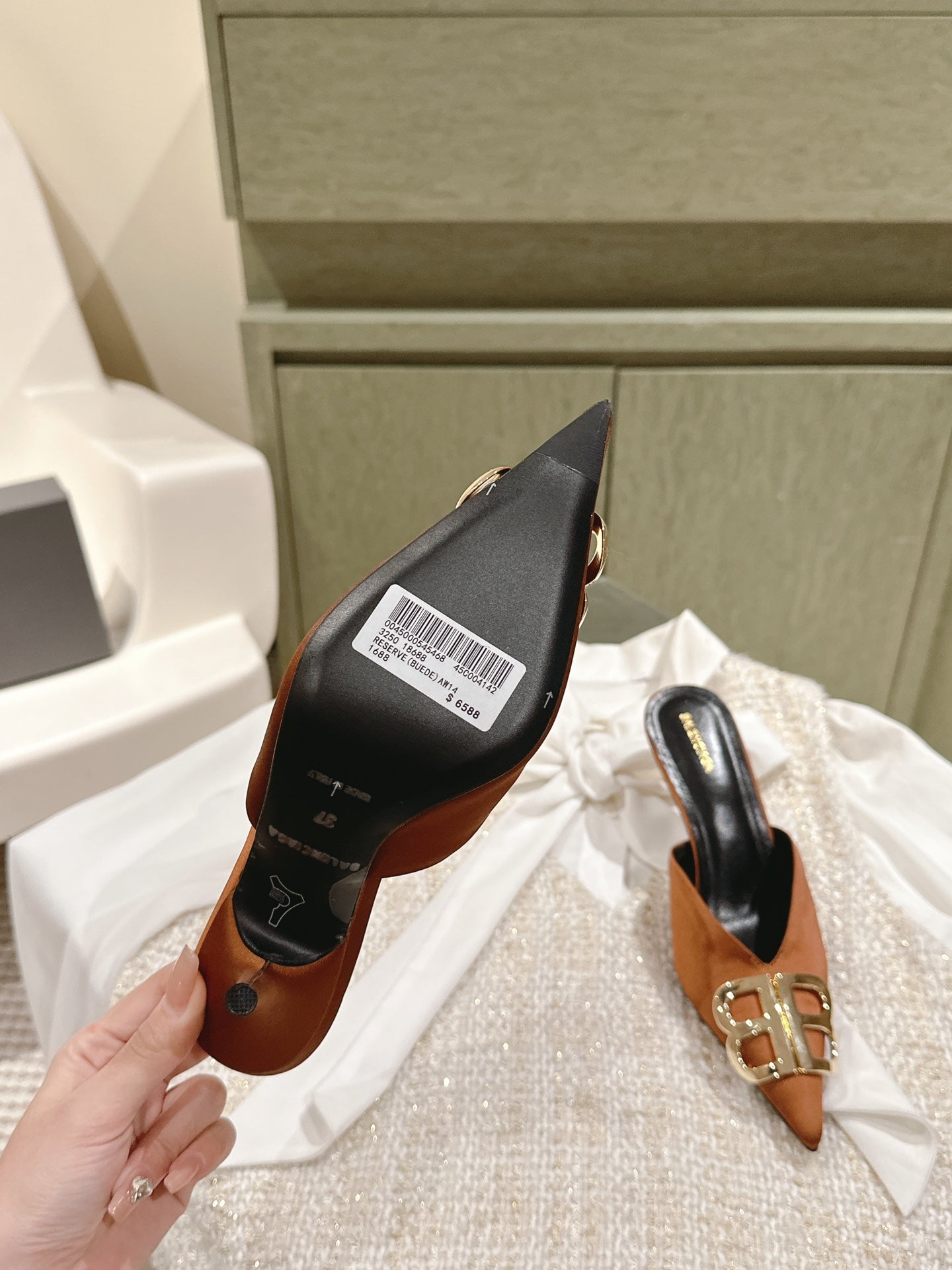 Balanciaga POINTED BB GOLD BUCKLE HIGH MULES IN BROWN RUST SILK
