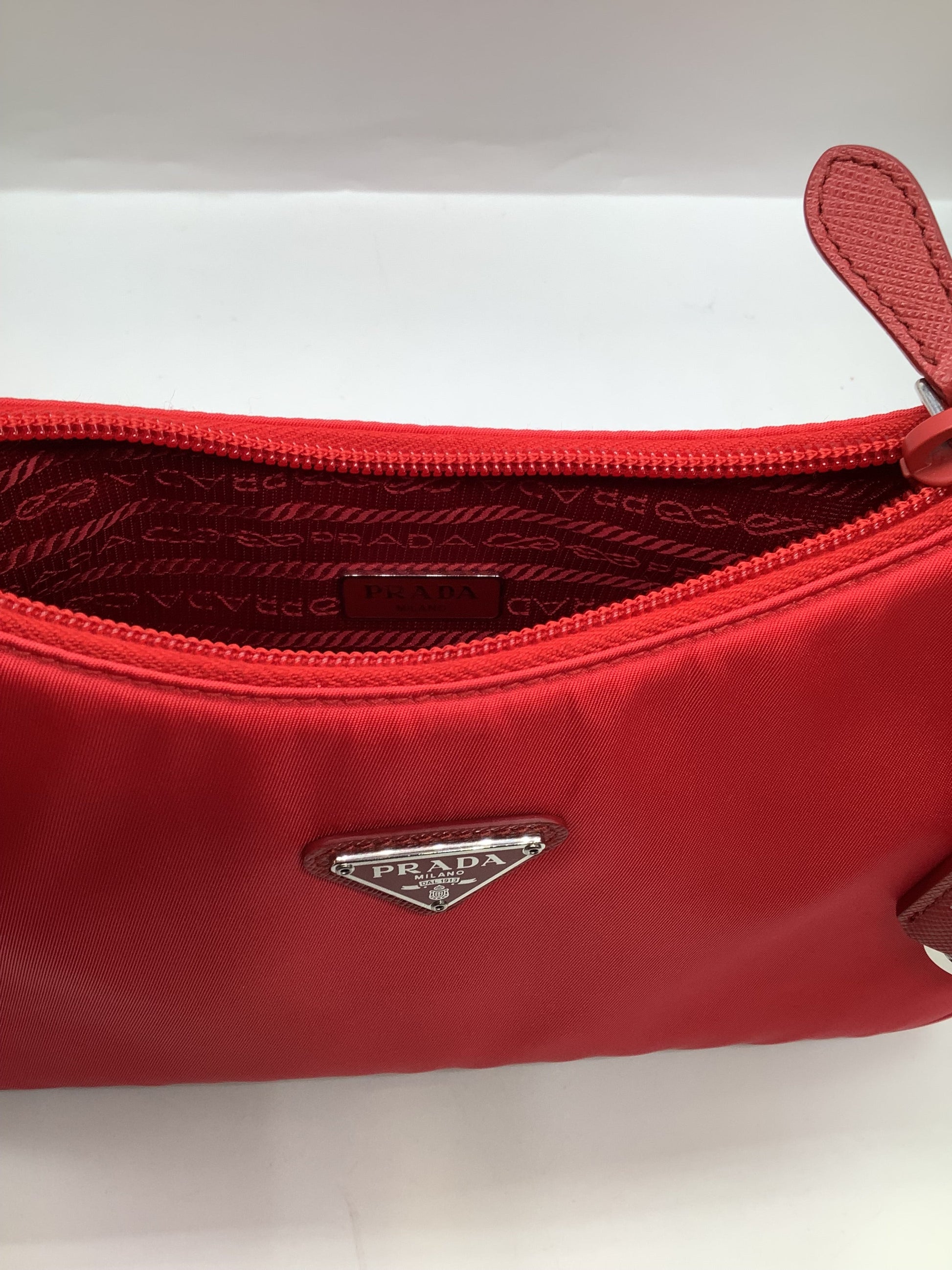 Hardware: Accented with silver-tone hardware, including the iconic Prada triangle logo on the front.
