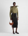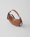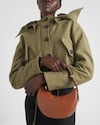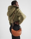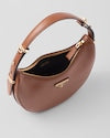 This sleek leather bag has a versatile, modernist allure. The accessory with a sinuous silhouette is completed by the leather extension and detachable shoulder strap for wearing different ways. The bag with nappa leather interior and metal hardware is embellished with the enameled metal triangle logo on the front.